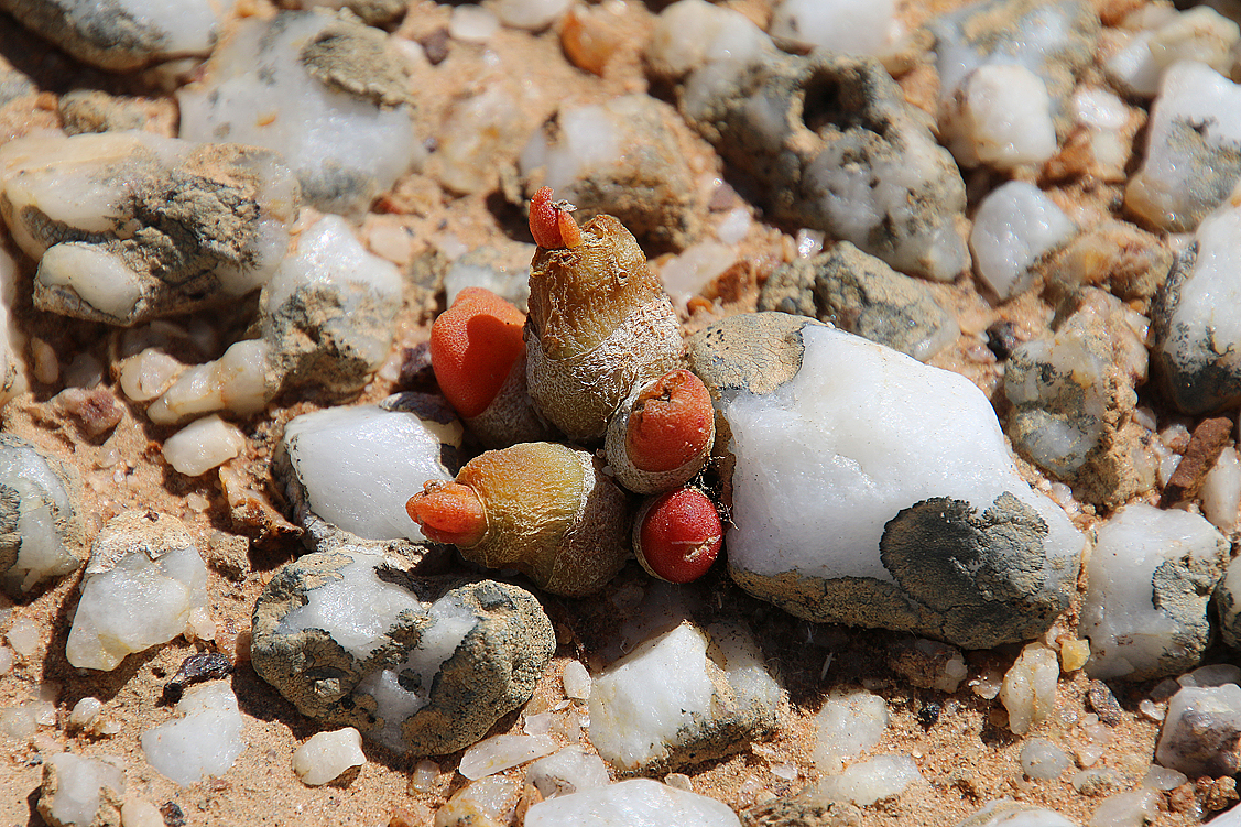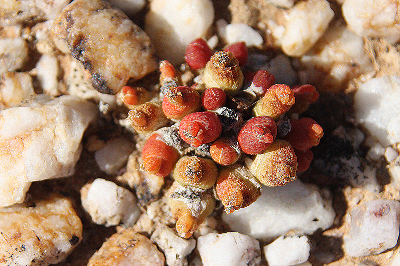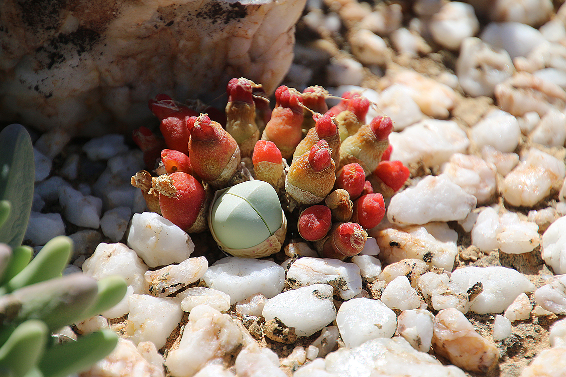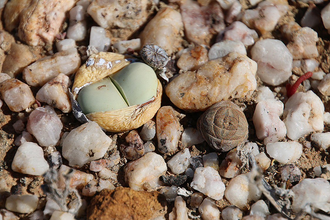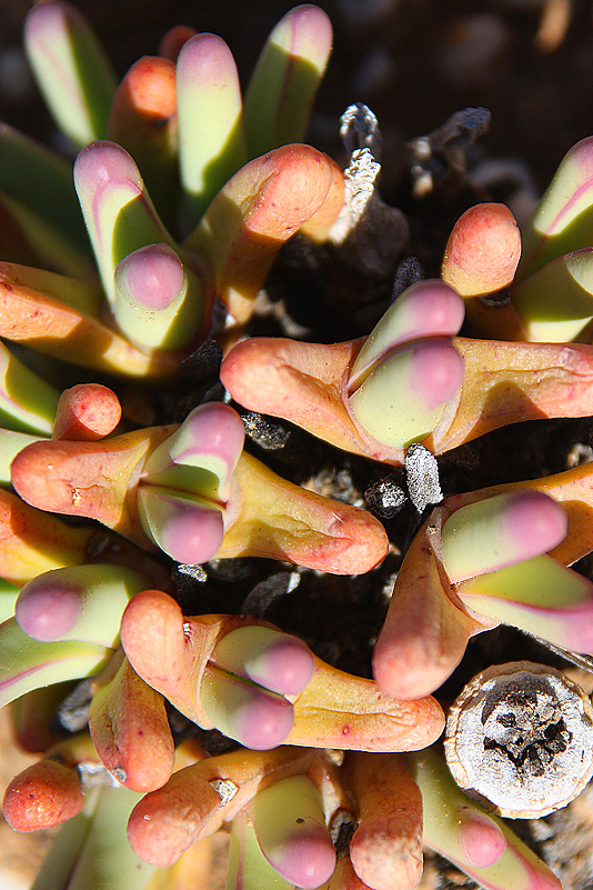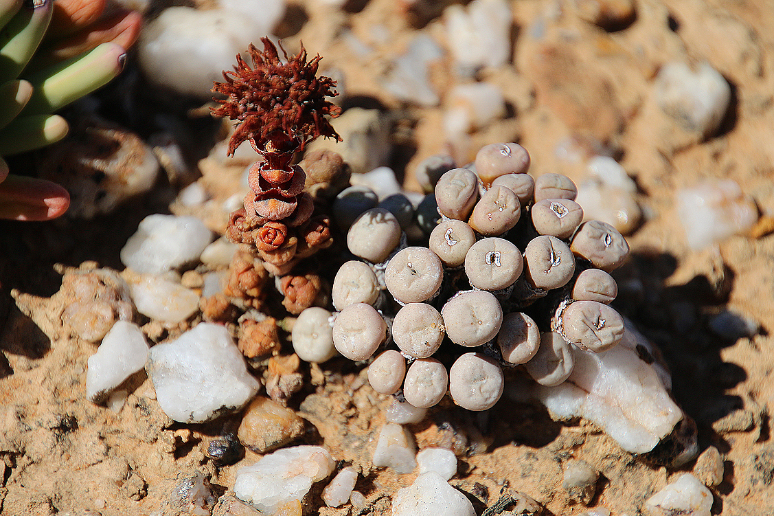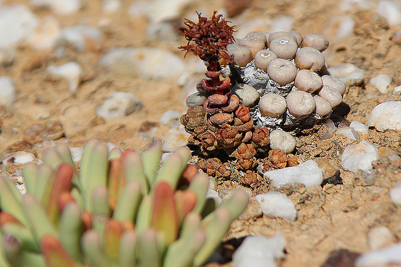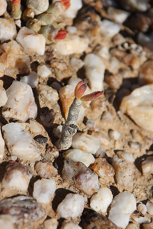 Mei, ist das schön, all die alten Bekannten, sprich Pflanzen, wiederzusehen. Leider ist zwar auch heuer kein Blütenmeer in Sicht, dafür sind wir einfach zu spät dran, aber trotzdem gibt es viel zu entdecken. Viele Pflanzen, die letztes Jahr schon „geschlafen“ hatten, also bis auf kaum sichtbare Reste auf Bodenniveau eingeschrumpelt waren, strotzen heuer prall, frisch und in den schönsten Farben. Da ist zum Beispiel Oophytum nanum, dessen zweigeteilte Blätter in allen Rottönen leuchten, winzige Tylecodons mit braunroter Belaubung, Argyroderma delaetii in pastelligem Mintgrün und appetitlichem Apricot und etwas, was wir auf unserer letzten Tour gar nicht gesehen hatten: Dactylopsis digitata. Diese Mittagsblumengewächse, die etwa zehn bis fünfzehn Zentimeter hoch werden und, by the way, gerade auch nur vereinzelt blühen, haben fingerförmige, zweigeteilte Blätter, die sich wie dicke grüne Würmer gen Himmel recken. Und diese Blätter haben ihnen auch ihren Trivialnamen eingebracht: Dead Man Fingers Plants oder Tote Finger-Pflanzen.