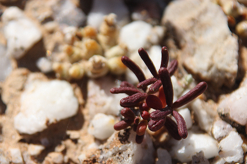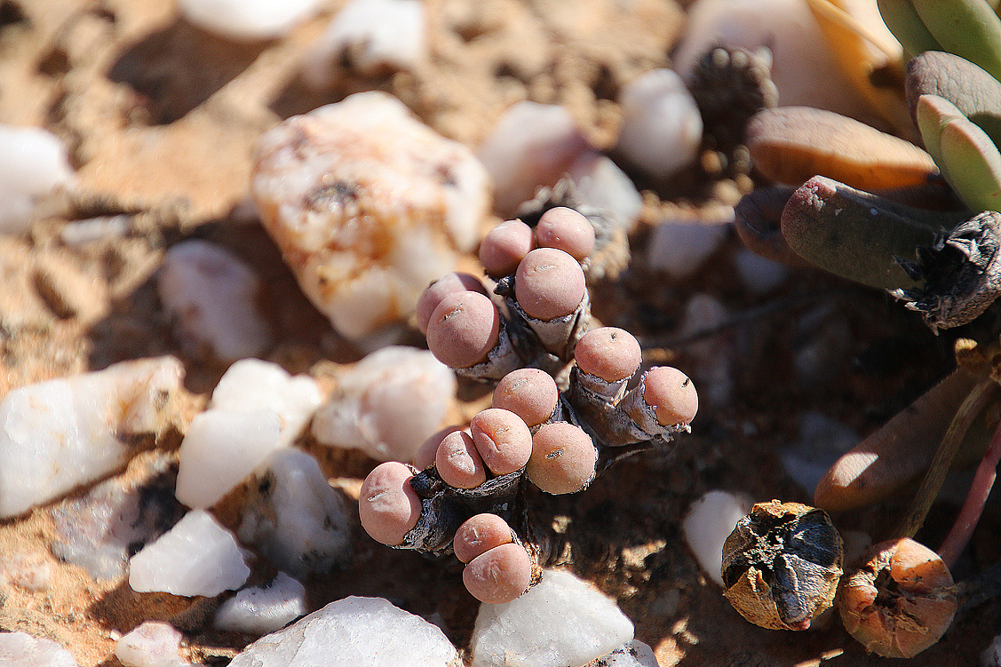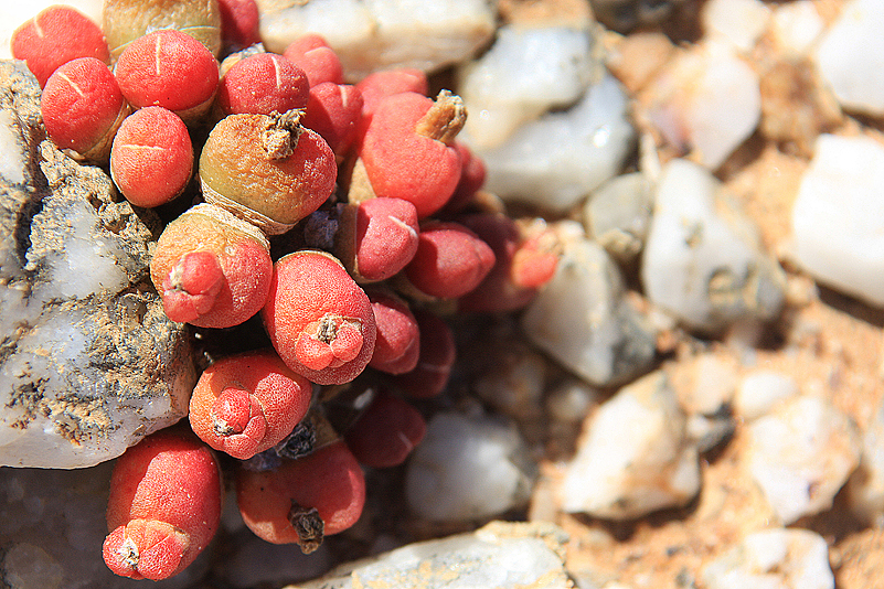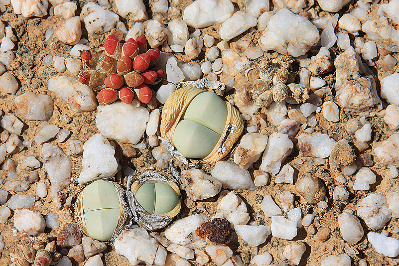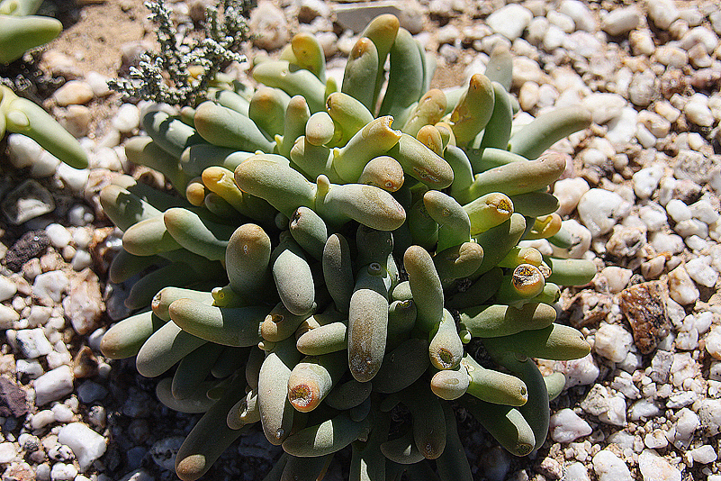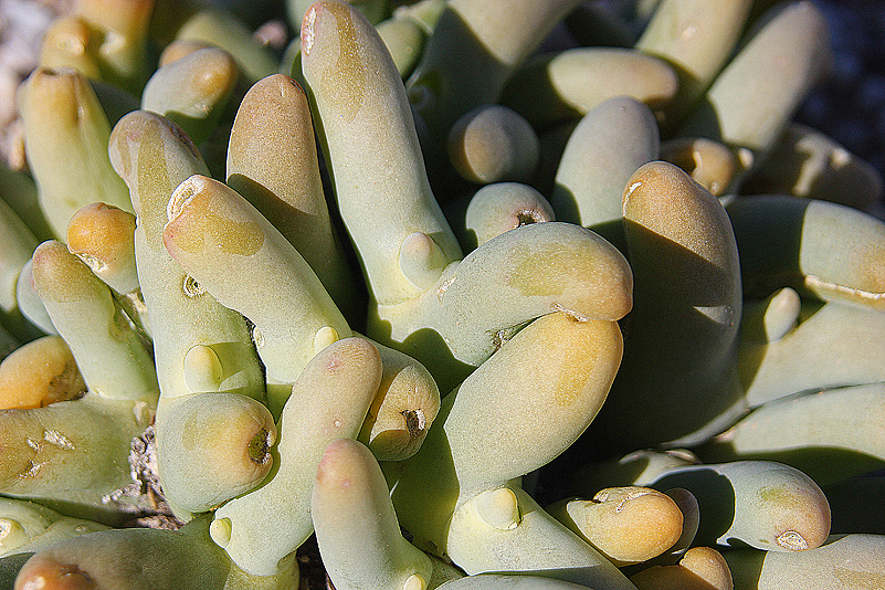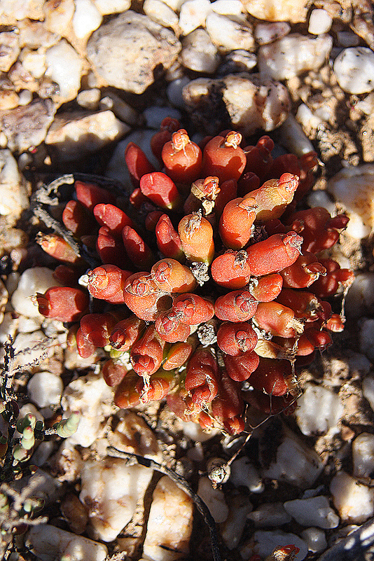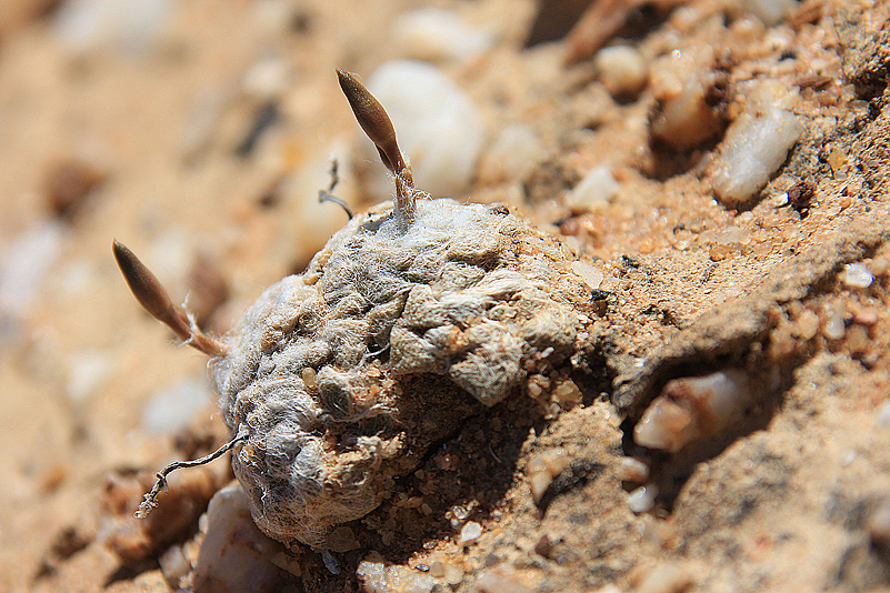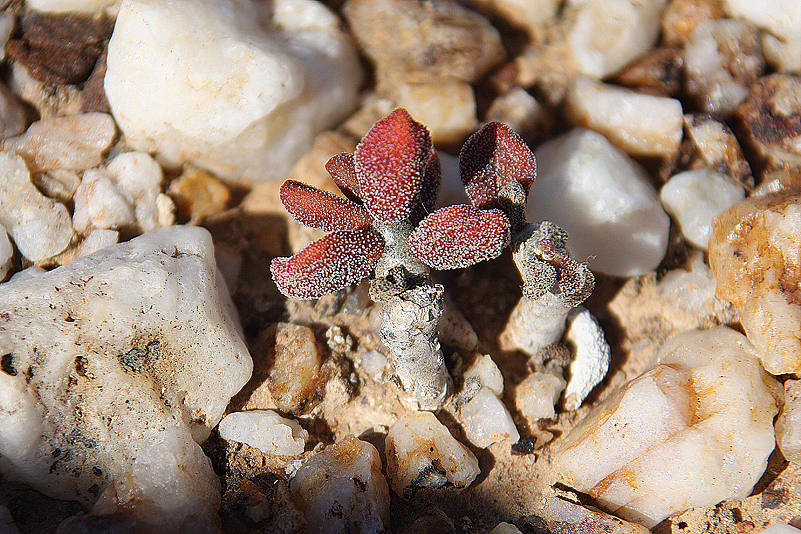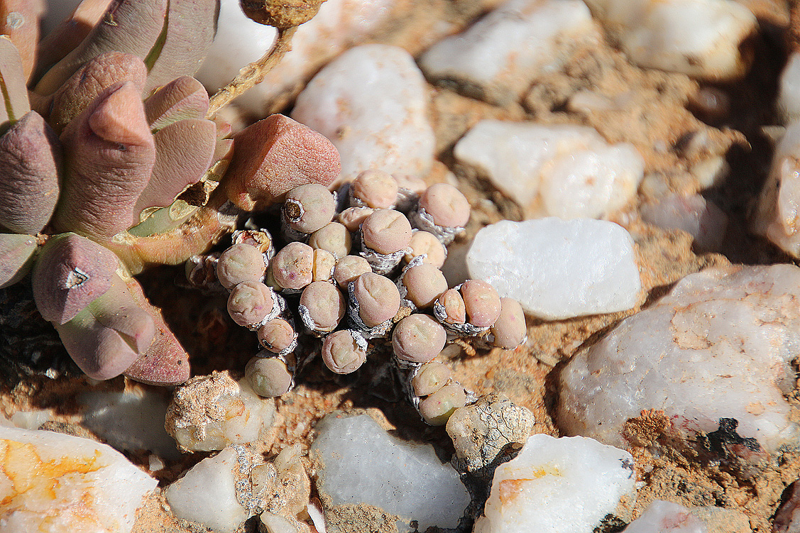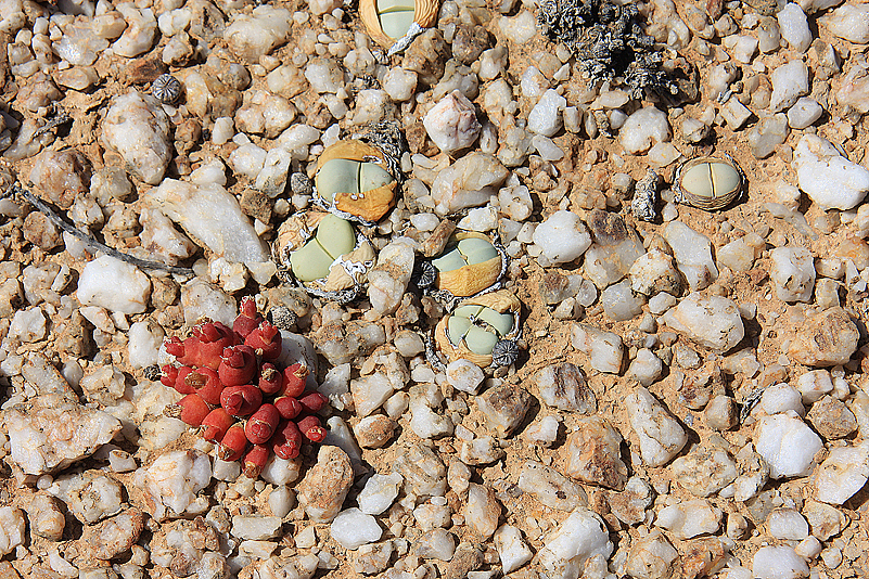 Mei, ist das schön, all die alten Bekannten, sprich Pflanzen, wiederzusehen. Leider ist zwar auch heuer kein Blütenmeer in Sicht, dafür sind wir einfach zu spät dran, aber trotzdem gibt es viel zu entdecken. Viele Pflanzen, die letztes Jahr schon „geschlafen“ hatten, also bis auf kaum sichtbare Reste auf Bodenniveau eingeschrumpelt waren, strotzen heuer prall, frisch und in den schönsten Farben. Da ist zum Beispiel Oophytum nanum, dessen zweigeteilte Blätter in allen Rottönen leuchten, winzige Tylecodons mit braunroter Belaubung, Argyroderma delaetii in pastelligem Mintgrün und appetitlichem Apricot und etwas, was wir auf unserer letzten Tour gar nicht gesehen hatten: Dactylopsis digitata. Diese Mittagsblumengewächse, die etwa zehn bis fünfzehn Zentimeter hoch werden und, by the way, gerade auch nur vereinzelt blühen, haben fingerförmige, zweigeteilte Blätter, die sich wie dicke grüne Würmer gen Himmel recken. Und diese Blätter haben ihnen auch ihren Trivialnamen eingebracht: Dead Man Fingers Plants oder Tote Finger-Pflanzen.