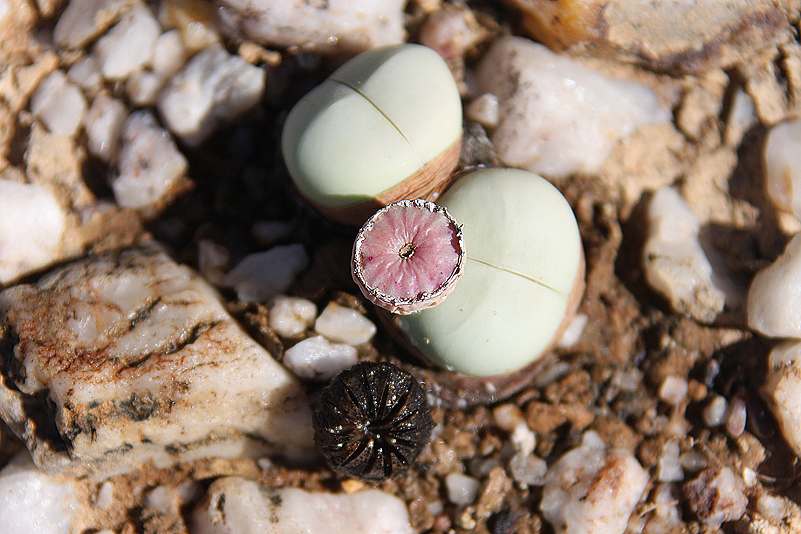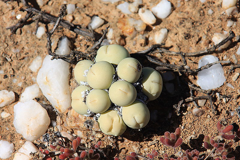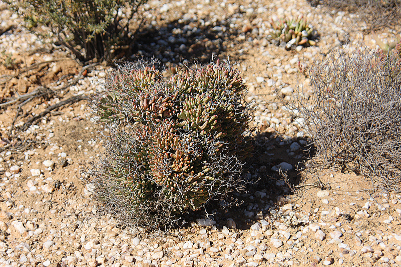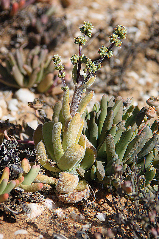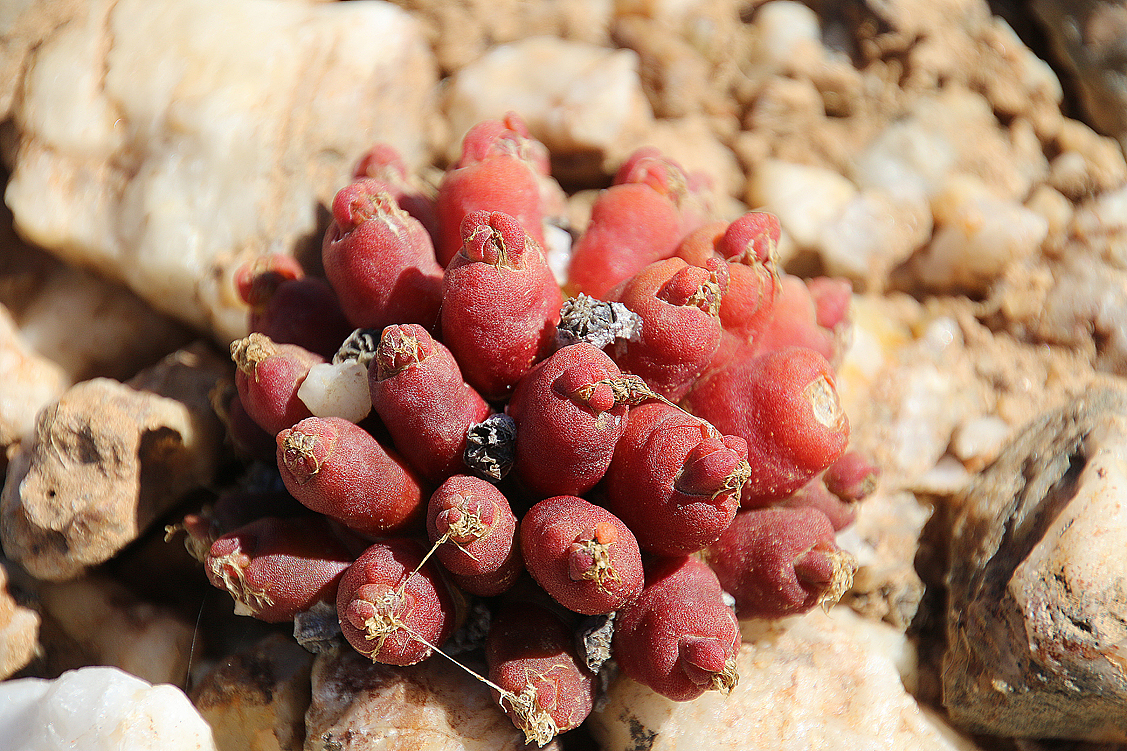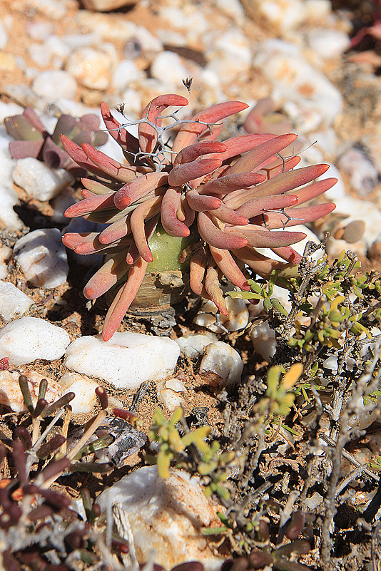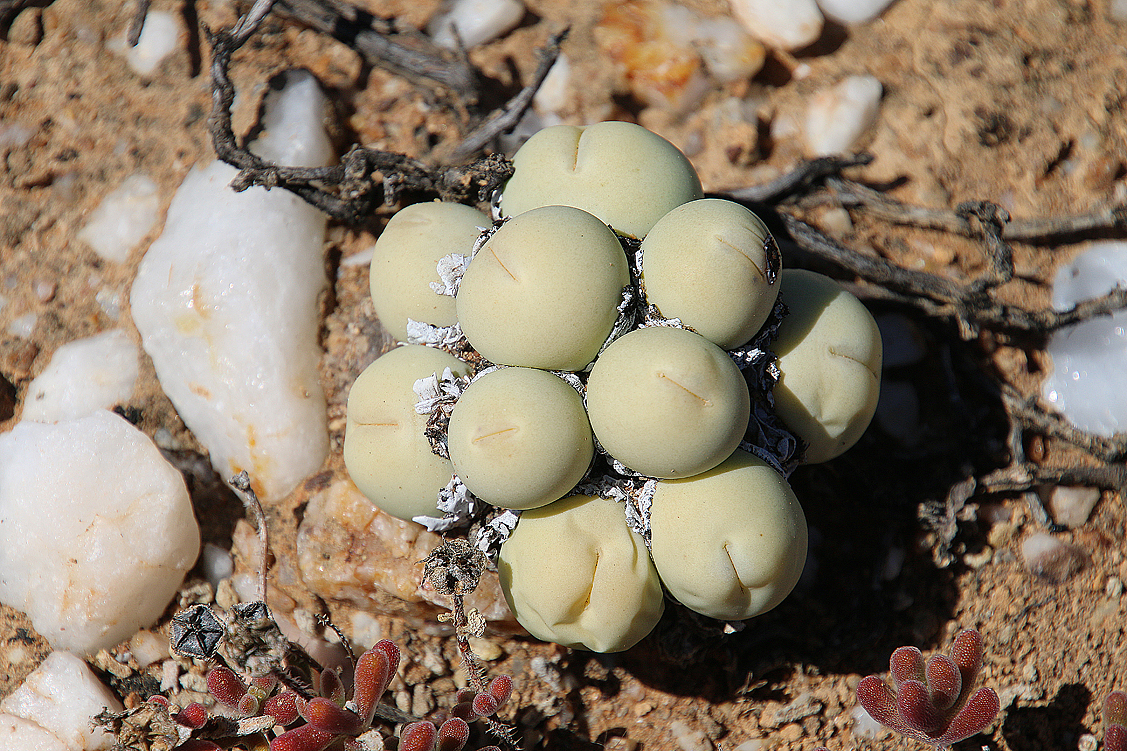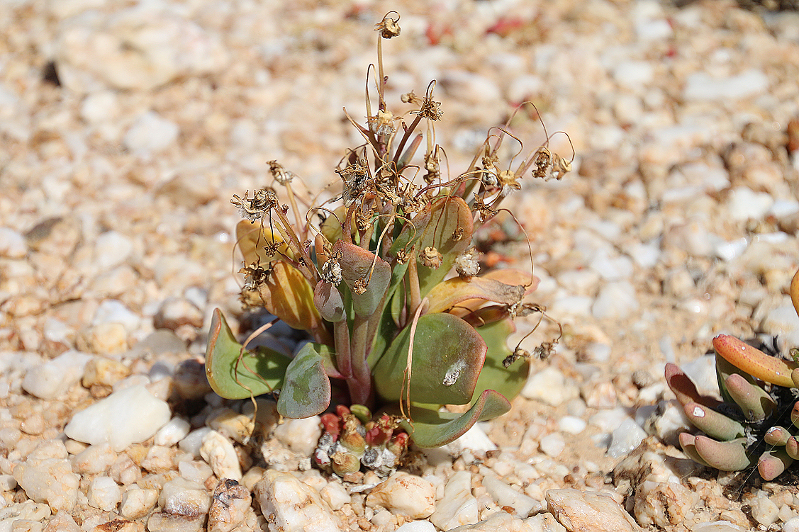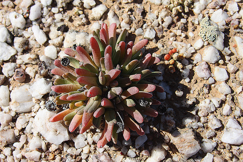 Mei, ist das schön, all die alten Bekannten, sprich Pflanzen, wiederzusehen. Leider ist zwar auch heuer kein Blütenmeer in Sicht, dafür sind wir einfach zu spät dran, aber trotzdem gibt es viel zu entdecken. Viele Pflanzen, die letztes Jahr schon „geschlafen“ hatten, also bis auf kaum sichtbare Reste auf Bodenniveau eingeschrumpelt waren, strotzen heuer prall, frisch und in den schönsten Farben. Da ist zum Beispiel Oophytum nanum, dessen zweigeteilte Blätter in allen Rottönen leuchten, winzige Tylecodons mit braunroter Belaubung, Argyroderma delaetii in pastelligem Mintgrün und appetitlichem Apricot und etwas, was wir auf unserer letzten Tour gar nicht gesehen hatten: Dactylopsis digitata. Diese Mittagsblumengewächse, die etwa zehn bis fünfzehn Zentimeter hoch werden und, by the way, gerade auch nur vereinzelt blühen, haben fingerförmige, zweigeteilte Blätter, die sich wie dicke grüne Würmer gen Himmel recken. Und diese Blätter haben ihnen auch ihren Trivialnamen eingebracht: Dead Man Fingers Plants oder Tote Finger-Pflanzen.