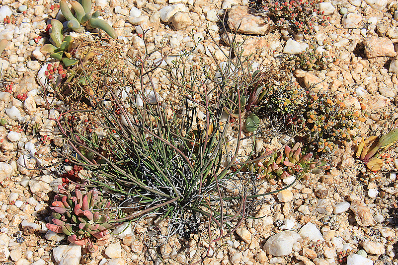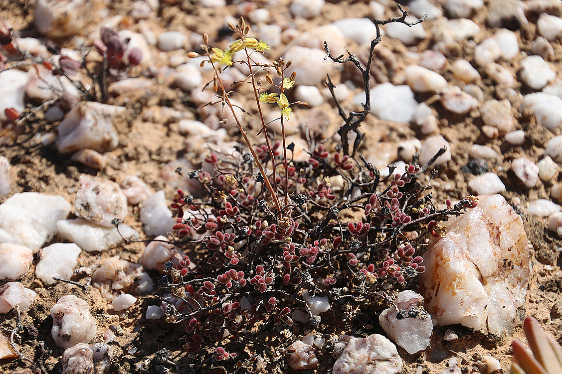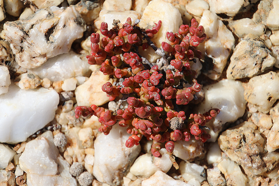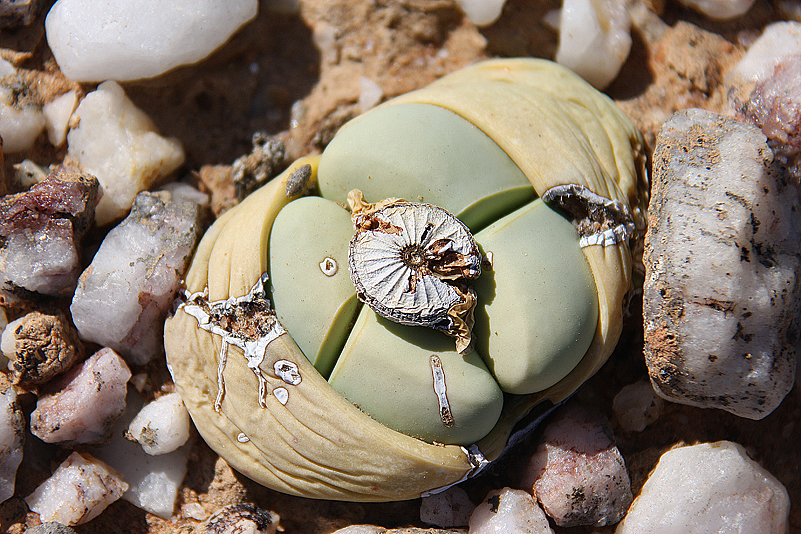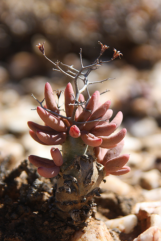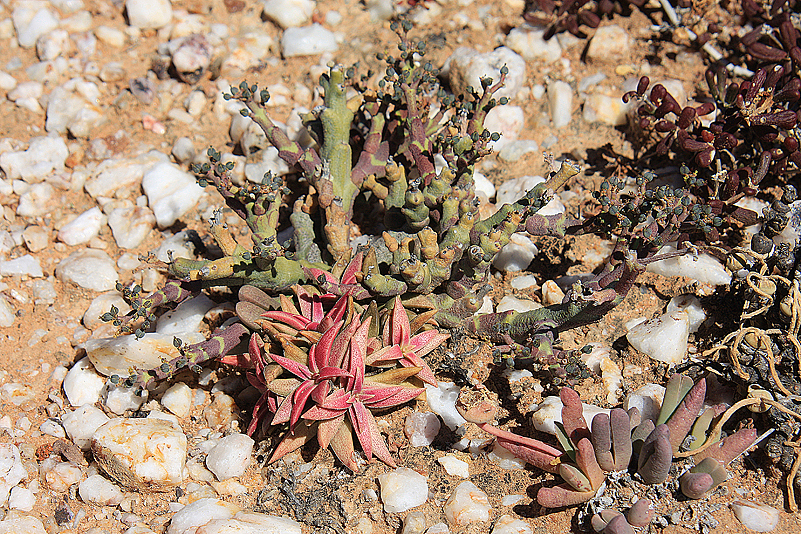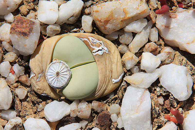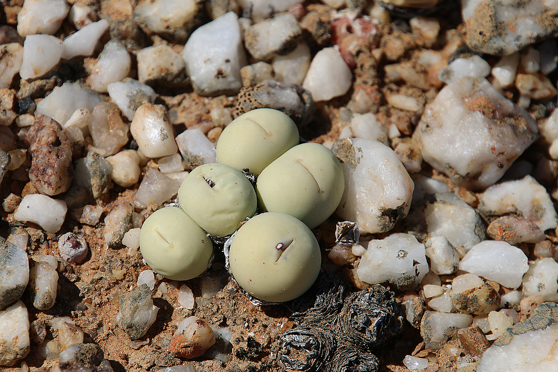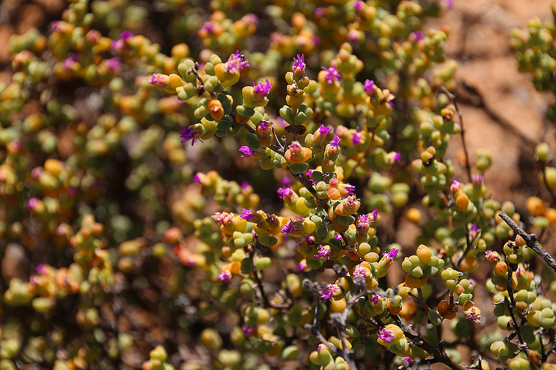 Mei, ist das schön, all die alten Bekannten, sprich Pflanzen, wiederzusehen. Leider ist zwar auch heuer kein Blütenmeer in Sicht, dafür sind wir einfach zu spät dran, aber trotzdem gibt es viel zu entdecken. Viele Pflanzen, die letztes Jahr schon „geschlafen“ hatten, also bis auf kaum sichtbare Reste auf Bodenniveau eingeschrumpelt waren, strotzen heuer prall, frisch und in den schönsten Farben. Da ist zum Beispiel Oophytum nanum, dessen zweigeteilte Blätter in allen Rottönen leuchten, winzige Tylecodons mit braunroter Belaubung, Argyroderma delaetii in pastelligem Mintgrün und appetitlichem Apricot und etwas, was wir auf unserer letzten Tour gar nicht gesehen hatten: Dactylopsis digitata. Diese Mittagsblumengewächse, die etwa zehn bis fünfzehn Zentimeter hoch werden und, by the way, gerade auch nur vereinzelt blühen, haben fingerförmige, zweigeteilte Blätter, die sich wie dicke grüne Würmer gen Himmel recken. Und diese Blätter haben ihnen auch ihren Trivialnamen eingebracht: Dead Man Fingers Plants oder Tote Finger-Pflanzen.