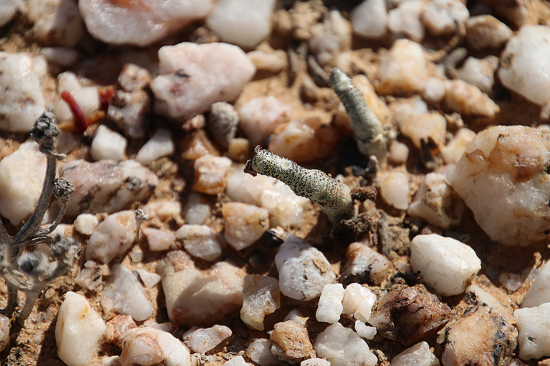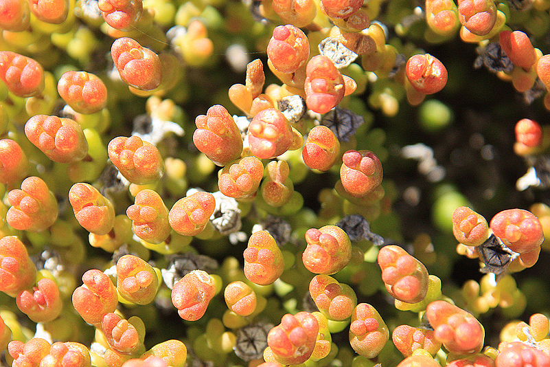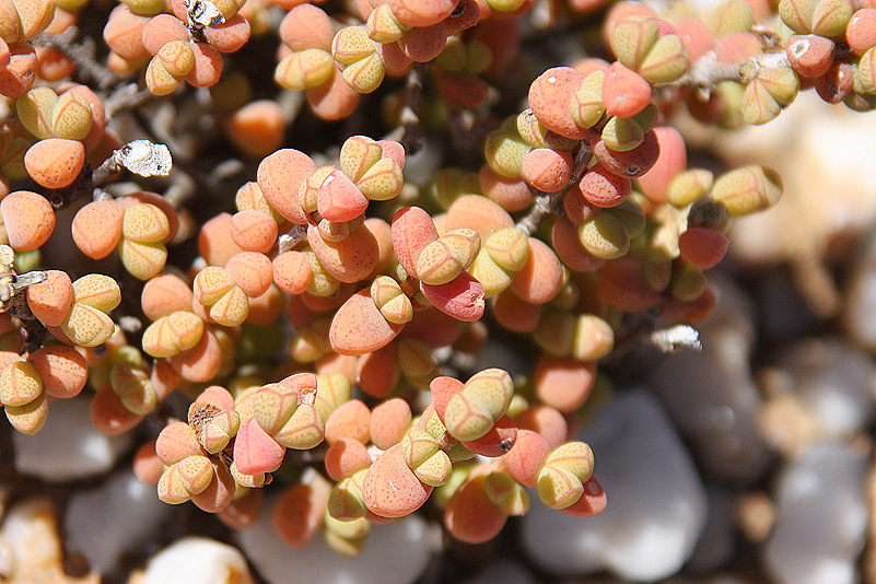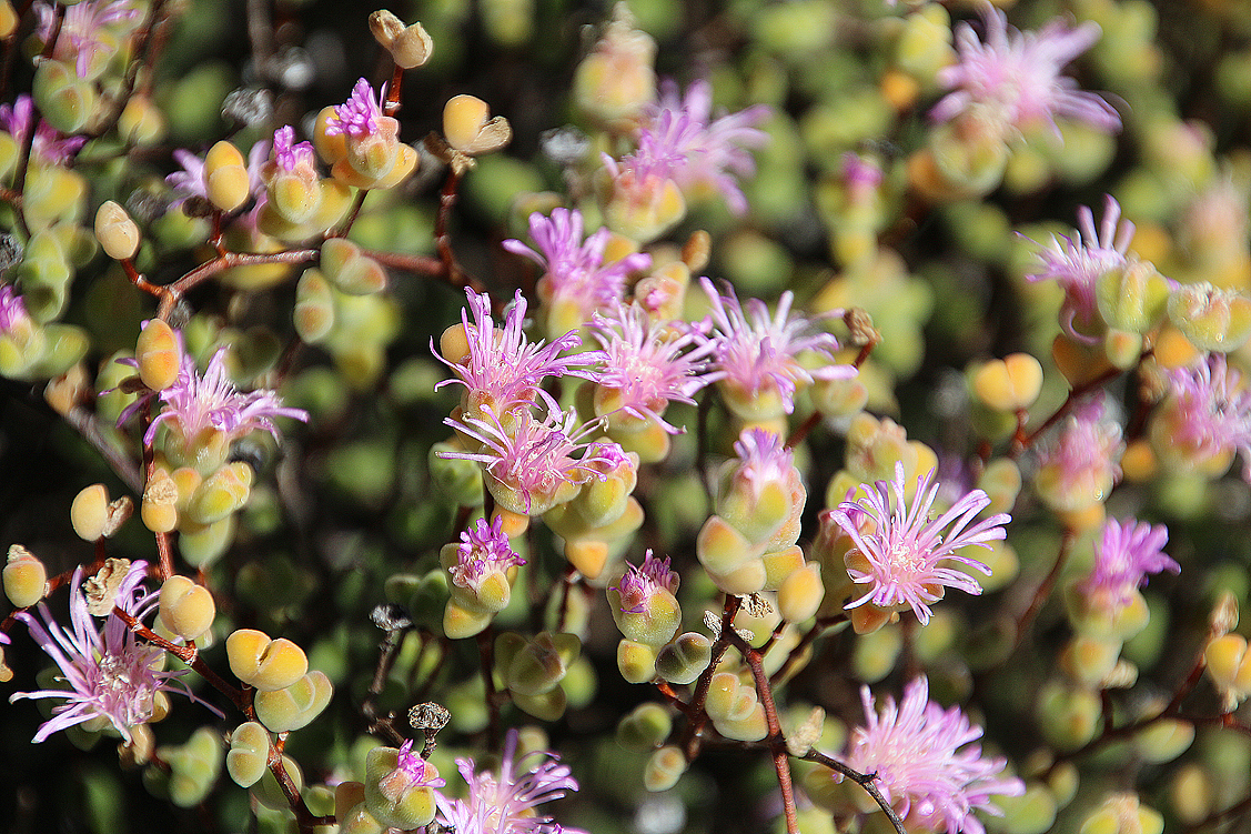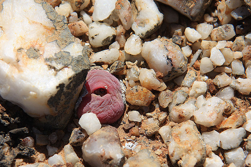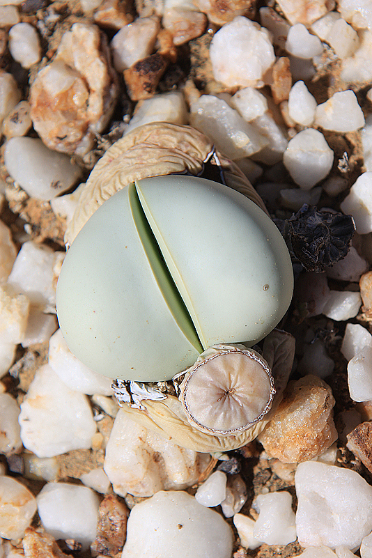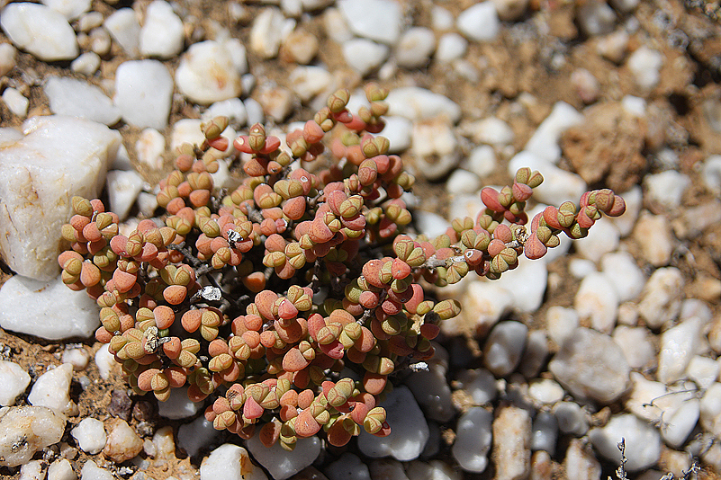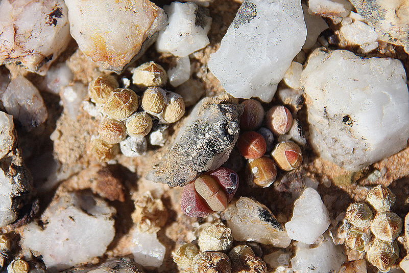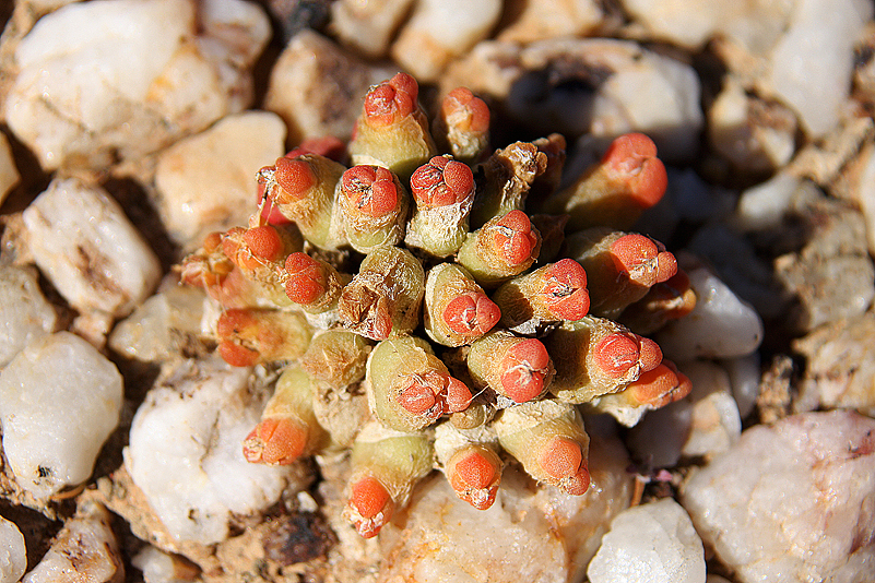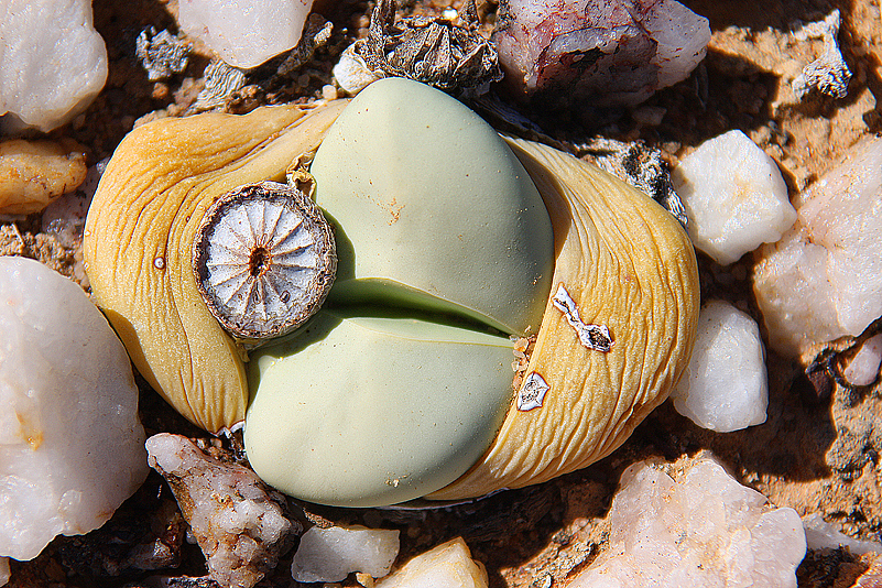 Mei, ist das schön, all die alten Bekannten, sprich Pflanzen, wiederzusehen. Leider ist zwar auch heuer kein Blütenmeer in Sicht, dafür sind wir einfach zu spät dran, aber trotzdem gibt es viel zu entdecken. Viele Pflanzen, die letztes Jahr schon „geschlafen“ hatten, also bis auf kaum sichtbare Reste auf Bodenniveau eingeschrumpelt waren, strotzen heuer prall, frisch und in den schönsten Farben. Da ist zum Beispiel Oophytum nanum, dessen zweigeteilte Blätter in allen Rottönen leuchten, winzige Tylecodons mit braunroter Belaubung, Argyroderma delaetii in pastelligem Mintgrün und appetitlichem Apricot und etwas, was wir auf unserer letzten Tour gar nicht gesehen hatten: Dactylopsis digitata. Diese Mittagsblumengewächse, die etwa zehn bis fünfzehn Zentimeter hoch werden und, by the way, gerade auch nur vereinzelt blühen, haben fingerförmige, zweigeteilte Blätter, die sich wie dicke grüne Würmer gen Himmel recken. Und diese Blätter haben ihnen auch ihren Trivialnamen eingebracht: Dead Man Fingers Plants oder Tote Finger-Pflanzen.