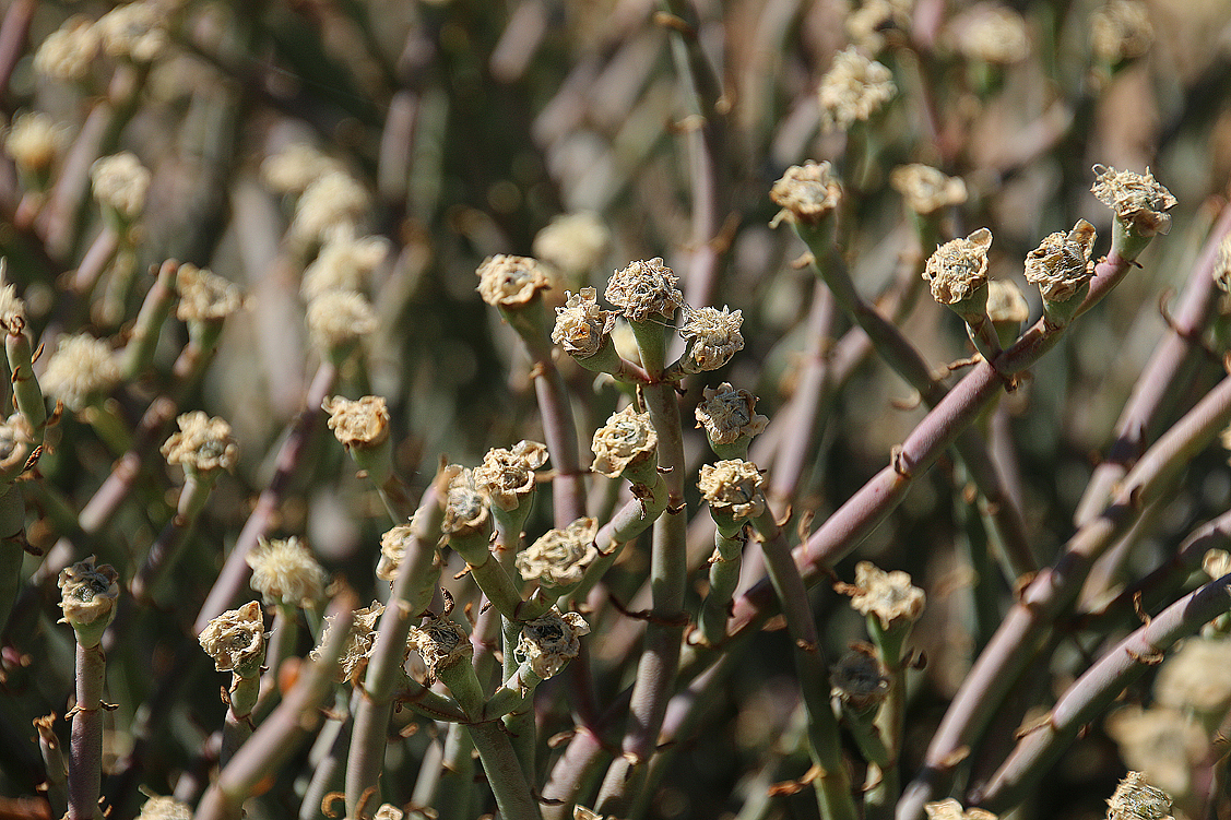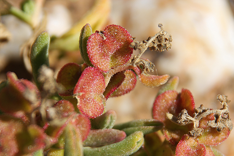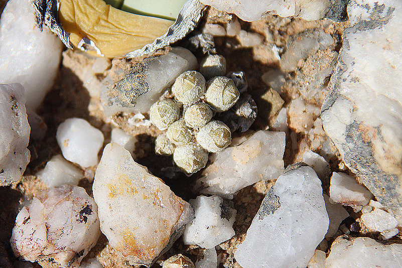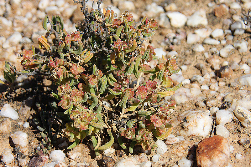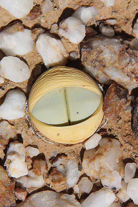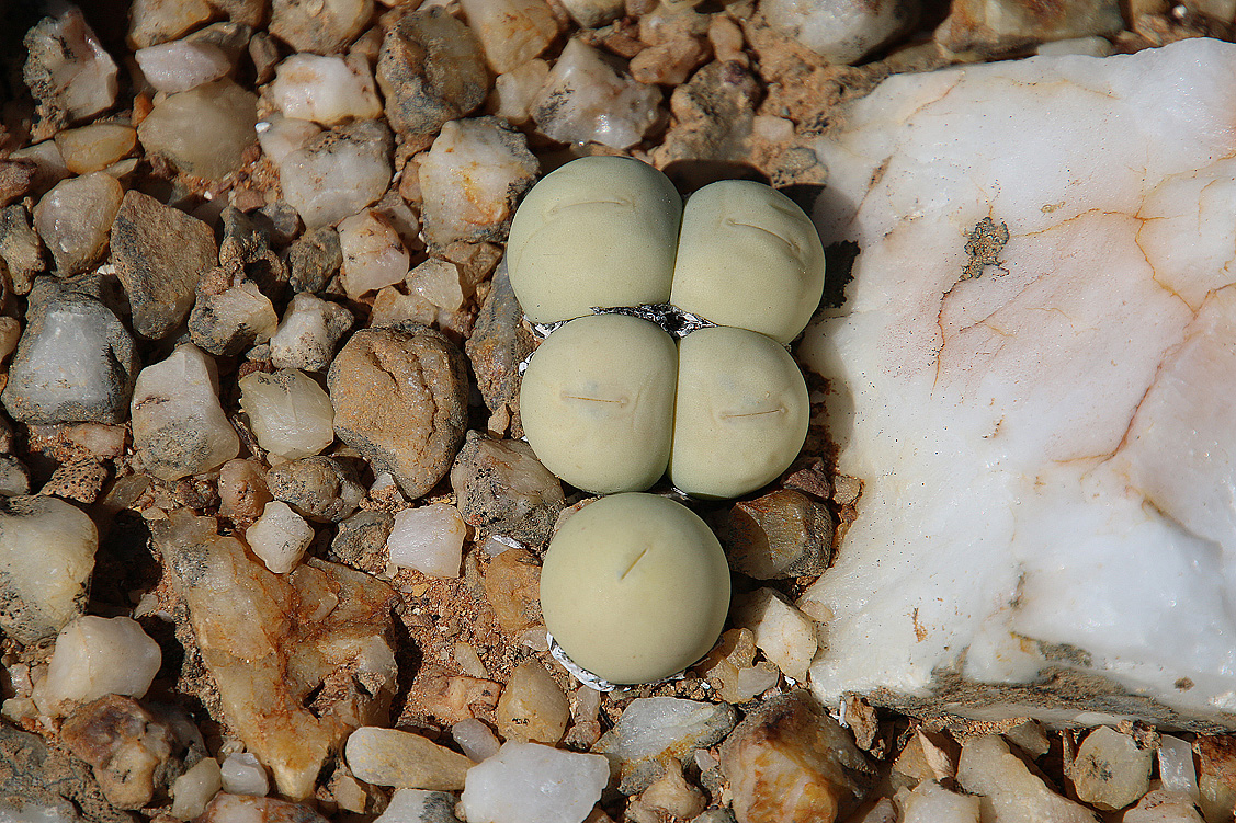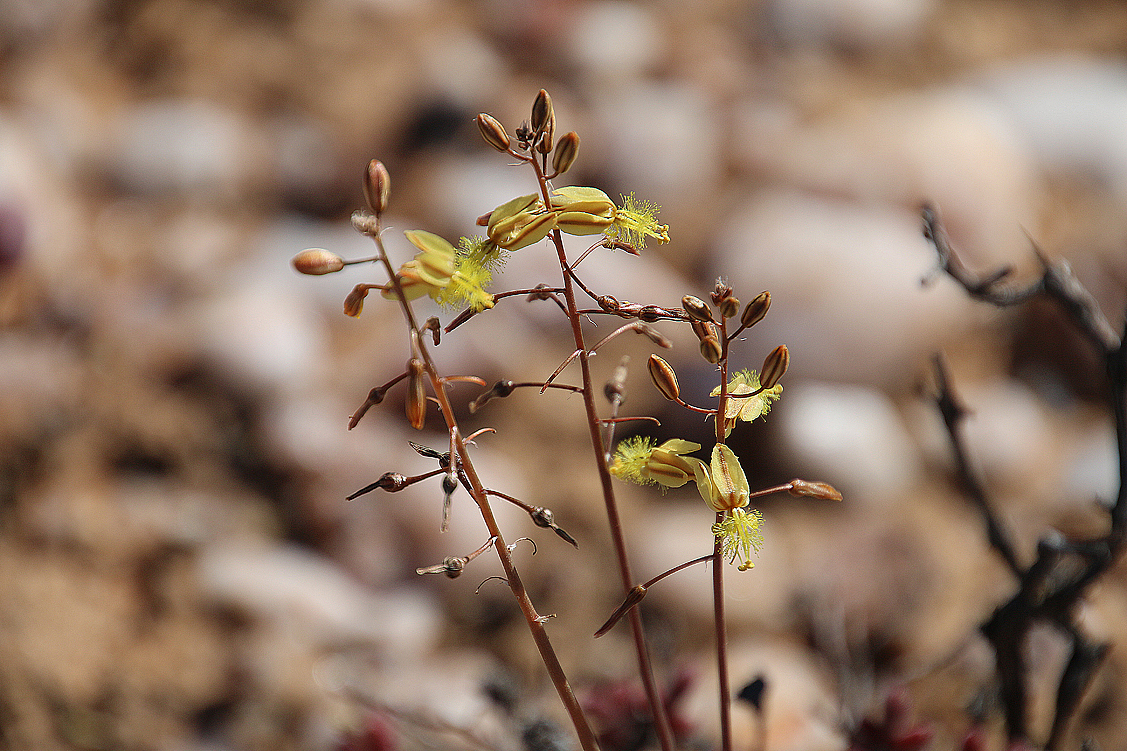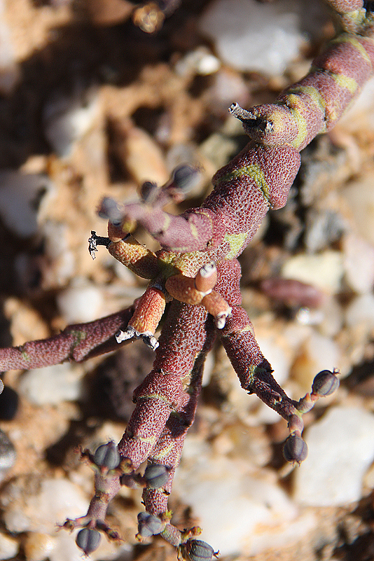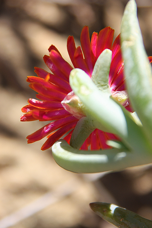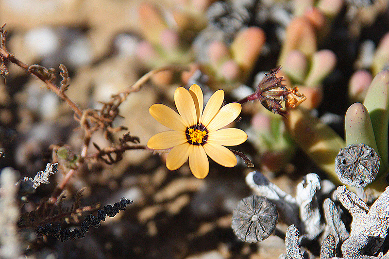 Mei, ist das schön, all die alten Bekannten, sprich Pflanzen, wiederzusehen. Leider ist zwar auch heuer kein Blütenmeer in Sicht, dafür sind wir einfach zu spät dran, aber trotzdem gibt es viel zu entdecken. Viele Pflanzen, die letztes Jahr schon „geschlafen“ hatten, also bis auf kaum sichtbare Reste auf Bodenniveau eingeschrumpelt waren, strotzen heuer prall, frisch und in den schönsten Farben. Da ist zum Beispiel Oophytum nanum, dessen zweigeteilte Blätter in allen Rottönen leuchten, winzige Tylecodons mit braunroter Belaubung, Argyroderma delaetii in pastelligem Mintgrün und appetitlichem Apricot und etwas, was wir auf unserer letzten Tour gar nicht gesehen hatten: Dactylopsis digitata. Diese Mittagsblumengewächse, die etwa zehn bis fünfzehn Zentimeter hoch werden und, by the way, gerade auch nur vereinzelt blühen, haben fingerförmige, zweigeteilte Blätter, die sich wie dicke grüne Würmer gen Himmel recken. Und diese Blätter haben ihnen auch ihren Trivialnamen eingebracht: Dead Man Fingers Plants oder Tote Finger-Pflanzen.