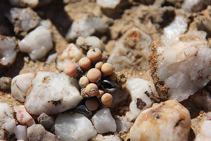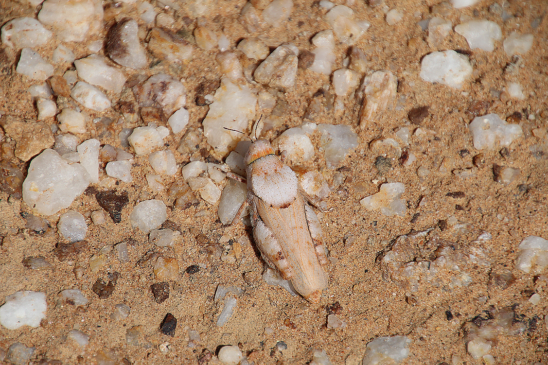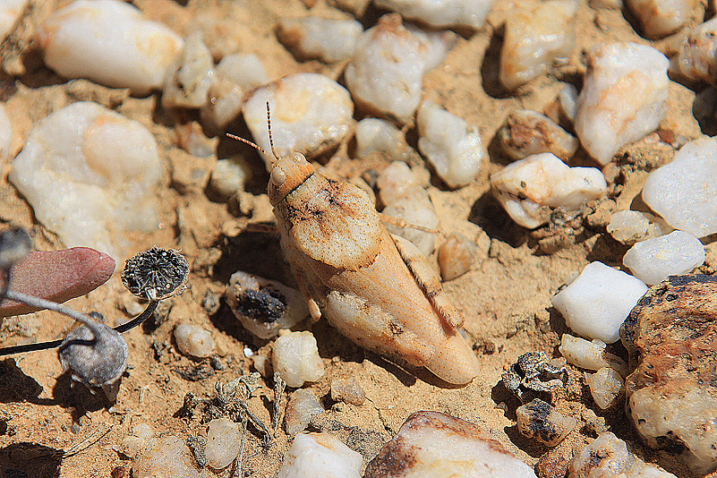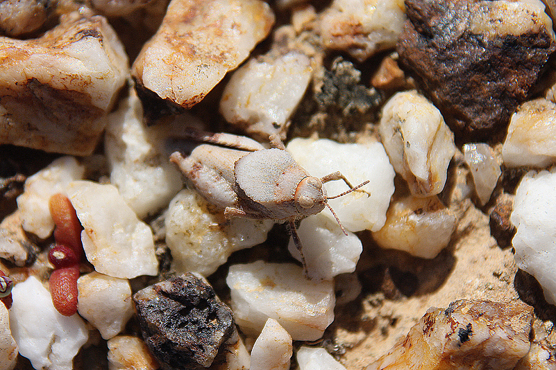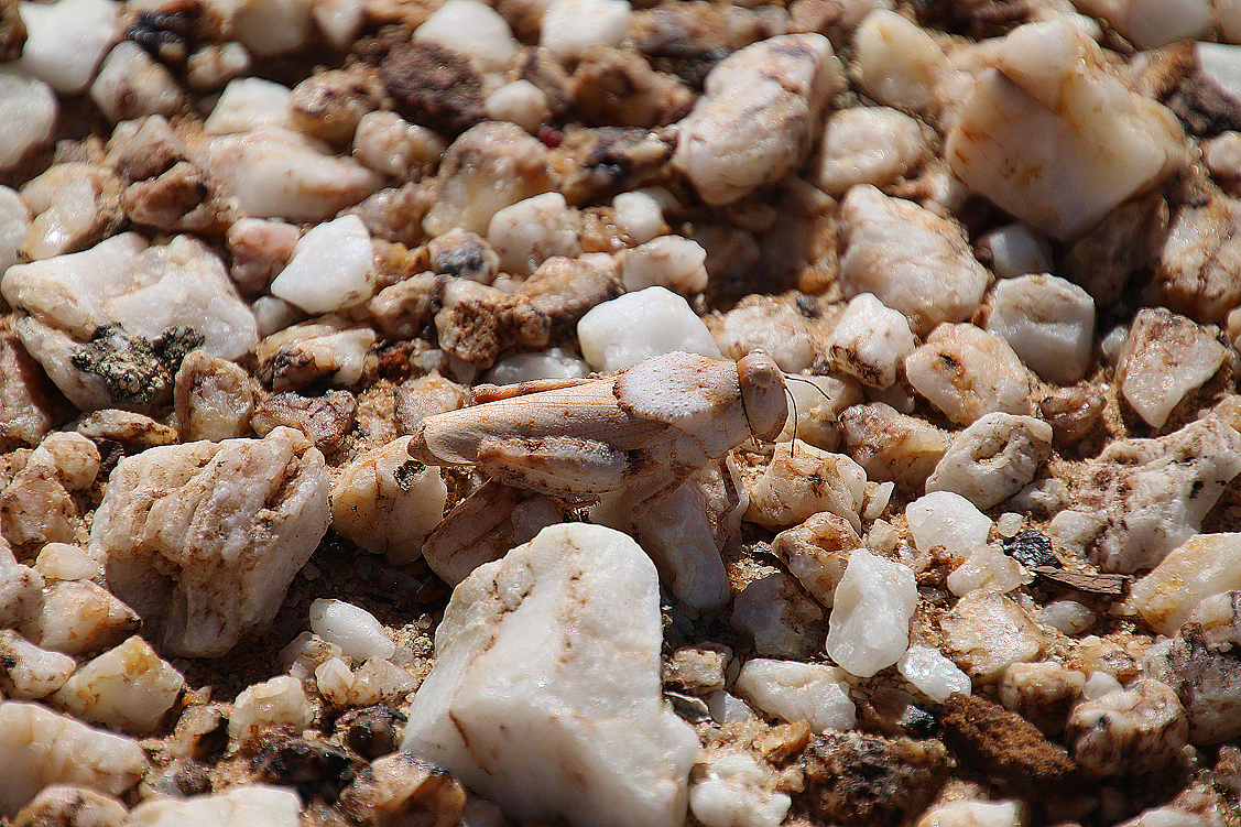 Ich klopfe mir auf meine durchaus lebendigen Finger, reiße mich von den Knabengemächten los und durchstreife mit Heinz weiter das Gelände, das immer wieder Neues zu bieten hat. Dabei stellen wir fest, dass wir unsere Freunde eine ganze Weile schon nicht mehr gesehen haben. Ein Blick in die Runde bestätigt unsere geheimen Befürchtungen: die Drei sind bereits wieder auf dem Rückweg. Doch solange uns keiner zurückpfeift, kosten wir die sich darbietenden Schätze dieser einzigartigen Quarzebenen in vollen Zügen aus, schlagen dabei jedoch vorsichtshalber ebenfalls den Weg zurück zum Parkplatz ein – natürlich großzügig zickzackend und mäandernd. Vielleicht etwas zu großzügig. Denn als wir uns, zumindest in der Luftlinie, dem Gate bereits auf fünfhundert Meter genähert haben, kommt uns Jochen ungeduldig entgegengesprungen. Mit einem Blick auf seine imaginäre Armbanduhr fordert er uns mehr als eindeutig zur Beeilung auf. Halbherzig nicken wir ihm zu und er dreht daraufhin zufrieden ab. Wir aber sinken, kaum dass er uns den Rücken zugewendet hat, wieder auf die Knie, denn da sitzt eine wunderschöne, bunte Heuschrecke auf dem Weg. Und, ach ja, da hinten, da hatten wir doch vorhin noch etwas Rotes leuchten sehen. Es ist zum Verrücktwerden – für beide Seiten. Heinz und ich können uns einfach nicht sattsehen, die anderen hingegen drehen am Rad, weil wir beide kein Ende finden. Als wir nach insgesamt vier Stunden schließlich doch am Parkplatz eintrudeln, herrscht leicht genervte Stimmung, die Heinz und ich aber nonchalant beiseite ignorieren und uns stattdessen ablenkend nach den Erlebnissen unserer Freunde erkundigen. Nun, der Bär hat unterhaltungstechnisch wohl nicht gesteppt, doch Annette und Ute hatten zumindest ein Event der dritten Art: sie suchten die Toilette beim Schattendach auf, Ute drin, Annette noch draußen, als auf einmal gruselige Grunz- und Keuchgeräusche aus den Tiefen der Grube ertönten. Ute zog sich die Hose ganz schnell wieder hoch und die beiden ergriffen unverrichteter Dinge die Flucht. Na ja, immerhin hat sich nicht nur für unser Empfinden etwas Spannendes ereignet…