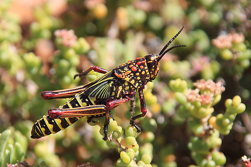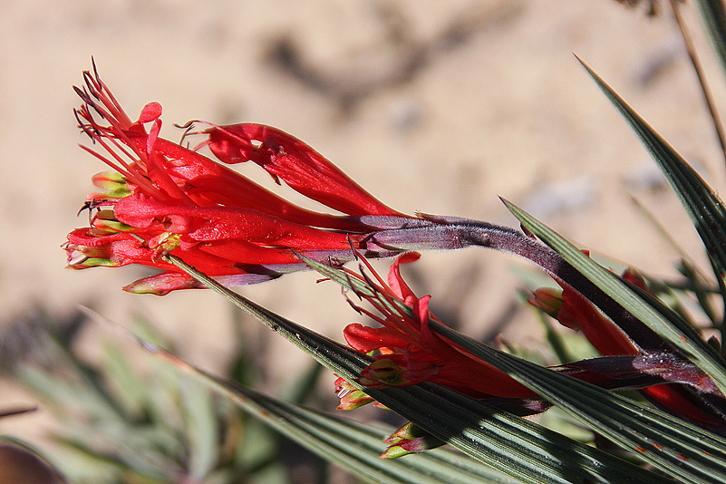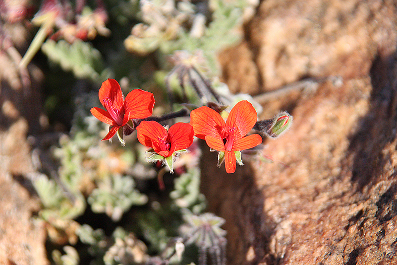 Nach einer kurzweiligen halben Stunde ist alles gesehen und erledigt und wir nehmen nun die Strecke zu unserer gebuchten Campsite in Angriff, die zwar definitiv sandig ist, heuer aber keinerlei Tiefsandpassagen bereithält. Das ermöglicht uns, jederzeit und überall problemlos anhalten zu können; ein Umstand, von dem wir regen Gebrauch machen. Schließlich müssen wir all unsere pflanzlichen Bekannten begrüßen und gründlich unter die Lupe nehmen. Und sie sind alle da! Heinz und ich haben nichts vergessen, finden wie ferngesteuert zu den besonderen Plätzen, die uns letztes Jahr so begeistert hatten und uns auch heuer nicht enttäuschen: hier das Killerflechtenfeld in orangefarbener Pracht, da die üppigen Crassula-barklyi-Pölsterchen, dort die ehemals fluffigen Pteronias, die heuer gerade am Abblühen sind, da drüben – uih, was ist das? Ein knallrot-wogendes Blütenfeld schiebt sich in unser Blickfeld: Babianas! Diese augenfällig blühenden Schwertliliengewächse hatten sich letztes Jahr in dieser Form nicht gezeigt. Wieder halten wir an, um die Babianas zu bewundern und entdecken dabei noch ganz andere Blühgewächse, die man vom Auto aus nicht mal erahnen konnte: zartblaue Moraeas, elfenbeinfarbene Conicosias und fragile Dischimas mit winzigen, orchideenartigen Blüten. Leider können wir uns den bunten Schönheiten nicht in aller Ausgiebigkeit widmen, denn unsere Freunde legen schon wieder eine gewisse Ungeduld an den Tag. Jaja, ist ja gut, wir kommen!