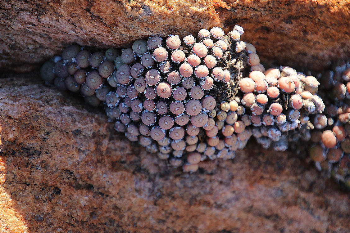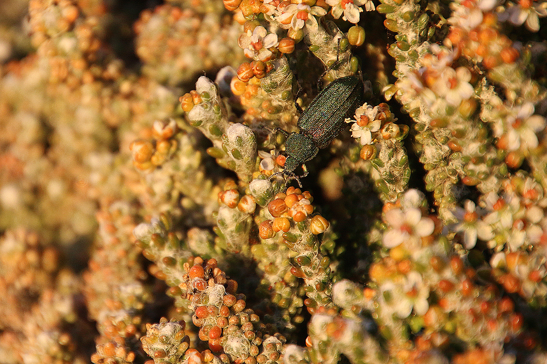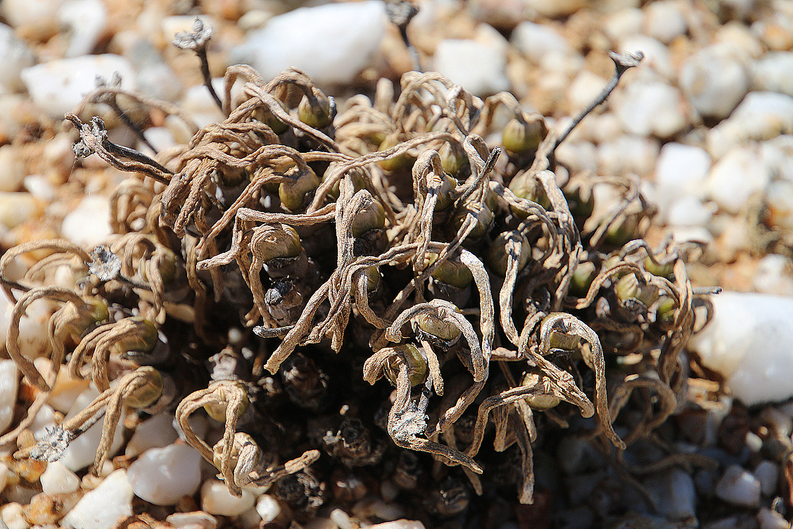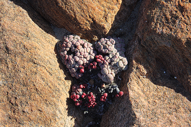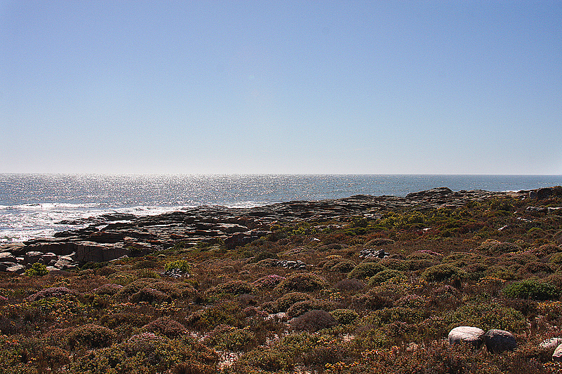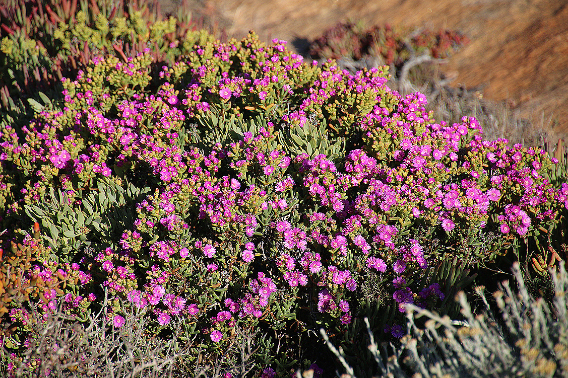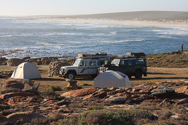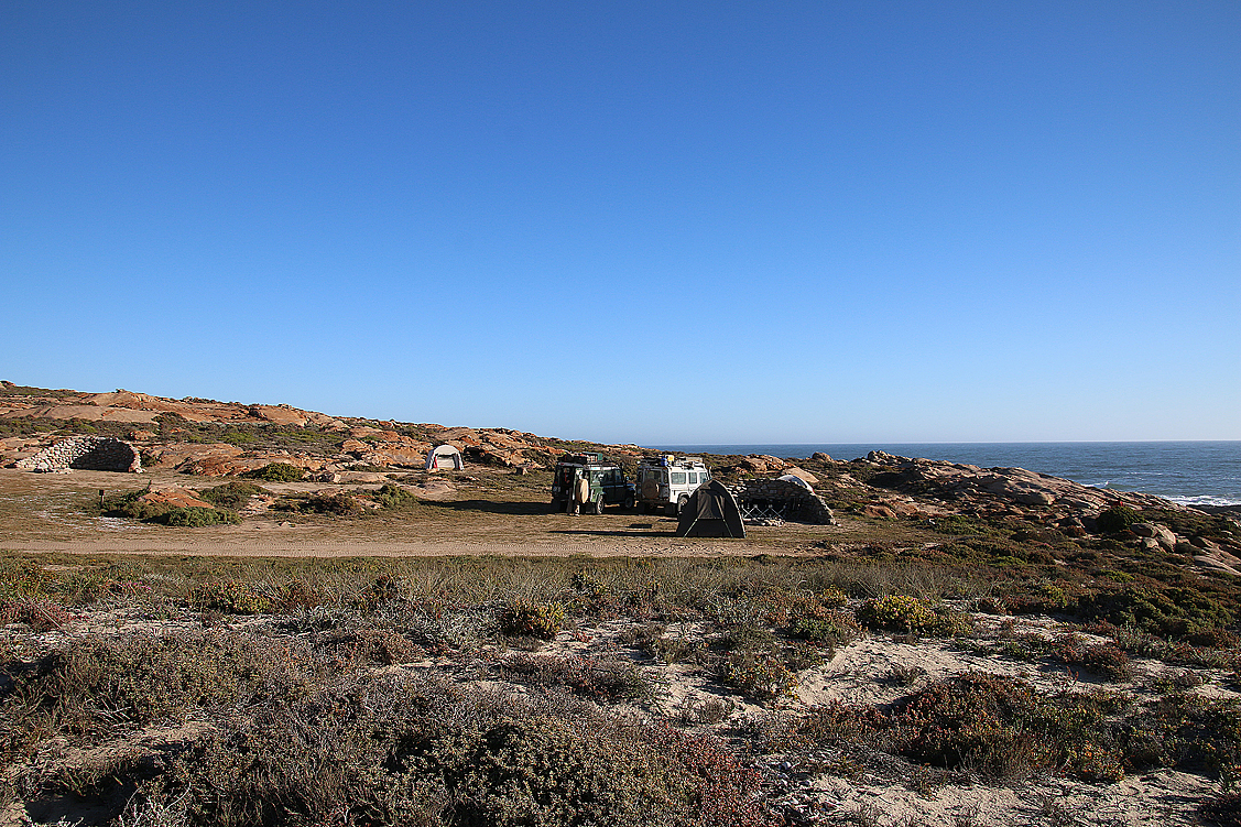 Wie auch schon letztes Jahr sind wir heuer wieder die einzigen Camper an der Koringkorrel Baai, was uns zutiefst erfreut. Dennoch wurde uns natürlich eine bestimmte Site zugewiesen (unser Wunschplatz direkt oberhalb des Strandes) und dort lassen wir uns jetzt häuslich nieder. Der Platz ist großzügig geschnitten, jeder findet sein Plätzchen, wenngleich Ute sich etwas benachteiligt sieht: Annette und Jochen schlagen ihr Zelt wie selbstverständlich da auf, wo es schon letztes Jahr stand, Heinz und ich okkupieren ebenfalls unseren „alten“ Platz und Ute hat, in ihren Augen, die Nachsicht. Bah, ist das kompliziert – und das mit nur einer Person mehr an Bord: keiner mag, bei diesem Platzangebot, zu nahe bei den anderen sein Zelt errichten, der eine hat einen leichten Schlaf, der andere schnarcht wie blöd, dem nächsten ist alles egal und zu allerletzt steht dann der steinig-felsige Boden den finalen Verteilungswünschen im Wege. Doch wir helfen alle zusammen und finden schließlich auch für Ute einen Standplatz, mit dem sie gut leben kann. Dann endlich kann das Beach-Life beginnen: ein schnelles Käffchen nach dem Aufbau – und jeder tut das, was er am liebsten möchte. Ute hechtet zu Fuß von dannen, den kilometerlangen, weißen Sandstrand gen Norden, Annette und Jochen machen einen auf Strandurlauber und Heinz und ich entscheiden uns für den Mittelweg – einen ausgiebigen Strandspaziergang ohne Hast und Eile. Und wieder nehmen wir alte und neue Bekannte in Augenschein, planschen mit den Füßen im eiskalten Meer, spielen mit den Kelpstängeln, untersuchen Felsritzen und sandige Böschungen, genießen die salzige Luft, unser Alleinsein und die Tatsache, dass wir niemanden mit unserer botanischen Erkundungsfreude langweilen oder gar nerven.