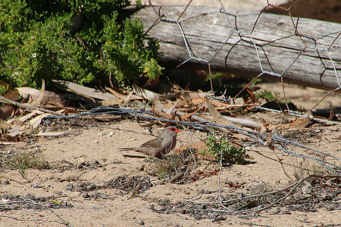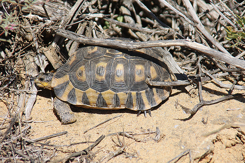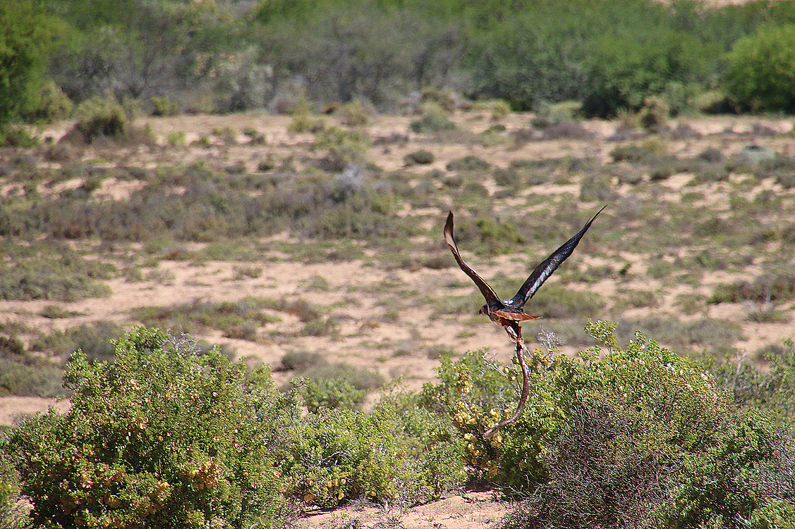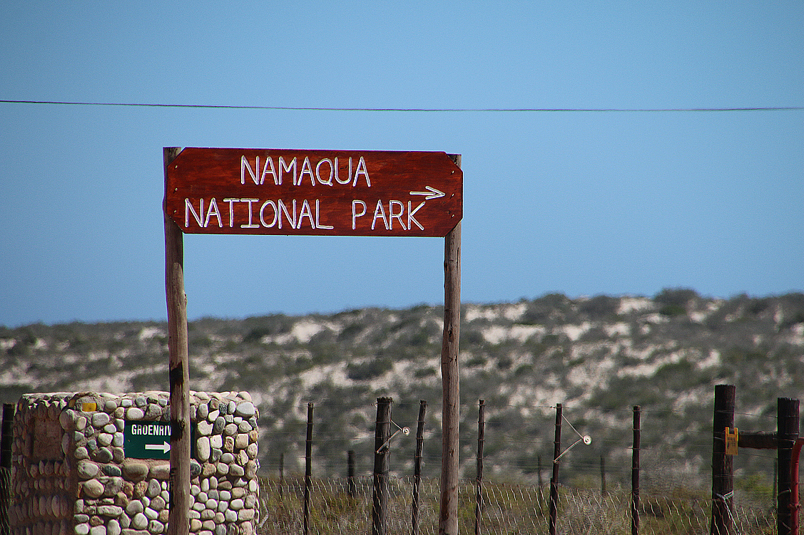 Jetzt aber sind wir alle wieder im selben Interessen-Slot vereinigt; wir packen uns in die Autos und machen uns auf zum Namaqua NP – altbekannter Weg, neues Glück! Kurz nach Bitterfontein verlassen wir die N7, biegen ab Richtung Westen, durchfahren staubiges Farmland, durchqueren das Tal des Groen River, machen kurz Pause und tuckern weiter; nicht gerade prickelnd. Doch: das Meer ist schon fast in Sicht, als sich zu unserer Linken plötzlich ein Raubvogel herabstürzt, nach Beute greifend, und sich mit einer Schlange in den Fängen wieder in die Lüfte erhebt. Das Reptil allerdings windet und wehrt sich so heftig, dass es dem Greif wieder entgleitet und er ohne Beute weiterschwebt. Wie gebannt beobachten wir das Geschehen und hoffen auf eine Rückkehr des Adlers. Aber der entschwindet, ohne sich noch einmal umzusehen, weder nach der Schlange, noch nach uns. Blöder Vogel! So aber kommen wir wenigstens wieder ein Stück vorwärts und erreichen eine halbe Stunde später das Gate des Namaqua NP. Und bis auf Ute stürmen wir alle das Office, denn wir möchten natürlich wissen, was aus dem Kapfuchs geworden ist, von dem uns die Rangerin letztes Jahr erzählt hatte. Wir haben Glück: die betreffende Dame steht wie auf Bestellung hinter der Empfangstheke und informiert uns sofort umfassend in Wort und Bild. Jakkals, der Kapfuchs, den sie mit der Hand aufgezogen hatte und der ihr auch als fast Erwachsener noch regelmäßig Besuche abstattete, ist mittlerweile in einer festen Partnerschaft mit einer wilden Füchsin, lässt sich jedoch immer noch sporadisch blicken. Das freut uns sehr! Auch dass wir die ganzen Bilder nochmal anschauen dürfen, auf denen die Entwicklung des kleinen Pelzwuschels liebevoll dokumentiert wurde. Ach, ist das herzig – und eine echte Erfolgsgeschichte für eine gelungene Auswilderung. Kaum zu glauben, wenn man den kleinen Jakkals auf dem Sofa, eingepackt in eine Fleecedecke, den Kopf auf dem Oberschenkel der Rangerin, so kuscheln sieht! Erfreut räumen wir das Office, um den nötigen Anmeldeformalitäten, die Annette ja trotz aller Wiedersehensfreude noch tätigen muss, nicht länger im Wege zu stehen und sehen uns stattdessen draußen um. Heinz entdeckt dabei ein paar Prachtfinken und jagt den scheuen Vögeln hinterher, ich hingegen inspiziere die Botanik und Jochen kümmert sich währenddessen um den Luftdruck unserer Reifen – Tiefsand voraus!
