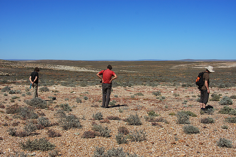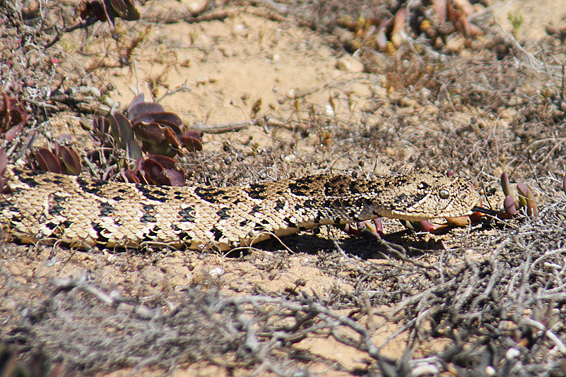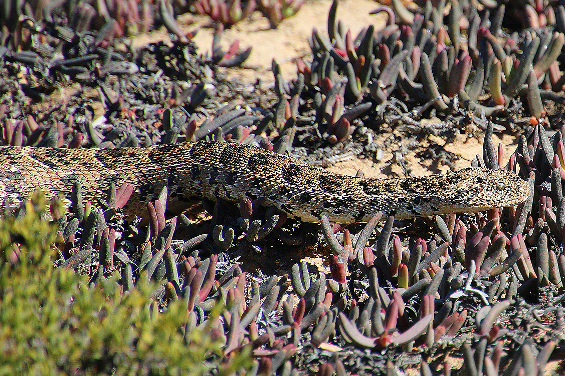 Heinz und ich sind zwar nicht gerade begeistert, können die anderen aber durchaus verstehen: sie wollen einfach endlich das Meer, sprich unsere Campsite, erreichen und in maritimer Umgebung ihre Seele baumeln lassen. Meer, Strand und Wasser an den Füßen punkten leider mal wieder mehr als windig-trockene Ebenen mit schnöden Pflanzen – und Sand im Gesicht. Seufz! Doch es ist ja nicht aller Tage Abend und morgen haben wir sicher mehr Zeit und Muße, die örtliche Botanik in Augenschein zu nehmen. Gönnen wir also unseren strandaffinen Mitreisenden ihr Meeresglück! Brav steigen wir wieder ins Auto und juckeln weiter Richtung Campsite. Doch bereits nach wenigen Kilometern müssen wir erneut stoppen. Schuld sind diesmal nicht Heinz und ich, sondern eine stattliche Puffotter, die vor unserem Wagen die Pad überquert! Das lassen wir uns natürlich nicht entgehen – eine leibhaftige Puffotter in Aktion und aus der Nähe! Wir verlassen die Autos und folgen der Schlange, selbstverständlich in gebührlichem Abstand. Sie ist eine echte Schönheit: makellose Schuppen zeichnen ein hübsches Muster in unterschiedlichen Brauntönen, unter dem sich mächtige Muskelstränge präzise bewegen, der Kopf ist ziemlich massig, die Augen blitzen lebendig und sehen doch irgendwie tot aus, die schmale, gespaltene Zunge züngelt eifrig und der armdicke Körper windet sich fast lautlos über den dicht bewachsenen Boden. Wir sind fasziniert und beobachten das beeindruckende Reptil, bis es in einem filzigen Gestrüpp verschwindet und wir es aus den Augen verlieren. Nun ist es wohl besser, wieder in die schützenden Autos zu klettern, denn eine Schlange, die man nicht mehr orten kann, ist uns nicht geheuer. Vorsichtig staksen wir also zum Fahrweg zurück, starten erneut und erreichen bald darauf ohne weitere Zwischenfälle die so schmerzlich herbeigesehnte Campsite nebst pittoreskem Ozean und ohrenschmeichelnder Brandung.