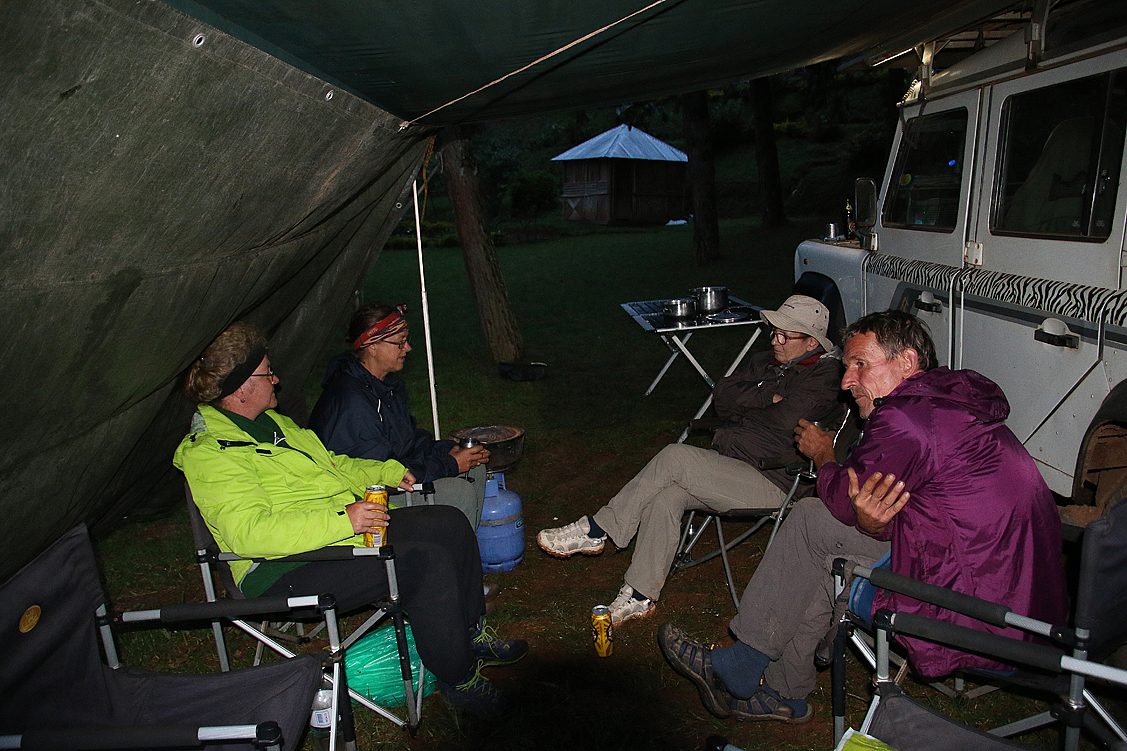 Und schon fallen die ersten Tropfen vom Himmel. Rasch verstauen wir alles, was nicht nass werden soll, in Zelten und Autos und verräumen uns selbst unter dem Gazebo. Keine Sekunde zu früh! Der Himmel verfinstert sich zusehends, die düstere Regenfront geht nahtlos in eine ebenso düstere Dämmerung über, es wird ungemütlich kalt und wir widmen uns, in Windjacken und wärmende Anoraks verpackt, der Zubereitung des Abendessens. Selbiges nehmen wir wenig später mit eingezogenen Köpfen zu uns und hatten uns eigentlich auf einen anschließenden gemütlichen Abend gefreut, doch daraus wird nichts. Die Gazebo-Plane, nass und schwer vom Wasser, schlägt ständig klatschend gegen unsere Hinterköpfe, unter unserem Tisch hat sich ein beachtlicher See gebildet, der Zufluss des temporären Gewässers durchweicht Annettes und Jochen Schuhe, der Abfluss zum Ausgleich die unsrigen. Jeder Klogang hinter der Gazebo-Wand artet zur Volldusche aus, der offerierte Sanitär-Bungalow ist ohnehin unerreichbar, da man, um dort hin zu gelangen, erst einen steilen Erdhang erklimmen muss, dessen Flanken momentan wie Schmierseife sind, und auch der Weg zum Waschhäuschen, mal abgesehen vom pladdernden Regen, birgt das Risiko der Überquerung einer brodelnden Abflussrinne, die das Wasser nicht mehr fassen kann, da sie ja mit Bauholz verstopft wurde. Der Gedanke, noch etwas zu trinken und sich dann, aufgrund einer sich vehement meldenden Blase, wieder aus dem gerade aufgewärmten Schlafsack herausschälen zu müssen, lässt uns diesen Abend folglich schnell beenden. Gute Nacht, Lake Bunyonyi, du hast uns nicht wirklich glücklich gemacht!