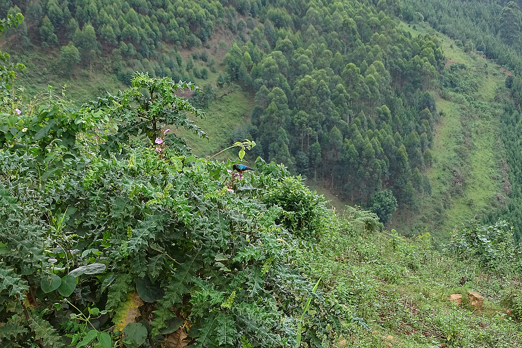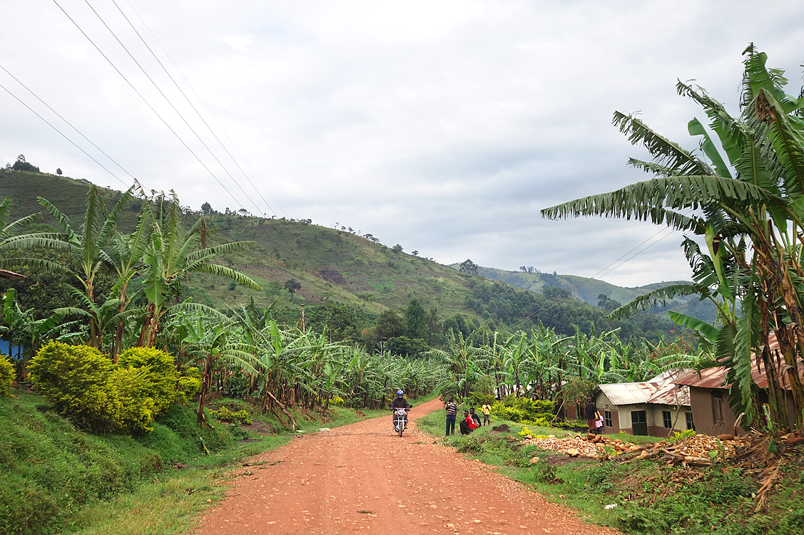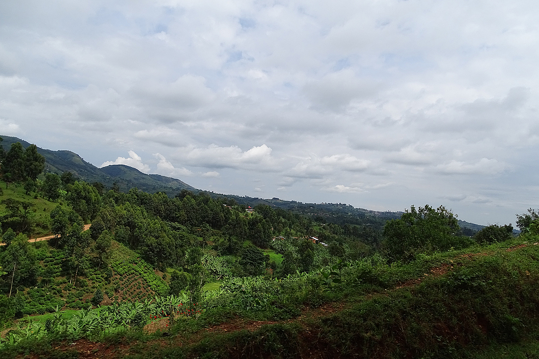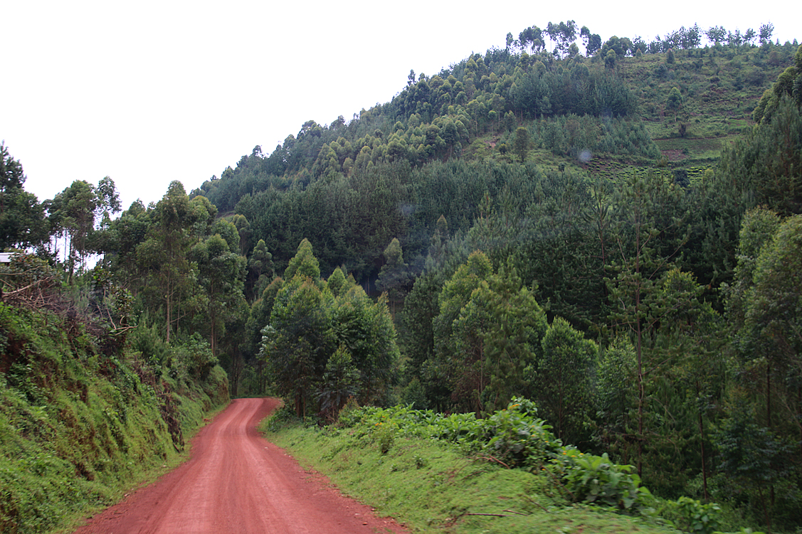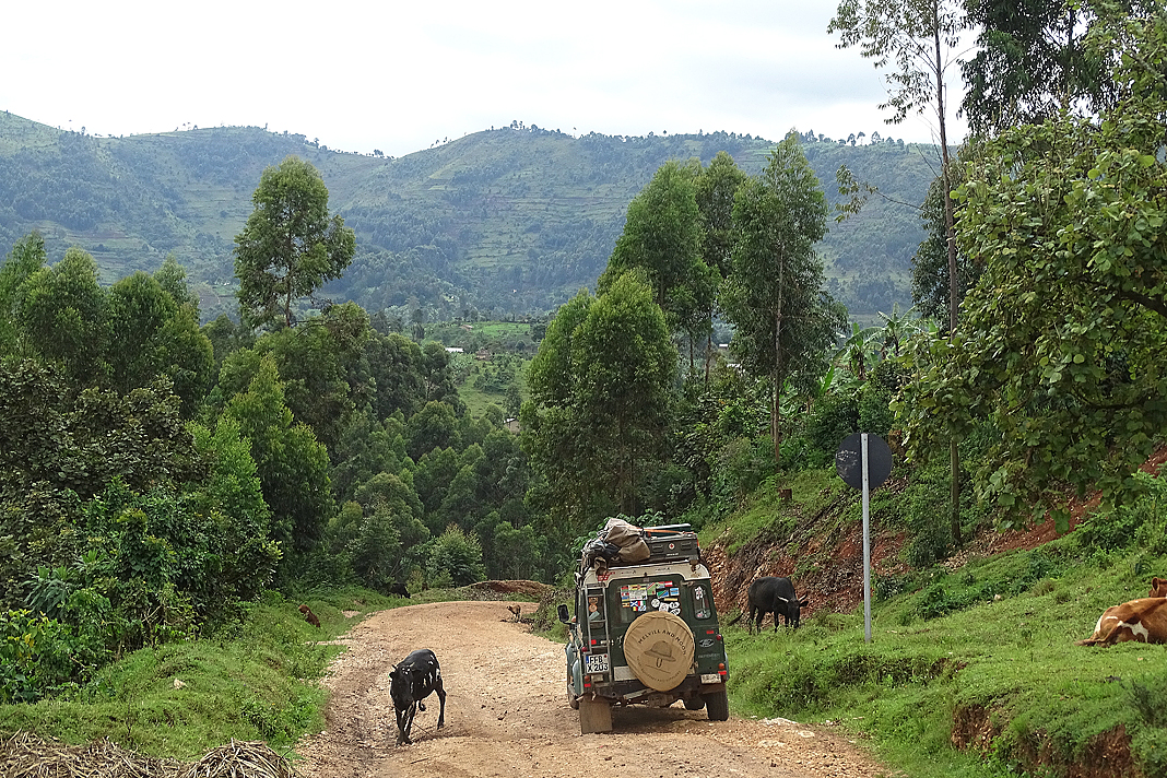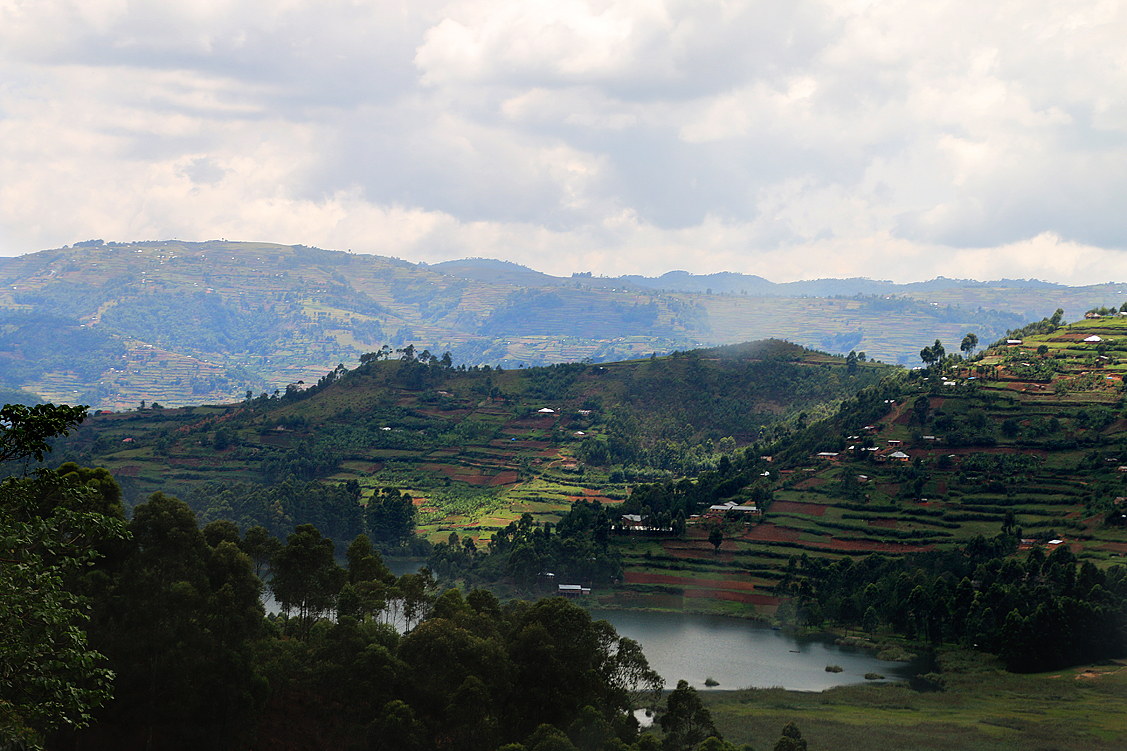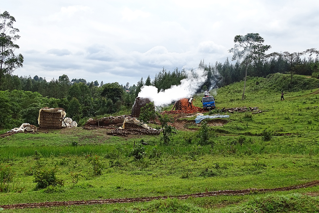 Nach dem Frühstück jedoch bin ich noch guter Dinge, wir schleppen die Küchenkisten zum Auto hoch, verstauen unsere Habseligkeiten und machen uns anschließend auf den Weg zum Lake Bunyonyi, der in etwa eine halbe Tagesfahrt entfernt ist. Entsprechend gemächlich nehmen wir die heutige Tagestour in Angriff und kurven zunächst durch eine abwechslungreiche Berglandschaft, die uns manchmal fast nachhause zurückversetzt: schwarzweiße Kühe weiden auf sanften, grasigen Hügeln, kleine Kiefernwäldchen säumen hin und wieder die Straße – nur die Menschen, die überall unterwegs sind und zahlreiche, rauchende Köhlerhaufen erinnern uns immer wieder daran, wo wir wirklich sind.
