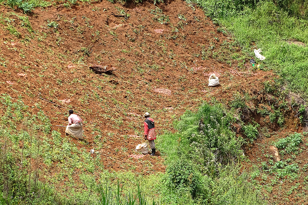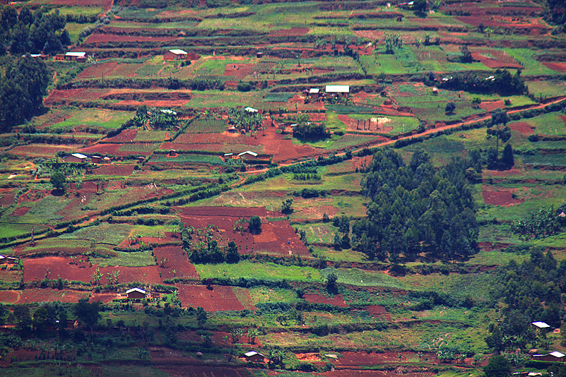 Vorsichtig und mit deutlich gedrosselter Geschwindigkeit zockeln wir weiter nach oben, bis sich, nach einigen Kilometern, der Kiefernwald zur rechten Seite lichtet und den Blick auf ein dörflich besiedeltes Tal freigibt. Entschlossen steigt Jochen in die Bremsen, nicht ohne sich vorher vergewissert zu haben, dass uns der nervig-stumme Pannenbeobachter nicht gefolgt ist. „So, Pause! Und jetzt geh ich auch mal pinkeln! Annette, gibt’s noch ein Problem?“ Annette schüttelt den Kopf und hebt zu einer näheren Erklärung an, doch Jochen ist schon im Gebüsch verschwunden und hat die Schnauze offensichtlich gründlich voll. Ich kann’s verstehen… Nicht nur von seiner Warte aus, sondern auch, weil ich ein ähnlich nerviges Problem habe: seit heute Morgen nämlich zickt mein Objektiv. Das Zoom lässt sich nicht mehr stufenlos verstellen, es hakt, es schleift und klemmt und der Zoomring fühlt sich an, als wäre er in Sand getaucht und anschließend festbetoniert worden. Seufzend lege ich meine Kamera beiseite und nehme mir vor, das gute Stück heute, wenn wir am Lake Bunyonyi angekommen sind, in Ruhe einer gründlichen Untersuchung zu unterziehen. Es kann ja nicht so schlimm sein, denke ich noch, als der Autofokus willig scharfstellt und ich ein letztes Testfoto schieße…