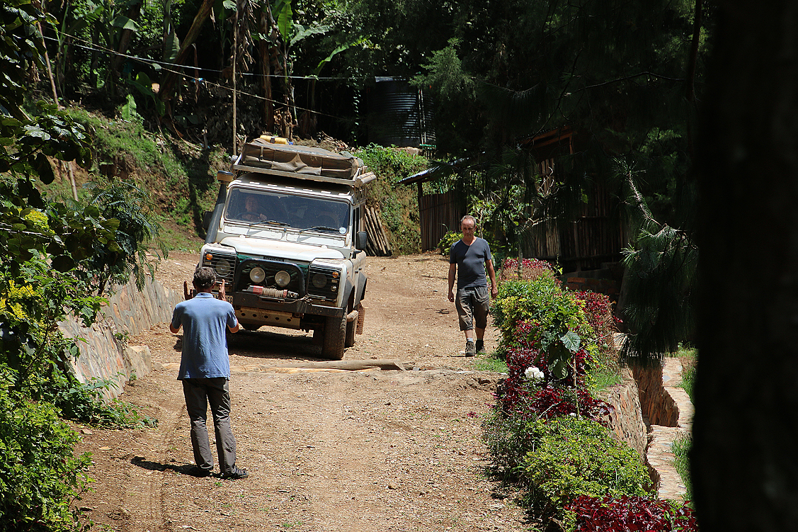 Jochen hüpft wieder aus den Auto, begutachtet abermals das gestapelte Holz und winkt dann Annette herbei: „Du kannst drüber!“ Seine Gattin, die eigentlich gehofft hatte, Jochen würde die Fahrt übernehmen, beißt in den sauren Apfel und schickt sich seufzend an, nun ebenfalls über die gefüllte Rinne zu holpern. Der Wagen schaukelt und schwankt, ächzt und knarrt, doch alles geht gut und Minuten später steht Annettes Landy heil neben Jochens. Das wäre für heute erst mal geschafft – an morgen, wo wir das Ganze wieder nach oben müssen, will Annette jetzt nicht denken. Aufatmend schwingt sie sich aus dem Auto, als einer der Angestellten auf uns zueilt, um uns über die sanitäre Lage vor Ort aufzuklären: Also, auf halber Strecke zum Parkplatz, die zu überquerende Rinne inklusive, gäbe es neu gebaute Örtlichkeiten, die allerdings nicht sonderlich luxuriös wären. Aber weil wir den Graben so heroisch überwunden hätten und ohnehin, bis auf ein junges Paar, die einzigen Gäste wären, würde er uns einen der Bungalows öffnen, da könnten wir dann Bad und Toilette nutzen. Der Bungalow jedoch, so setzt er zögerlich hinzu, sei noch nicht ganz fertig… Verwundert und leicht amüsiert nehmen wir seine Offerte zur Kenntnis, danken ihm herzlich und beschließen, uns später mit diesem Problem zu befassen. Erst nämlich müssen wir unser Camp errichten und wohl auch das Gazebo aufbauen, denn am Himmel dräuen schon wieder regenschwangere Wolken. Als das vollbracht ist, stehen weitere Dinge an. Jochen nimmt den weißen Land Rover unter die Lupe und versucht zu erkunden, warum die Bremsen zicken und Temperaturanzeige spackt und ich mache mich an meinem störrischen Objektiv zu schaffen. Relativ zeitgleich beenden wir unsere Inspektionsarbeiten wieder – Jochen kann nicht herausfinden, woran es liegt, ich dagegen schon: offenbar hatte der Mitnehmer des Fokusrings eine schwere Macke abbekommen, die sich nun, im Zuge meines semi-einfühlsamen Testprogramms, zum Totalschaden ausgewachsen hat. Jetzt geht gar nichts mehr! Na super! Doch ich darf mich nicht beschweren. Die Kamera hat am Gorilla-Tag noch brav ihre Dienste verrichtet, Heinz bietet mir sofort an, seinen Apparat fortan mit mir zu teilen und ich bin, mit dieser großzügigen Option im Hintergrund, gar nicht so traurig, den Rest des Urlaubs zur Abwechslung mal weitestgehend ohne Technik vor dem Auge zu verbringen. Es gibt doch fast nichts Doofes, was nicht auch seine guten Seiten hätte.