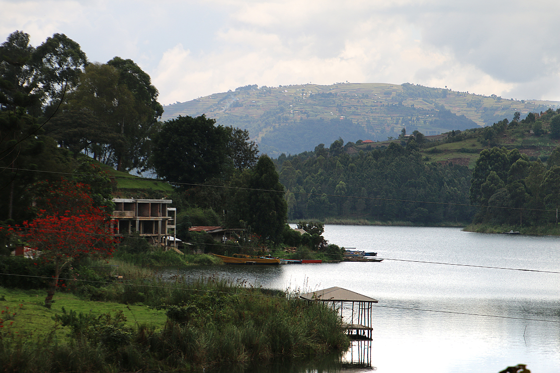 Ohne weiteres Bedauern packe ich meine ausgeknockte Kamera in die große Reisetasche im Laderaum und nehme unser Camp linsenfrei in Augenschein. Mhm, sieht wirklich nett und gepflegt aus hier. Es gibt einen kleinen Steg, eine hübsche Uferbepflanzung, in der sich zahlreiche Vögel tummeln, ein nettes, zum See hin offenes Restaurant und mehrere zweistöckige Bungalows, die sich an einen steilen Hang hinter uns schmiegen. Eigentlich gibt es nichts zu Meckern, nur ich finde natürlich doch etwas. Ich hatte mich ja sehr auf den malerischen Lake Bunyonyi gefreut, muss aber leider feststellen, dass er sich nicht wirklich von Seen in unseren Breiten unterscheidet: Ufergrundstücke sind nun mal heiß begehrt und das führt dazu, dass man nirgendwo so richtig an das Gewässer herankommt. Überall versperren einem Zäune den Weg und Gebäude die Sicht; am Starnberger wie auch am Bunyonyisee! Ich bin schon fast am Überlegen, mir ein Kanu zu mieten (auch sowas bietet unser Ressort an), um mir vom Wasser aus einen besseren Überblick zu verschaffen, als mich die dunklen Wolken und eine gerade aufkommende, strenge Brise dann doch davon abhalten. Besser nicht, das könnte eine stürmische Angelegenheit werden!