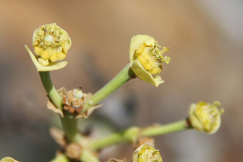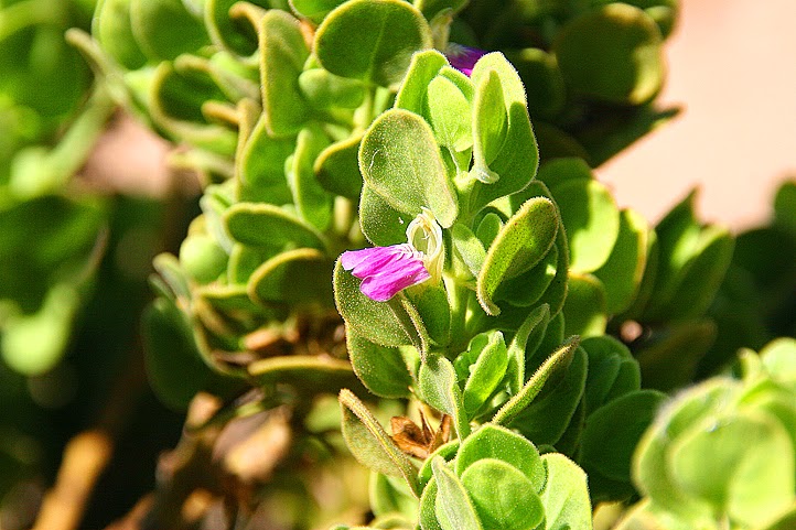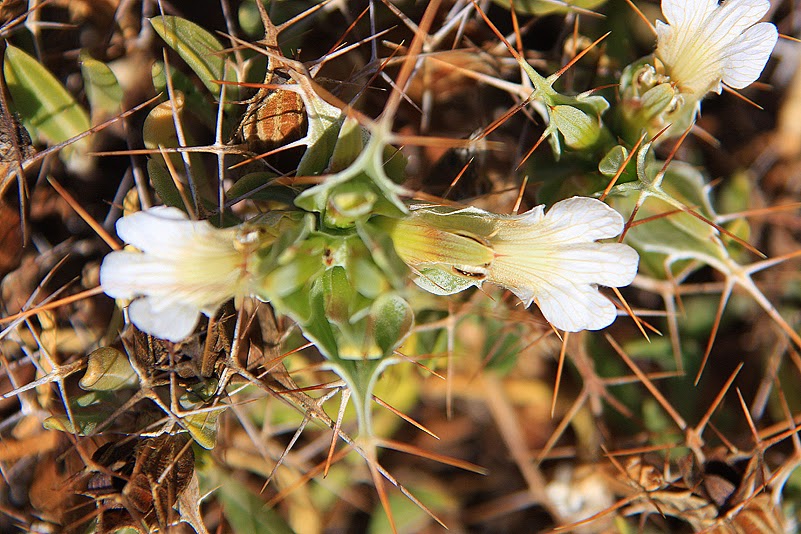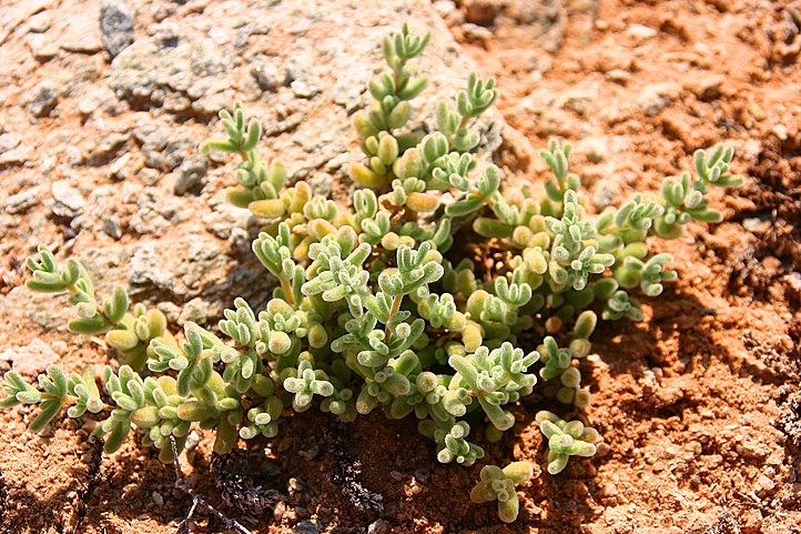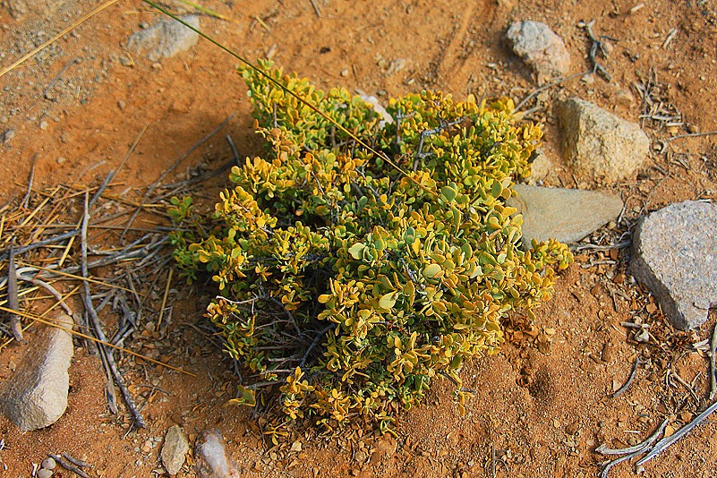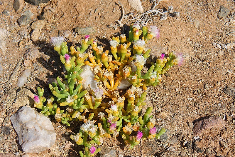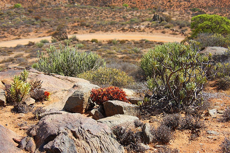 So überqueren wir Bergrücken, die uns sagenhafte Blicke auf die wiederum nächsten Bergketten ermöglichen, wellblechen durch kleine, felsige Täler, die zahlreiche Pflanzenspezies beherbergen und gleichzeitig die Sicht auf unglaublich strukturreiche und farbenfrohe Hügelketten freigeben. Immer wieder müssen wir deshalb stoppen, staunen und auf Erkundungstor gehen. Hier leuchtet uns ein Bergrücken entgegen, der im oberen Drittel völlig vegetationsfrei ist, unterhalb eines querlaufenden Doleritbandes aber zahlreiche Köcherbäume präsentiert. Dort entzückt uns ein breiter, talartiger Absatz, von dem aus man weit gen Osten sehen kann. Ein paar Kilometer weiter landen wir dann erneut in einer völlig anderen Welt: ein kleines, tiefsandiges Halbtal, hoch oben in den Bergen, beschenkt uns mit einem Mikrokosmos pflanzlicher Art. Hier gedeihen Aizoaceen, Zygophyllaceen und anderes sukukkulentes bzw. semisukkulentes Kraut in trauter Eintracht nebeneinander. Klebrige Jamesbrittenias recken uns aus rotverstaubten Blätterkissen ihre winzigen, zweifarbigen Blüten entgegen, farbenfrohe, stressverfärbte Prenias erfreuen uns mit ihren pastellig-bunten Blattrosetten und uns völlig unbekannte Jochblattgewächse in hochgeschossener Strauchform stellen uns vor neue Bestimmungsrätsel. Wenig später landen wir schließlich bei den felsigen Vorboten des Helskloof Passes, der für seine einzigartigen Vorkommen der hochendemischen Aloe pearsonii bekannt ist. Bevor wir diese jedoch zu sehen bekommen, passieren wir zahlreiche Hügel rechts und links der Pad, die Heinz und mich in ihren Bann ziehen. Am liebsten würden wir uns hier für den Rest unseres Urlaubs aussetzen lassen! Es ist atemberaubend, unglaublich, nicht zu fassen. Annette und Jochen hingegen werden mit jedem von uns gewünschten Stopp ungeduldiger, unruhiger. Wir müssen heute noch rüber nach Namibia, mahnen sie uns. Ja, ja, ist ja gut, wissen wir! Trotzdem haben wir doch Zeit!