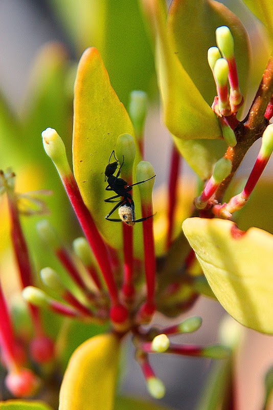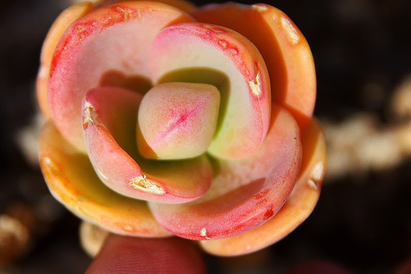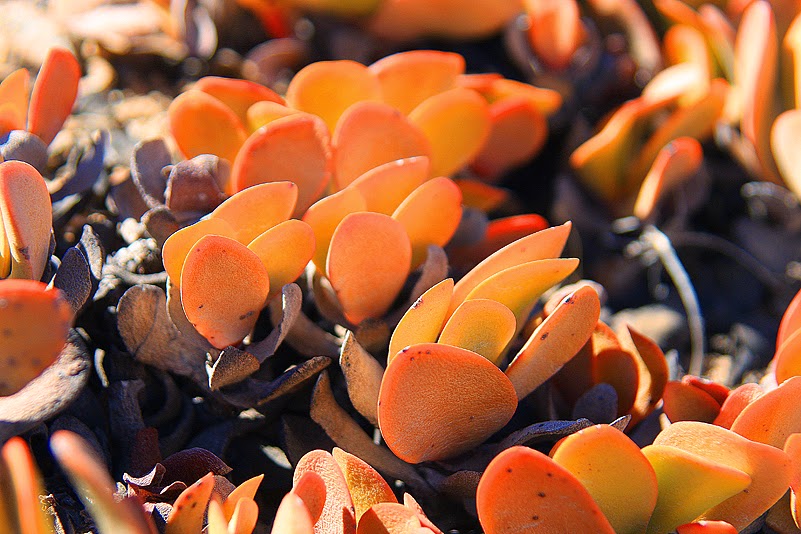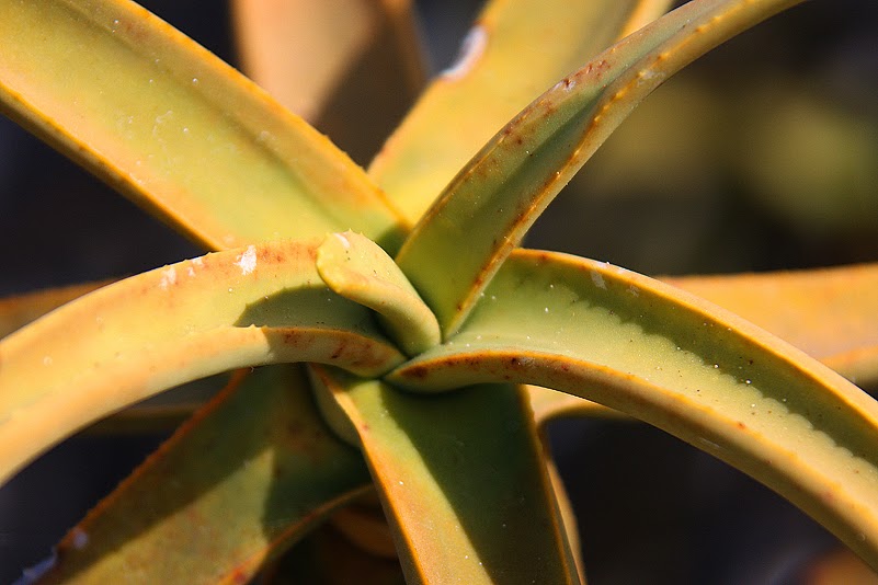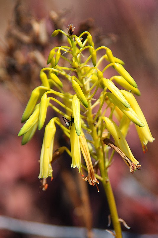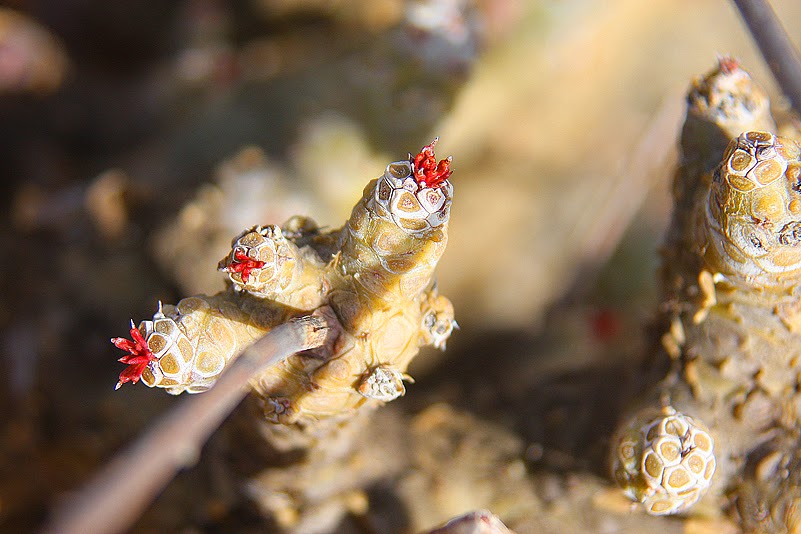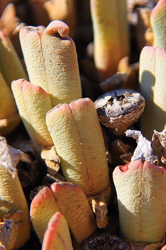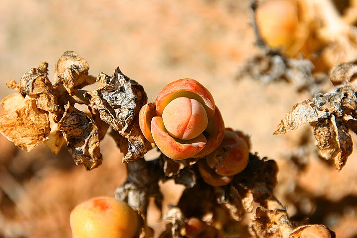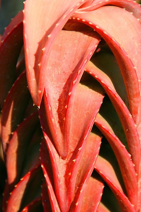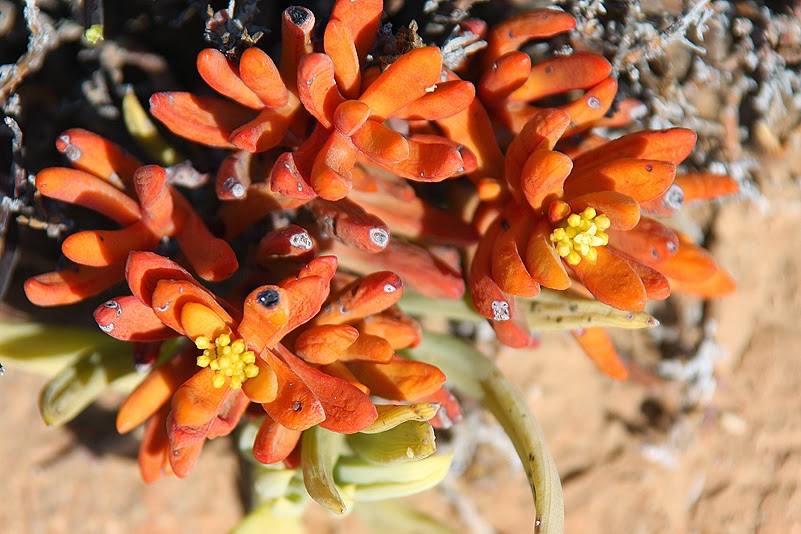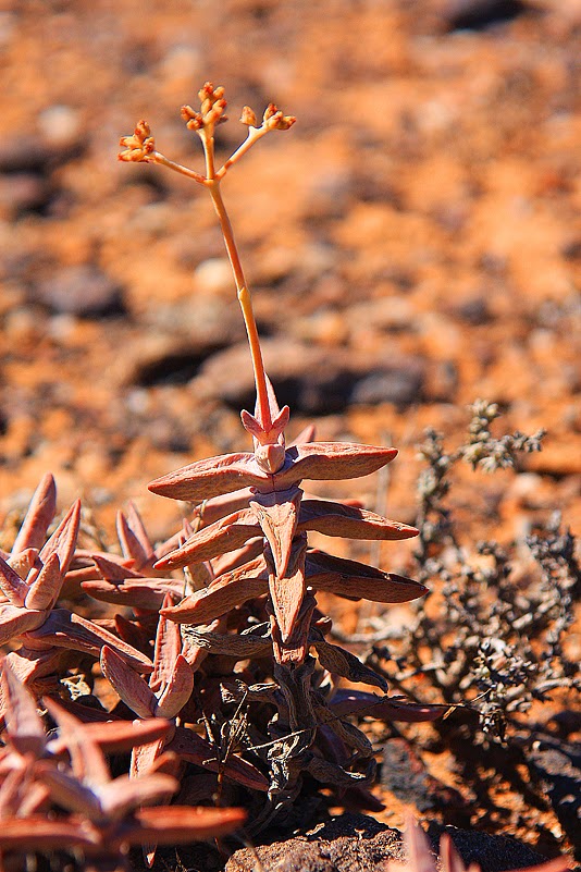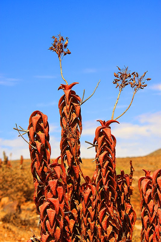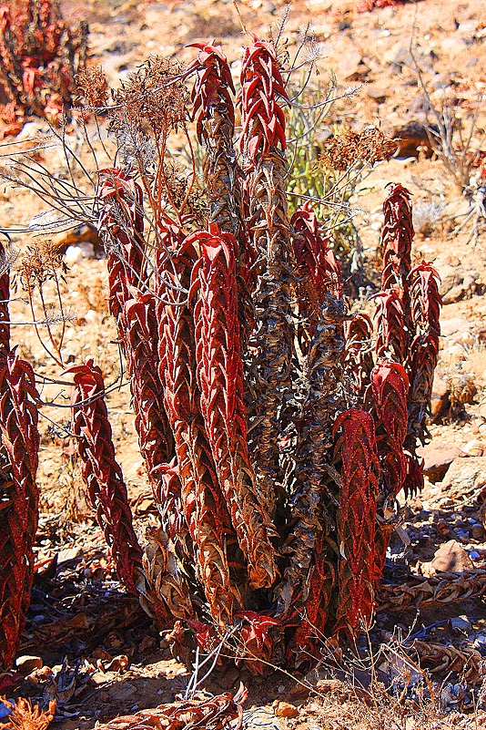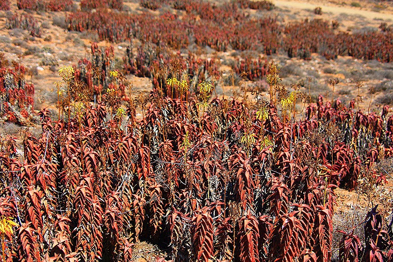 Unserem Wunsch wird seufzend stattgegeben und Heinz und ich stürzen sofort gespannt zu den Pflanzen, um sie genauer zu inspizieren. Und es ist ein erhebender Moment, persönlich und höchstselbst vor diesen Aloen zu stehen, deren Sichtung der Traum zahlreicher Sukkulenten-Begeisterter ist. Sie kommen nur in einem sehr begrenzten Gebiet entlang des Oranje-Tals vor, was natürlich einen großen Teil des Reizes ausmacht und sind damit, auf die gesamte Vegetation der Erde hin gesehen, so etwas wie ein Diamant. Ein roter noch dazu, ein ziemlich roter sogar! Die Farbe der Aloen ist der zweite Punkt, der sie so spektakulär macht: unter der Belastung der täglichen Sonneneinstrahlung verfärben sich die ursprünglich grünen Blätter der Sukkulenten in ein sattes Rot. Ein Rot, dessen Nuancen zwischen sonnenreifen Tomaten, vollmundigem Burgunder und dem Fruchtfleisch erfrischender Wassermelonen variieren. Die Exemplare, die wir gerade bewundern, schwanken farblich zwischen Melone und Tomate, und sind, als Einzelpflanzen betrachtet, nur bedingt als Schönheiten zu bezeichnen. Lange Stängel, in der unteren Hälfte mit trockenem, unansehnlich braunem Gekröse bestanden – erst darüber zeigen allmählich die saftig-dicken Blätter, die in einer kreuzständigen Rosette, gesäumt von zart elfenbeinfarbenen Zähnchen, ihre Krönung finden. Und ich gebe zu: man muss schon ein ausgesprochenes Faible für derartige Gewächse haben, um ihren Zauber aus dieser Nähe in vollen Zügen empfinden zu können. Aber gerade so kann man auch Details entdecken, die nicht nur den botanisch Interessierten begeistern.