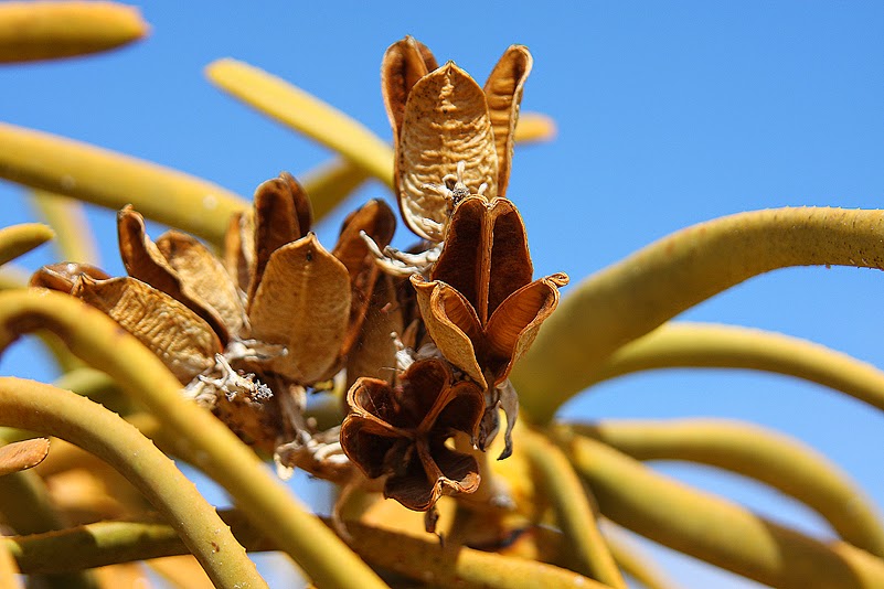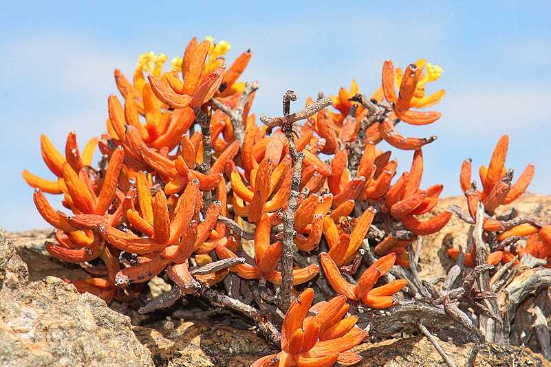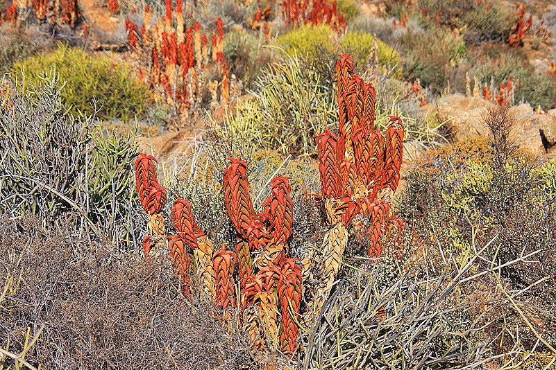Heinz und ich beenden die Inspektion der roten Aloen mit einem genussvollen Lächeln auf den Lippen, klettern wieder ins Auto und freuen uns, den Sukkulenten so nahe gekommen zu sein. Auf den nächsten Kilometern entfalten die Aloen dann aber ihren wahren Zauber, der auch unsere beiden Freunde voll in ihren Bann zieht. Die kargen, schroffen, bräunlichen Bergketten des unter der Dürre stöhnenden Helskloof Passes liegen nach ein paar weiteren Kurven plötzlich vor uns – und erglühen in allen nur erdenklichen Rottönen. Es sind ganze„Wälder“ der seltenen Pearsonii-Aloen, die dieses solitäre Farbspiel erzeugen; ein Leuchten, das nahezu magisch erscheint. Rote Raritäten unter blauem Himmel – ein einmaliger Anblick! Annette ist so hingerissen, dass sie es ist, die den nächsten Stopp erbittet. Dann stehen wir alle da und saugen dieses Gemälde in uns auf. Und es gibt sogar noch einige blühende Exemplare, deren gelbe Blütendolden einen weiteren Akzent in diesem unfassbaren, betörend schönen Farbenmeer setzen. Annette und Jochen sind begeistert. Heinz und ich nicht minder – spätestens jetzt wissen wir ganz sicher, dass das zwar unser erster, nicht aber unser letzter Besuch hier gewesen sein wird. Und der nächste wird ausführlicher, länger, ohne Zeitdruck – koste es, was es wolle! Helskloof, die Höllenschlucht, sollte besser in„Paradyskloof“ umbenannt werden; und das nicht nur wegen der roten Groß-Endemiten…