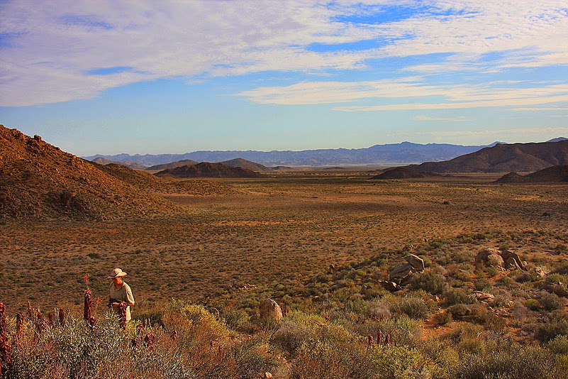Es gibt drei Spezies von Baum-Aloen hier im Richtersveld: die weitverbreitete „Dichotoma“, die reich verzweigte „Ramosissima“ und die vergleichsweise seltene „Pilansii“. Gerne würden wir natürlich einmal eine echte „Pilansii“ zu Gesicht bekommen, doch auch nach gründlicher Inspektion der Kloof-Aloen sind wir nicht sicher, was wir hier tatsächlich vor uns haben. Die Wuchsform könnte passen. Könnte. Es könnte sich aber auch um sehr schlanke „Dichotomas“ handeln oder aber um Hybriden. Das macht die Bestimmung echt schwer – die drei Aloe-Arten sind nämlich in der Lage, sich gegenseitig fruchtbar zu bestäuben. Die daraus resultierenden Natur-Hybriden zeigen dann Merkmale beider Eltern; mal dominiert die Mama, mal der Papa. Und bei Hybriden aus „Dichotoma“ und „Pilansii“ ist das Resultat gerne mal extrem uneindeutig, weshalb wir auch jetzt zu keinem sicheren Ergebnis kommen. Na ja, egal, fahren wir weiter! Über die Springbokvlakte kurven wir zunächst gen Westen, überqueren dann erneut das trockene Bett des Gannakouriep und durchfahren danach viele uns noch unbekannte Gegenden meines Lieblings-Nationalparks. Und sie alle sind sehr viel reizvoller als die Strecken hinab zum Oranje, so stellen Heinz und ich unisono fest! Das Warum ist ganz einfach zu erklären: auf der Fahrt Richtung Westen dominieren Berge, die breiten, sandigen Flusstäler hingegen verengen sich und verschwinden schließlich ganz. Und das, was sich einem hier darbietet, ist sowohl in botanischer als auch landschaftlicher Hinsicht ein Kleinod – eines nach dem anderen, eines deutlich anders als das vorhergehende.