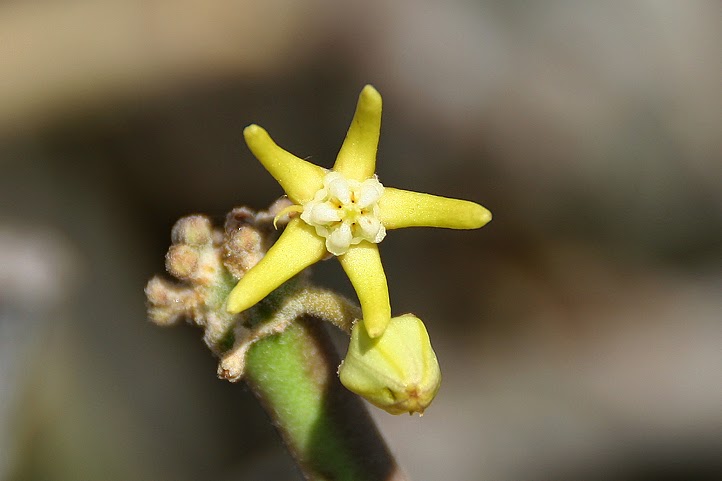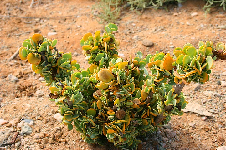 Relativ erwartungsfrei biegen wir auf das Farmgelände ab, durchqueren die ersten Kilometer – und werden immer gespannter: wir sind hier offensichtlich nicht irgendwo auf einem popeligen Gästefarmgelände gelandet, sondern scheinen gerade ein Richtersveld im Miniaturformat zu durchqueren! Mit dem einen Unterschied: wir befinden uns in einer Art von sandigem Tal – Täler, die im Richtersveld beinahe vegetationslos daher kamen. Hier aber protzt die Natur mit unzähligen Sukkulenten – Hoodias, Ruschias, Stoeberias und andere Etceteras wachsen dicht an dicht! Heinz und ich sehen uns vielsagend an und werden, mit Blick auf die uns umgebenden Berge, ganz zappelig. Ungeduldig erwarten wir unsere Ankunft im Restcamp, errichten dort rasch das Lager, gönnen uns noch ein kühles Getränk, dann aber hält uns nichts mehr. Während Annette und Jochen ermattet in ihre Camping-Stühle sinken, sausen wir beide los: hinter dem Camp ist ein kleiner Wanderweg ausgeschildert, der auf einen felsigen Hügel hochführt. Dieser Hügel sieht von unten recht harmlos aus, je höher wir allerdings klimmen, desto schweißtreibender wird die ganze Angelegenheit. Aber wir nehmen die Anstrengung beinahe nicht wahr, denn der Hügel enttäuscht unsere Erwartungen nicht und präsentiert uns einen Mikrokosmos zahlreicher Sukkulenten. Was hier nicht alles wächst! Hoodias, Namaquanum-Pachypodien, Pearsonii-Aloen, Sisyndites, Tylecodons, Crassulaceen – und sogar einige Pflanzen, die wir nicht mal im Richtersveld gesehen hatten! Heinz und ich sind im Glück. Stundenlang klettern wir in diesem steinigen Paradies umher – der ausgeschilderte Wanderweg hat sich schon lange im Meer der sukkulenten Blätter verloren – und genießen unser kleines, üppiges, nachträgliches Mini-Richtersveld in vollen Zügen.