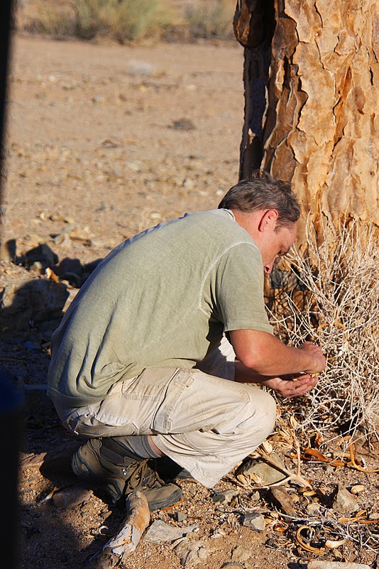 Trotz dieser tröstenden Gedanken fühle ich erneut den Zorn in mir hochwallen. Nein, Frau Schneider, nein, jetzt ist Schluss! Heute ist unser letzter Tag im Richtersveld und den möchte ich genießen, ohne mich über Vergangenes, was ich ohnehin nicht mehr ändern kann, aufzuregen. Also atme ich tief durch und vertiefe mich ins Frühstück, freue mich über meine tolle Tasse, die badenden Vögel und den bevorstehenden Trip über den Helskloof Pass, den wir heute zum ersten Mal besuchen werden. Und es gelingt – nach dem Frühstück bin ich wieder völlig entspannt und wir gehen unserem allmorgendlichen Tagwerk nach: packen, aufräumen, abspülen, weiterziehen. Bevor wir jedoch ins Auto klettern, vollbringen wir bedauernd eine letzte Tat – wir entführen den Vögeln unsere Pizzaform. Es fällt uns echt schwer, aber wir werden sicher würdige Nachfolger haben, vielleicht schon bald. Winkend verabschieden wir uns nun von unseren gefiederten Freunden und starten los zu unserer heutigen Tagesetappe. Nach wenigen Kilometern aber ist bereits der erste Stopp angesagt: Heinz möchte sich gerne die wenigen, noch lebenden Köcherbäume genauer ansehen, über deren exakte Klassifizierung wir seit unserer Ankunft im Kokerboomkloof rätseln.
