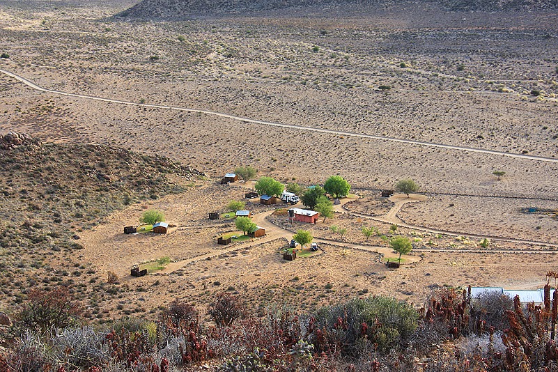 Wir merken kaum, dass die trockene Hitze allmählich einer angenehmen Kühle weicht. Erst, als wir immer genauer schauen müssen, wohin wir unsere Füße setzen, fällt uns auf, dass die Sonne schon fast hinter den umliegenden Bergen verschwunden ist. Zeit, ins Lager zurückzukehren! Vorsichtig bahnen wir uns einen Weg durch das steile Gelände nach unten und erreichen im letzten Tageslicht den Fuß unseres Paradieshügels, von wo aus es nur noch knapp zwei Kilometer bis zum Lager sind. Annette und Jochen, die den Nachmittag faul im Schatten eines Baumes verdöst hatten, sind bereits mit den Vorbereitungen zum Abendessen beschäftigt, als wir endlich wiederkehren und kredenzen uns sogleich ein kühles Bier zum Empfang. Genüsslich lassen wir das himmlische Gebräu durch unsere Kehlen rinnen und erzählen nebenbei von unserem spannenden Ausflug. Dann packen wir mit an und bald steht ein herzhaftes Abendessen auf dem Tisch, das wir uns mit großem Appetit schmecken lassen. Danach sitzen wir alle glücklich und zufrieden in unseren Stühlen, lassen den Tag revue passieren und freuen uns auf das noch Kommende. Zwei Tage im Gebiet der Sukkulenten-Karoo liegen ja noch vor uns, auf die wir uns sehr freuen, dann jedoch wird unser Urlaub einen deutlich anderen Charakter annehmen – und auch darauf freuen wir uns schon tierisch…