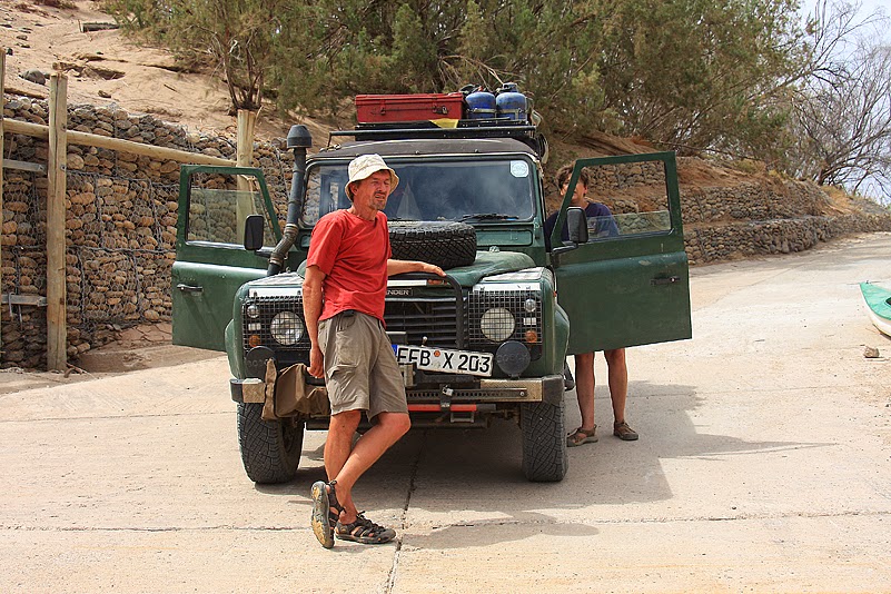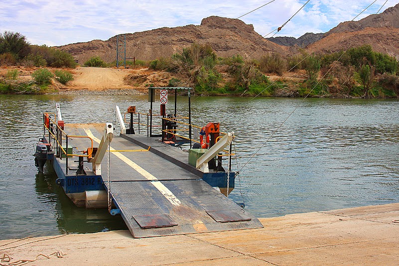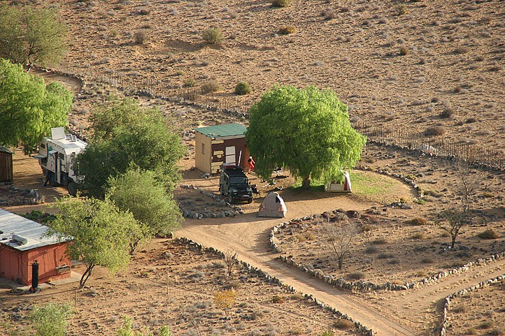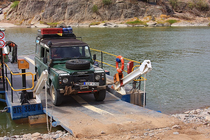 Rasch geben wir Gummi, kurven hinunter zur grenzüberschreitenden Fähre und müssen eine ganze Weile warten, bis das kleine Transportboot endlich von der namibischen Seite ablegt und zu uns herüber tuckert. Schließlich legt die Fähre an, wirft ihre Überbrückungsbleche in die betonierten Platten der Uferbank, Jochen steuert den Landy sicher an Bord, die Bleche werden wieder eingeholt, wir alle mit Rettungswesten bestückt, und fahren ein paar Minuten später auf namibischer Seite erneut vom Boot – die Lamento-Damen hingegen sind noch nicht mal ansatzweise in Sicht… Puh, da hatten wir wohl echt Glück! Denn nun sind wir sicher außer Reichweite dieses martialischen Grenzbeamten und haben nur einen minimalen Verlust zu beklagen – alles andere hingegen blieb unentdeckt: eine Raubvogelfeder aus dem Tanqua, diverse hübsche Kiesel von hier und da und noch ein paar andere Dinge, die dem Herrn sicher große Genugtuung bereitet hätten, wäre er fündig geworden. Ist er aber nicht! Diebisch erfreut setzen wir so unseren Weg fort, stauben am westlichen Oranje-Ufer dahin, Richtung Rosh Pinah. Bald haben wir das Kaff erreicht und erblicken, nachdem wir einige starkstromgesicherte Wohnsiedlungen und umtriebige Minengelände passiert haben, die Abzweigung zur Gästefarm Namuskluft, die unser heutiger Übernachtungsort sein wird.