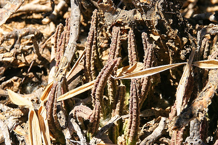 Heinz und ich aber sind unerbittlich, erforschen eine Kuppe nach der anderen: erst den Ramosissima-Hügel, darauf folgt die Crassula-dominierte Anhöhe, kurz danach ein Mikrokosmos aus Crassulas, Asclepien und Asteraceen. Annette stapft anfänglich tapfer mit, begeistert sich wie wir auch, Jochen hingegen bleibt immer öfter gelangweilt beim Wagen und harrt unserer Rückkehr. „Jochen, was ist los mit dir? Warum siehst du dir das nicht auch an. Es ist so wunderschön! Kein Interesse?“, fragt Heinz besorgt.„Ihr klettert ja immer nur rum und erklärt nix!“, brummelt Jochen.„Na, was sollen wir denn erklären? Du musst schon mitkommen und dir die Pflanzen selbst ansehen; dann können wir auch was dazu sagen!“, erwidert Heinz verwundert. Jochen winkt ab. Mhm, wie sollen wir das verstehen? Auf jeden Fall so: Heinz hat unbenommen recht, aber vielleicht sollten wir davon absehen, bei jedem halbwegs grünen Stängel, bei jedem steinigen Hügel auf einen Halt zu drängen. Tja, das wäre wohl ratsam, aber noch sind wir nicht mal direkt am Helskloof Pass angekommen… Heinz und ich beherrschen uns dennoch mit äußerster Kraftanstrengung, was uns für wenige Kilometer tatsächlich so einigermaßen gelingt. Dann aber zeigen sich die ersten Exemplare der hochendemischen Aloe pearsonii. An einer Stelle, an der eine Gruppe der schlanken Aloen besonders gut zugänglich erscheint, brechen wir unseren Vorsatz und erbitten einen erneuten Stopp.