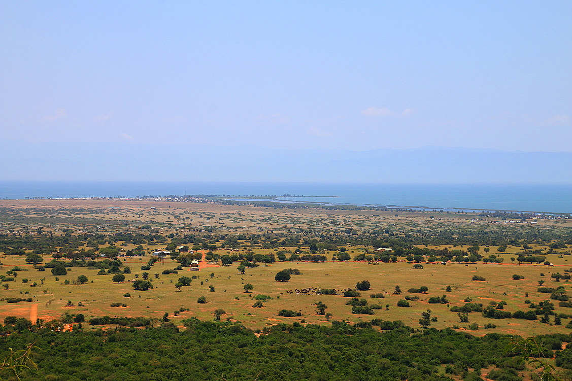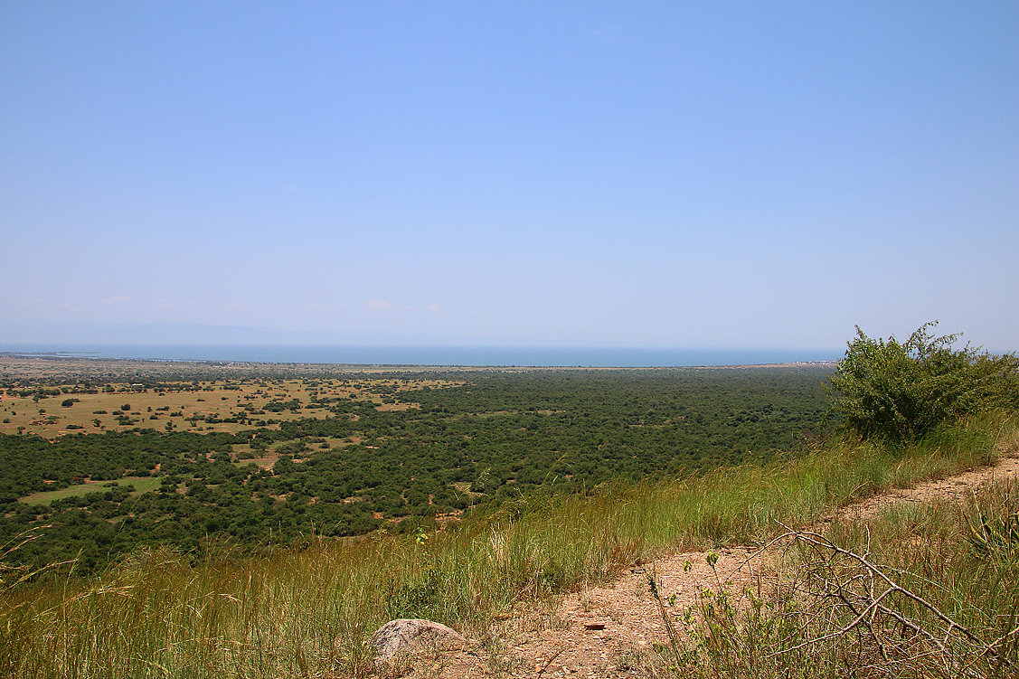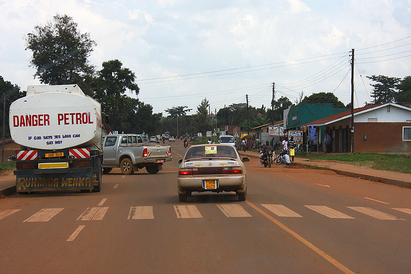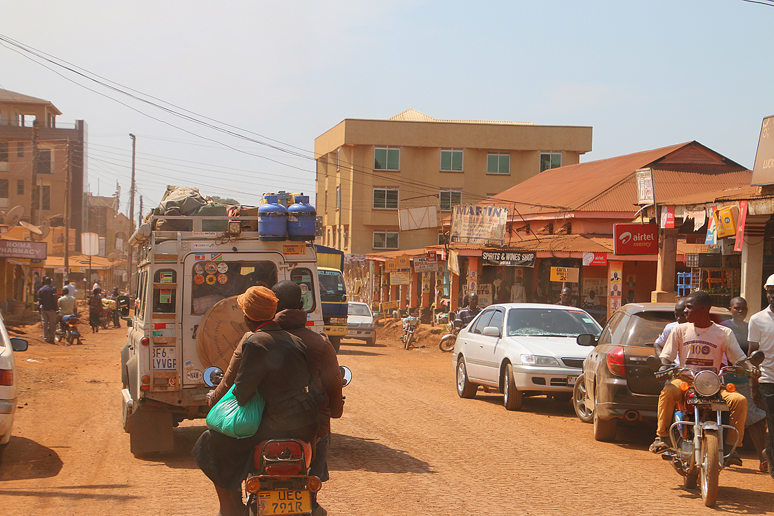 Ich befreie mich gerade von den letzten popelähnlichen Wuzeln, als sich plötzlich doch noch ein sehenswerter Anblick vor uns auftut: wir befinden uns auf einer Anhöhe, der Busch lichtet sich und wir haben für einige Kilometer gute Sicht auf die Wasser des Albertsees, die im frühen Nachmittagslichts gar malerisch glitzern. Entzückt stoppen wir und genießen die unerwartete Aussicht, bevor uns erneut das allgegenwärtige Gestrüpp verschluckt. Nun aber ist es nicht mehr weit. Rasch ötteln wir die letzten 50 Kilometer runter und laufen schließlich in Hoima ein. Die kleine Distrikt-Hauptstadt ist nicht wirklich ein Touristenmagnet, zurecht, doch immerhin gibt es hier ein Kolping Hotel, in dem wir heute zu nächtigen gedenken. Bevor wir jedoch dieses Etablissement anlaufen können, müssen wir noch eine kleine Stadtfahrt absolvieren – unser weißer Land Rover hat seit ein paar Tagen ein Problem mit seiner Zusatzbatterie, die für den Kühlschrank zuständig ist, und deshalb müssen wir dringend eine neue besorgen. Und wenn nicht hier, wo dann!? Eine ganze Weile kurven wir vergeblich durch das wuselige Kaff, bis wir schließlich doch auf einen jungen Mann treffen, der angeblich jemanden kennt, der ebenso angeblich weiß, wo man so etwas noch angeblicher bekommt. Doch der zweite Jemand muss nun erst vom ersten Jemand aufgespürt werden, bevor der Handel über die Bühne gehen kann – der junge Mann verspricht, die Flüsterpost-Kette in Gang zu setzen. Das aber kann dauern. Also entschließen wir uns, erst mal im Hotel einzuchecken, uns zu akkomodieren und später nochmal nachzufragen. Gesagt, getan.