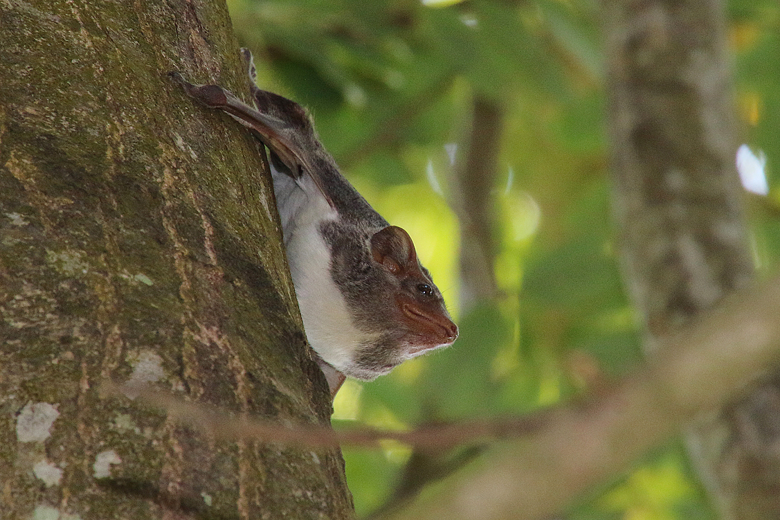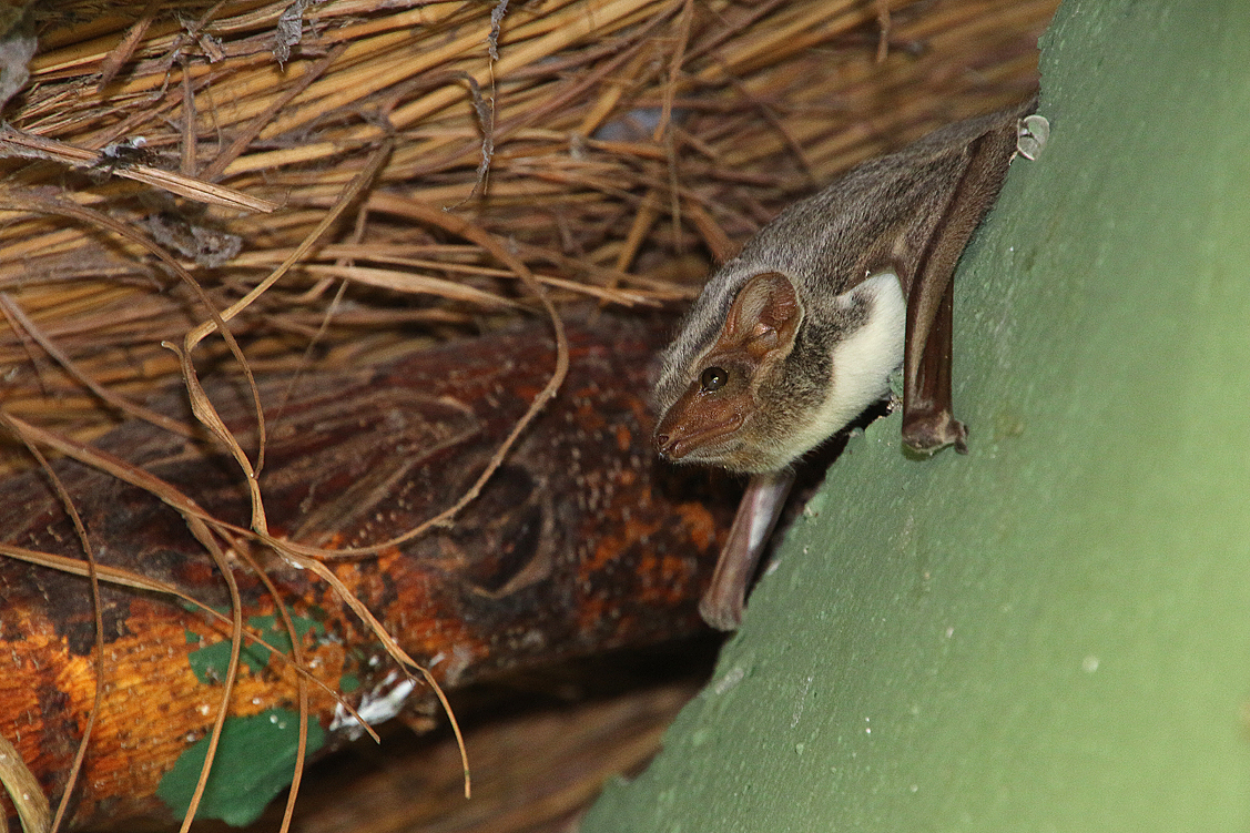 Nach dieser erholsamen Nacht robben wir erneut wohlgemut aus unseren Stoffhäuschen und beginnen ohne Eile den noch jungen Tag. Frühstücken bei wachsamer Warzenschwein-Präsenz, beim Kaffeetrinken Vögel beobachten, dann zusammenpacken und schließlich gemächlich weiterziehen. Nein, halt, so schnell geht das nicht! Denn Erika, die noch einen abschließenden Toilettengang absolviert hatte, entdeckte auf ihrem Rückweg zu uns ein paar Fledermäuse, die sich nach einer anstrengenden Jagd-Nacht zum Schlafen unter einem der Rondavel-Dächer zum Schlafen abgehängt hatten; und die müssen wir natürlich genauer unter die Lupe nehmen. Vorsichtig schleichen wir uns also zu dem Rondavel, auf das Erika aufgeregt deutet und spähen dann gespannt unter das leicht überstehende Strohdach. Ja, da hängen sie – drei knuffige Fellwürste mit transparenten Öhrchen und rosa Mini-Schnäuzchen und schlafen den Schlaf der Gerechten. Der aber scheint nicht besonders tief zu sein, denn zwei der Fledermäuse robben sofort rückwärts unter das schützende Dach, die dritte weicht zur Seite aus und fühlt sich sichtlich unbehaglich. Na, da wollen wir nicht weiter stören!