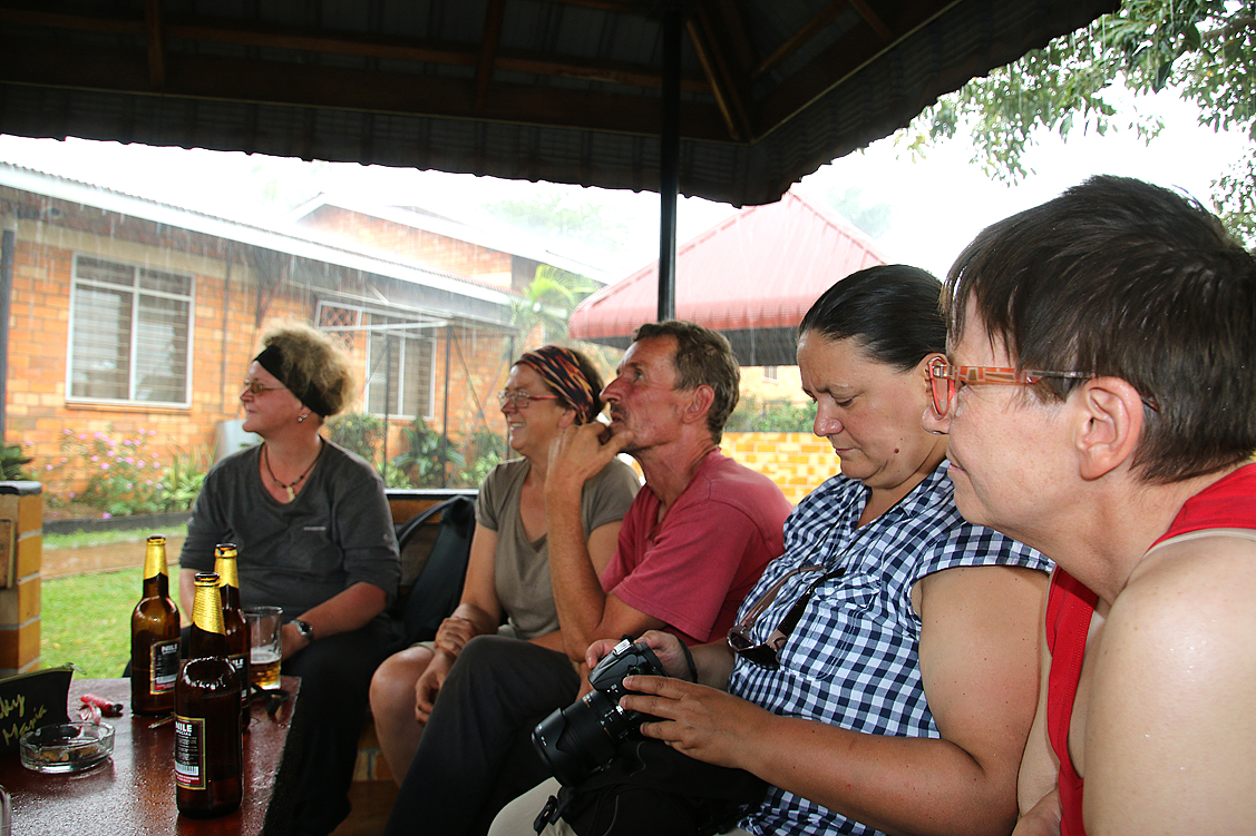 Die Sonne scheint gleißend und heiß vom Himmel, weshalb wir uns in den Schatten eines gemauerten Pavillons zurückziehen und des Kellners harren. Kurz darauf erscheint ein freundlicher Bediensteter, nimmt unsere Bestellung auf, wendet sich zum Gehen und dreht sich dann nochmal kurz um. Ein Gewitter sei im Anzug, es würde gleich regnen, ob wir nicht lieber ins Haus gehen wollten. Gewitter? Bis auf ein paar dunklere Wolken und etwas Wind sind uns keine Warnzeichen aufgefallen. Also verneinen wir dankend und wollen unseren Drink deshalb partout im Pavillon serviert bekommen. Der Kellner zuckt die Achseln, eilt von dannen und kehrt zehn Minuten später wieder. Rasch beglückt er uns mit kühlem Bier und entsprechenden Gläsern, verschwindet dann aber auffällig schnell im Hauptgebäude und lässt uns mit unseren Getränken allein. Kurz danach, wir haben noch nicht mal richtig eingeschenkt, dann plöddert mit einem Male ein Regenguss los, der sich gewaschen hat. Der Himmel, der sich von einer Sekunde auf die andere verfinstert hatte, regnet nun auf unseren Pavillon herab, die Riesentropfen erzeugen einen Heidenkrach auf dem Dach, es blitzt, es donnert, es windet und stürmt und treibt dichte Schwaden sprühender Tropfengischt von allen Seiten unter unser nur noch lückenhaft schützendes Dach. Wir jauchzen vor Freude, wohnen dieser Urgewalt der Natur hautnah, aber dennoch behütet bei und genießen die Himmelsdusche, die so schnell vorüber ist, wie sie angefangen hatte.