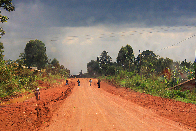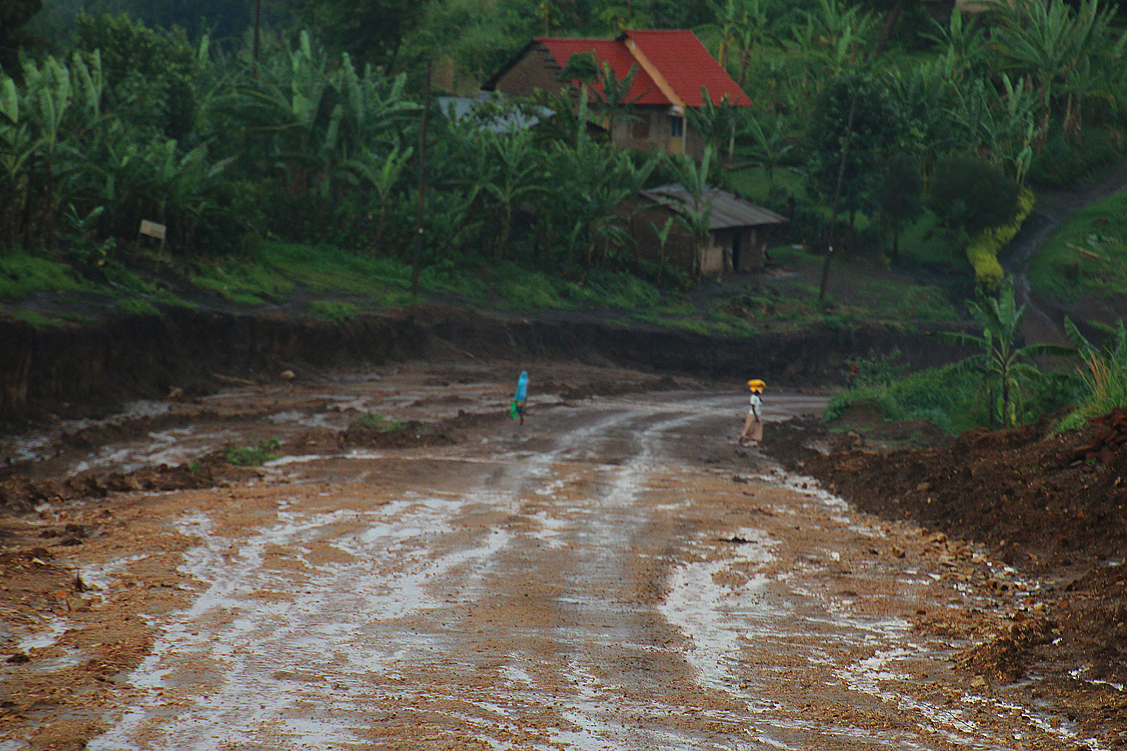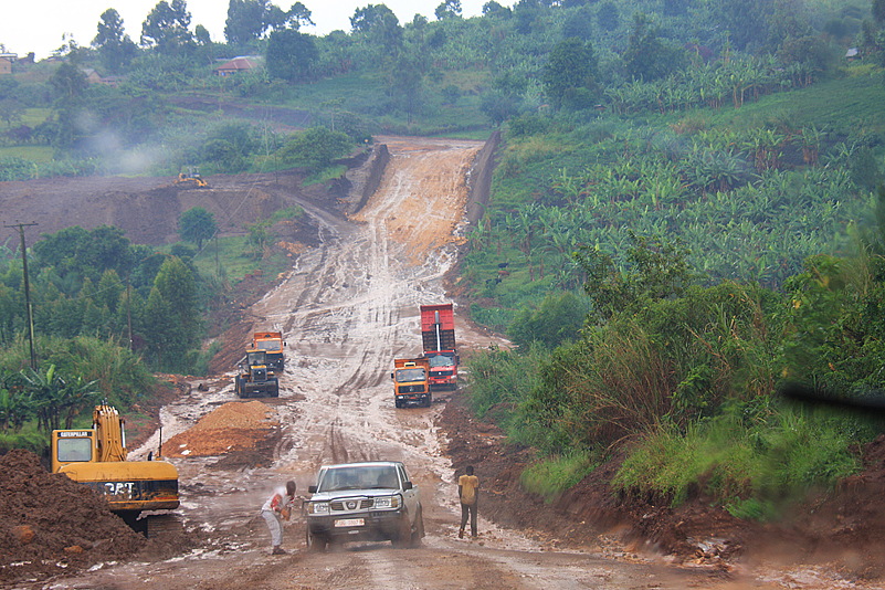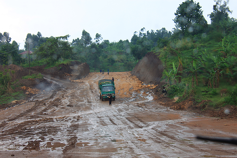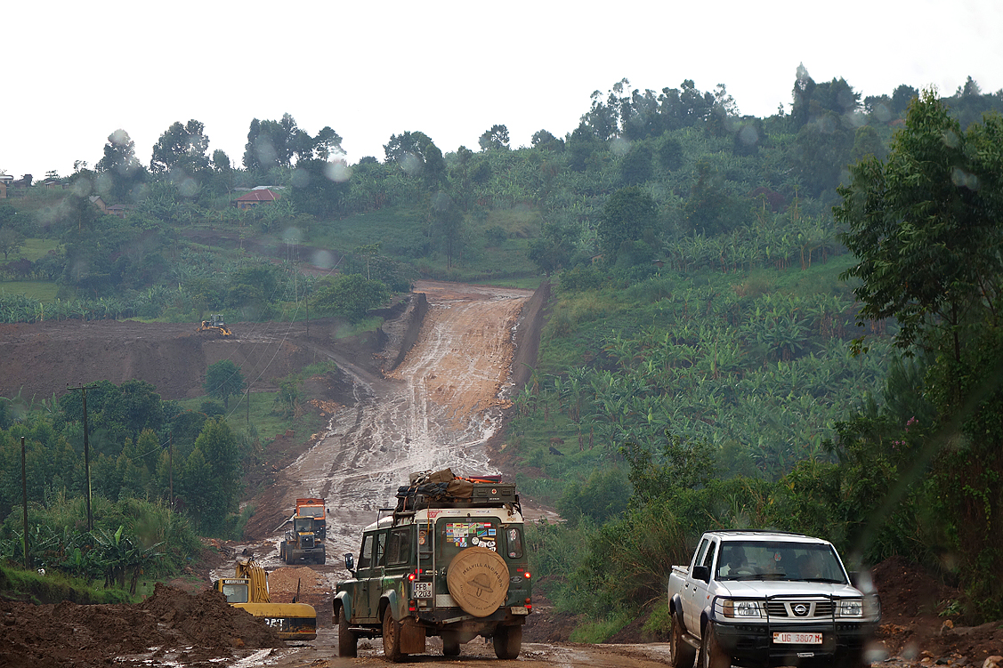 Können wir! So verlassen wir Fort Portal und machen uns auf den Weg zum Kibale, zur Primate Lodge, wo wir die nächsten beiden Tage zubringen werden. Wohlgemut biegen wir am Stadtrand von Fort Portal, der vorbildlichen Beschilderung folgend, auf eine unbefestigte Straße ab, die Sonne strahlt, doch direkt vor uns dräuen dunkle Wolken, denen wir mit jedem gefahrenen Kilometer immer näher kommen. Und dann, wir sind noch keine 5 Kilometer von Fort Portal entfernt, plöddert es plötzlich los. Es schüttet wie aus Kübeln, man kann kaum noch den Verlauf der Straße erkennen, aber, wieder von einer Sekunde auf die andere, geht das Geschütte in ein sanftes Nieseln über und begleitet uns die nächsten Kilometer, ohne unsere Fahrt weiter zu beeinträchtigen. Doch dann kommt es dicke! Die vormals recht griffige Lehmstraße verbreitert sich mit einem Male auf autobahnähnliche Ausmaße, schwere Baustellenfahrzeuge kehren das Unterste nach oben, der vormals festgefahrene „Belag“ ist völlig zerwühlt und hat, dem Regen sei Dank, eine schmierseifenartige Konsistenz angenommen. Eine Weile geht es flach dahin, und wir schlittern wir relativ kontrolliert durch die Gegend. Dann aber geht es in eine Senke hinab und, naturgemäß, auf der anderen Seite wieder nach oben. Und bereits auf den ersten Metern des Gefälles geraten wir bedenklich ins Trudeln.