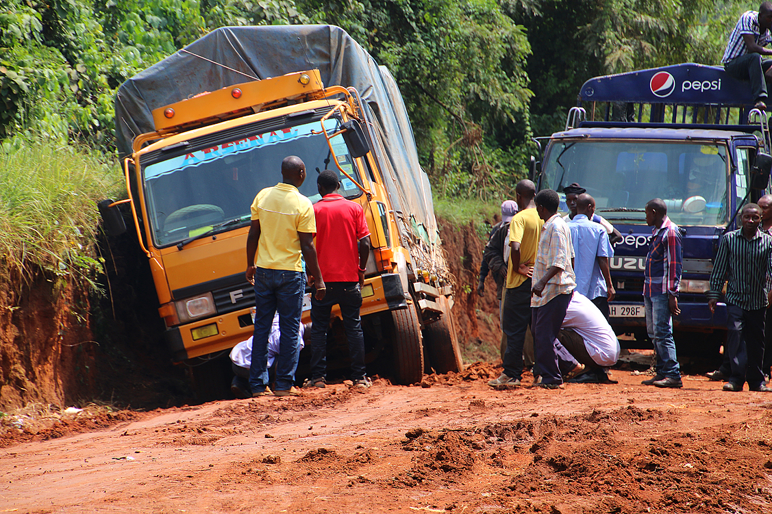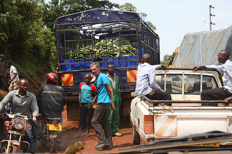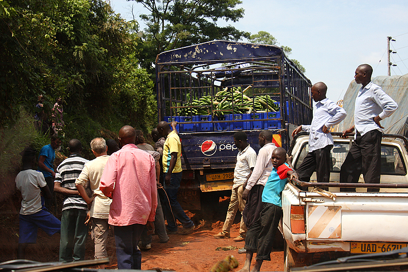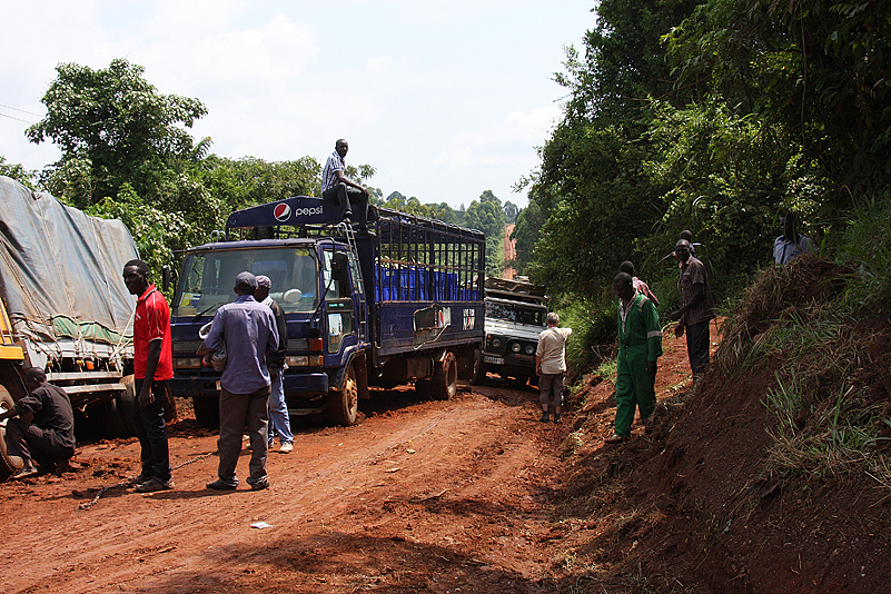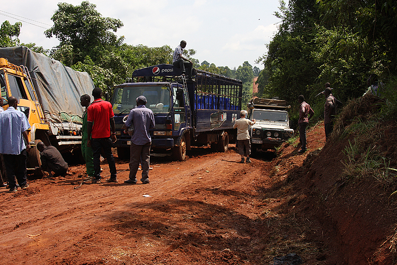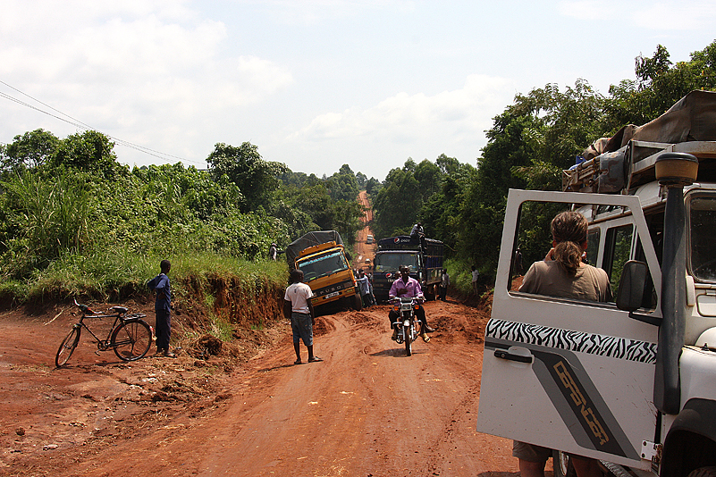 Lange plätschert die Fahrt so dahin, ereignislos, aber nicht uninteressant, denn immer wieder kommen wir durch kleine Dörfer und sehen Menschen, die ihrem beschwerlichen Tagwerk nachgehen und trotzdem die Zeit finden, uns freundlich winkend zu grüßen. Die Landschaft ist abwechslungsreich und üppig grün, die Straße, die bereits kurz nach Hoima vom geteerten Zustand in einen „naturbelassenen“ übergeht, ist gut zu befahren und selbst Abschnitte, die von örtlichen Regenfällen etwas matschig sind, bereiten uns keinerlei Probleme. Dann aber, wir durchqueren gerade eine recht hügelige Gegend, in der die Straße wie über hohe Dünenkämme führt – steiler Anstieg nach oben, schmale Kuppe, gleich darauf wieder steil nach unten -, sehen wir das Ungemach förmlich auf uns zukommen: wir erreichen eine Kuppe und können bereits dort erkennen, dass auf dem gegenüberliegenden Anstieg etwas passiert sein muss. Etwas Heftigeres, denn die ganze Straße wird von zahlreichen Fahrzeugen blockiert, die sich allesamt keinen Millimeter bewegen! Oje! Wir tasten uns abwärts, näher an das Geschehen heran. Als wir auf ungefähr gleicher, gegenüberliegener Höhe mit dem Fahrzeug-Kuddelmuddel sind, offenbart sich uns schließlich das ganze Ausmaß des Problems: mitten auf der ansteigenden Strecke, die regendurchnässt und somit ordentlich seifig ist, hat sich ein blauer Pepsi-Laster, beladen mit ausschließlich leeren Getränkekisten, in der Straßenmitte festgefahren und quergestellt, sodass er mit der Schnauze fast in der linken Böschung hängt. Dann muss wohl ein Lkw gekommen sein, ungleich größer und auch schwerer beladen, der versucht hatte, das blaue Gefährt rechts zu umfahren. Dabei wurde diesem jedoch der halbmondförmige Querschnitt der Straße zum Verhängnis; er schlitterte auf dem rutschigen Untergrund haltlos gegen die rechte Böschung, wo er nun in ziemlicher Schräglage lehnt und den Rest der Fahrbahn blockiert. Heilige Scheiße! Es scheint keine Verletzten gegeben zu haben, Gott sei Dank, aber an ein Durchkommen ist hier auch nicht zu denken. Beide Böschungen sind mehrere Meter hoch, steil aufragend, aus von Felsbrocken durchsetztem Lehm, die rechte Böschung reicht dem Lkw bis zur Oberkante der Laderaum-Plane, die linke Böschung ist etwas niedriger, aber dicht mit Gestrüpp bewachsen. Na toll!