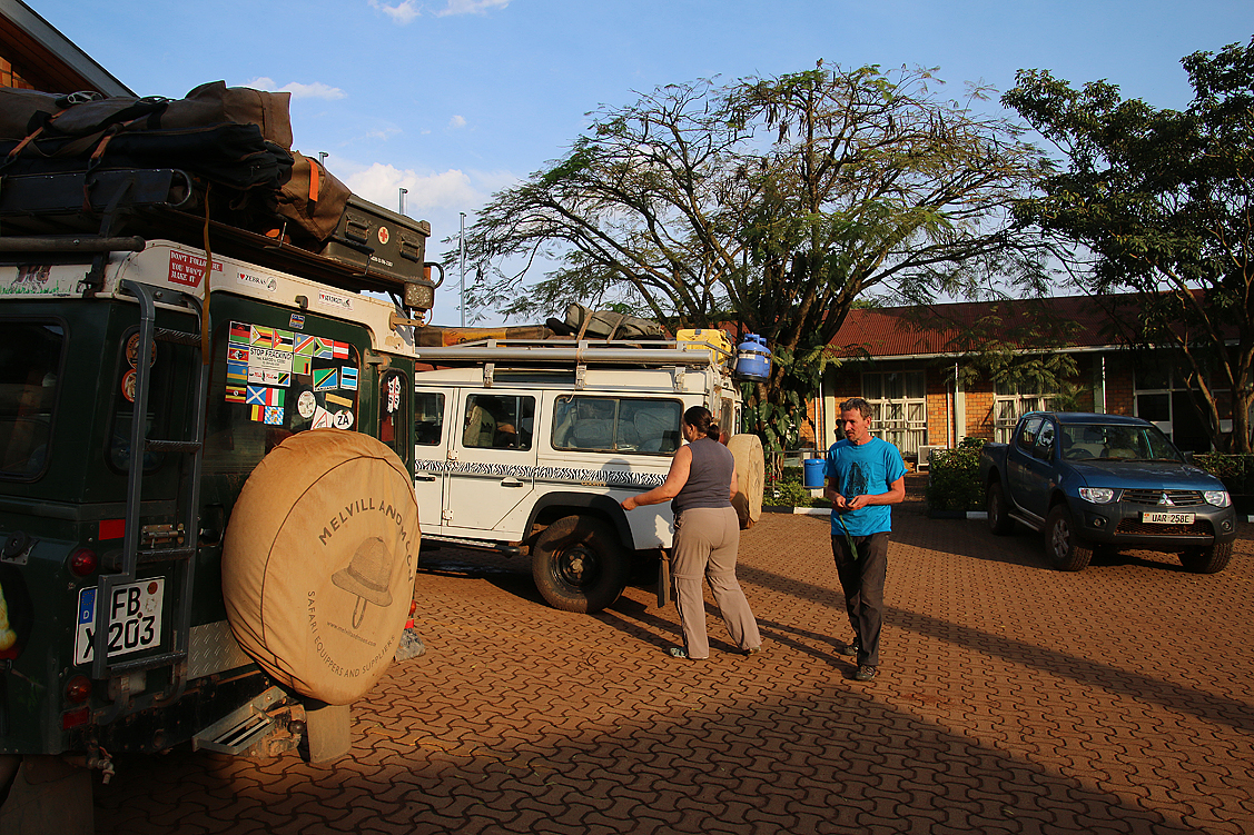 Ja, so ein richtiges Bett, das hat schon was für sich! Auf jeden Fall haben wir hervorragend geschlafen und trennen uns nur widerwillig von unserem Gemach mit dem En-suite-Bad. Doch der Hunger treibt uns in den Speisesaal, wo schon ein reichhaltiges Frühstück auf uns wartet. Rasch und dennoch genussvoll füllen wir unsere Mägen, abermals begleitet von den herzzerreißenden Melodien und schwachsinnigen Dialogen einer Fernseh-Soap, die hier anscheinend rund um die Uhr läuft. Der nebenbei flimmernde Schmachtfetzen aber tut der kulinarischen Qualität des Frühstücks beileibe keinen Abbruch; wir sind derart in die Einverleibung der ersten Mahlzeit des Tages versunken, dass wir darob beinahe etwas Wichtiges vergessen hätten: Jochen sitzt mit uns am Tisch und mampft ebenfalls wohlig in sich rein, als er uns zwischen einem neuen Käffchen und einem Stück Gebäck kundtut, dass er bereits in der Morgendämmerung in Hoima Town gewesen sei, die neue Batterie erhalten und sie auch schon eingebaut hätte. Stimmt, die Batterie, die haben wir über Nacht tatsächlich total aus dem Fokus verloren! Naja, nicht total, eher dachten wir, wir müssten sie bei unserer Abreise noch besorgen und würden wieder eine Menge Zeit dadurch verlieren. Doch Jochen Dank sei, jetzt ist alles in trockenen Tüchern! Da könnten wir eigentlich noch ein wenig länger frühstücken, oder? Nein, Annette drängt und sie hat recht, denn die heutige Tagesetappe ist wieder eine reine Fahrstrecke, nicht abartig weit, aber dennoch nicht zu unterschätzen. Also fügen wir uns den Gegebenheiten, den bekannten Unwägbarkeiten eines Fahrtages und machen uns, nach einem letzten Schluck Kaffee und dem eiligen Verstauen unserer Habseligkeiten wieder auf den Weg, der uns in den Kibale Forest führen wird, einem weiteren Highlight der Tour – dem Schimpansen-Tracking.