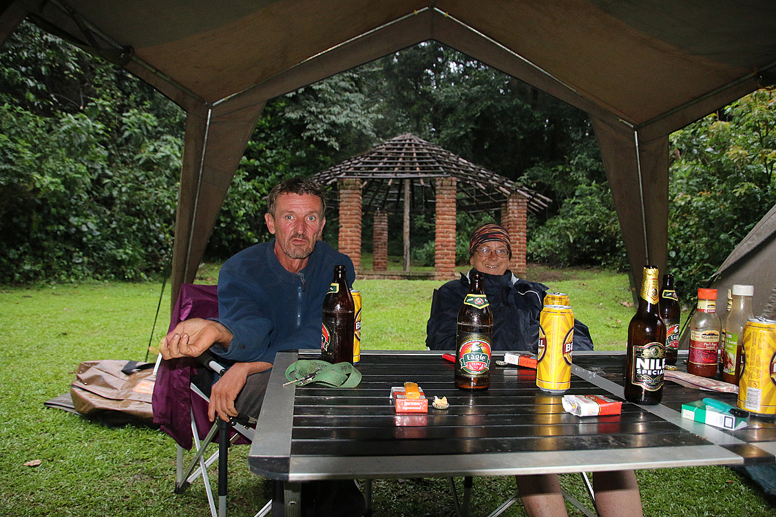 Als die Dämmerung hereinbricht, also so wirklich, nicht nur das diffuse Regengedämmere, machen wir uns an die Zubereitung unseres Abendessens – und denken mal wieder neidvoll an Gabi und Erika; die werden heute im Restaurant der Lodge verköstigt und müssen sich um nichts kümmern. Im Gegensatz zu uns. Wir schälen, wir schnibbeln, wir braten, wir aromatisieren – wir essen. Das Spülen verschieben wir auf morgen, keine Lust mehr! Gesättigt pressen wir uns in die klammen Sitzschalen unserer Camping-Klappstühle und beschließen soeben, bald zu Bett zu gehen, natürlich nicht ohne noch ein paar Stoßgebete für besseres Wetter in den regenverhangenen Himmel gesandt zu haben, als es plötzlich lautstark raschelt, zwei Lichtkegel auf uns zu wandern und mit einem Male Gabi und Erika vor uns stehen, um Asyl bittend! Ihr Sky Treetop House wäre eine Frechheit, eine Zumutung, absolut unakzeptabel und alles andere als luxuriös, geschweige denn gemütlich! Kein Balkon, ein Eimerchen für die Notdurft – und das auf gefühlten fünf Quadratmetern – ein Stockbett und somit definitiv nicht das, was sich die beiden erwartet hatten! Enttäuscht sind sie nun den nicht ganz kurzen Weg durch die Dunkelheit zu uns runtergestapft, um wenigstens hier noch ein wenig in den Genuss einer afrikanischen Nacht, gepaart mit relativem Komfort, zu kommen. Wir können es kaum glauben, tun aber natürlich alles erdenklich Mögliche, um es unseren beiden enttäuschten Lodgisten so kommod wie möglich zu machen. Unser eigenes, feuchtes Elend rückt dabei völlig in den Hintergrund. So verbringen wir einen sehr vergnüglichen Abend unter der Gazebo-Plane, auf die der Regen weiterhin ausgiebig herunterprasselt und, als sich unsere Wege wieder trennen, sind mit einem Male wir Camper im Vorteil: WIR nämlich müssen nur zwei, drei Meter durch den nassen Himmelssegen, bevor uns ein trockenes, warmes Schlafsäckchen empfängt, Gabi und Erika hingegen steht der ganze weite Weg in ihr enges Baumhaus, Hinaufklettern inklusive, noch bevor…