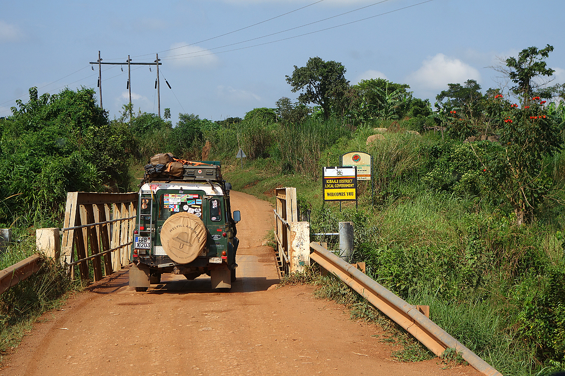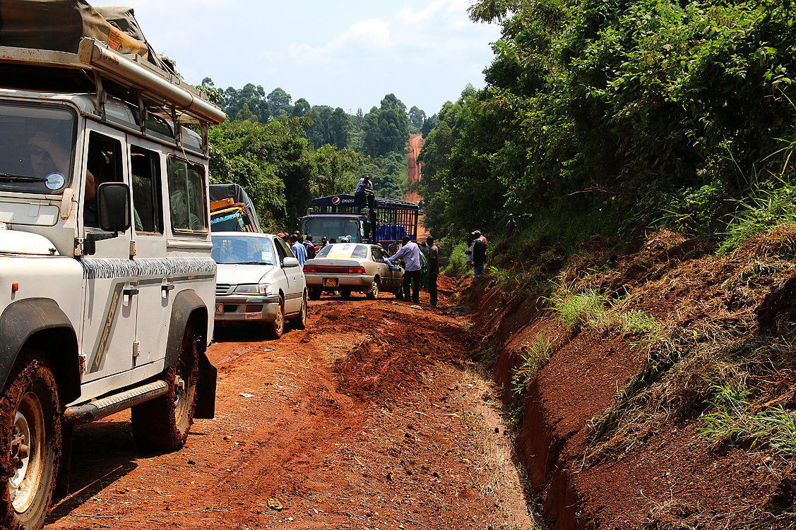 Wir wähnen uns im Geiste bereits fern des Kibale, den wir heute sicher nicht mehr erreichen werden, wenn wir hier Stunden festhängen, sehen uns insgeheim schon nach einem geeigneten Schlafplatz um, während wir uns abschätzend dem Stau nähern. Nein, kein Durchkommen. Frustriert stoppen wir am Ende der Fahrzeugkolonne und machen uns direkt vor Ort ein weiteres Bild, das auch nicht zuversichtlicher ausfällt. Die Straße ist auf unabsehbare Zeit dicht! Resigniert steigen wir aus unseren Autos, hören uns um, erkunden das Gelände zu Fuß, unterhalten uns mit vielen ebenfalls Betroffenen über den Unfallhergang und mögliche Chancen, doch bald weiter zu kommen – es scheint aussichtslos. Dann plötzlich bohrt sich ein durchschnittlich großer Pkw durch die lehmige Lücke auf der, von uns aus gesehen, linken Seite der Böschung, wühlt, gräbt, bohrt, schrappt, spritzt rote Erde in alle Richtungen, gibt schließlich ein entschlossen klingendes Schmatz-Kratz-Schlupp-Geräusch von sich – und hat somit, nicht ganz schadenfrei – die Engstelle erfolgreich passiert. Jochens Augen beginnen zu leuchten. Das können wir auch, scheint sein Blick zu sagen. Ja, vielleicht. Aber wir sind um einiges breiter und kommen zudem von unten! Egal, das versuchen wir – schließlich sind wir mit Land Rovern unterwegs und das sollte alle Negativ-Argumente entkräften! Entschlossen schraubt Jochen unseren Spaten vom Dachpaneel, buddelt an der Böschung, sticht ein paar sperrige Brocken ab, wirft den verdreckten Spaten schließlich ins Auto, setzt sich hinters Steuer und startet den Motor.