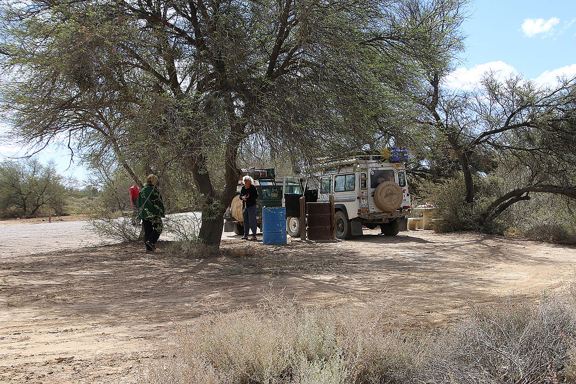Zufrieden parken wir die Autos, laden ab und inspizieren dann den Platz. Eine kleine Küchenzeile mit Spülbecken und großzügiger Arbeitsfläche, ein affensicheres Müllhäuschen, eine heimelig von Buschwerk umschlossene Campfläche und ein Klo-Dusch-Raum. Wie es im Inneren des Sanitärgemachs jedoch aussieht, können wir allenfalls ahnen, denn der uns überreichte Schlüssel will partout nicht sperren. Wir versuchen alles, drehen den Schlüssel, so herum und andersrum, drücken und ziehen an der Klinke, aber die Tür bleibt verschlossen. Jochen sieht schließlich nur noch eine mögliche Lösung des Problems und macht sich deshalb auf den Rückweg zum Office – das auf unsere Funkanfrage nicht antwortet – um den nötigen Schlüssel einzufordern. Kurz darauf kehrt er zurück. Per Funk, man hatte uns, etwas verspätet, doch gehört, wurde er in das Geheimnis des vermeintlich fehlenden Schlüssels eingewiesen: Selbiger liegt, gut verborgen, in der Küche bereit, man hätte wohl leider versäumt, uns das mitzuteilen. Was, wie? Die Erklärung folgt: Der Dusch-Klo-Raum wird natürlich ebenfalls von der Gastherme mit Warmwasser versorgt. Bedauerlicherweise jedoch wurde von abreisenden Campgästen des Öfteren vergessen, das gesamte Facility-Gebäude abzuschließen, weswegen sich die kostenlosen Duschgelegenheiten herumsprachen und so auch von Nichtbuchern extensiv genutzt wurden. Deshalb war man dazu übergegangen, dieses Sicherheitsverfahren einzuführen, dessen Sinn sich mir allerdings nicht erschließen will. Wenn ich nicht absperre, dann ist offen, egal, ob der Schlüssel vorher separat in der Küche versteckt war oder nicht… Na ja, ist ja auch egal, Hauptsache, das Klo ist jetzt nutzbar!