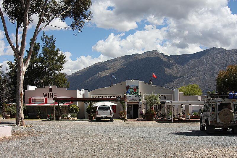 Mit wesentlich weniger Begeisterung als gestern und einem kleinen Mangel an Tatendrang wälzen wir uns heute Morgen aus den Betten. Es ist Montag – ein Tag, der auch zuhause auf der Beliebtheitsskala der Wochentage ganz unten rangiert, wenn auch aus anderen Gründen. Wesentlich angenehmer sind unsere Gründe hier und heute allerdings auch nicht: wir müssen unseren verstreuten Kram packen, das Kairos verlassen und dann die ewige Meile zum Tankwa Karoo raufpesen. Na ja, immer noch ein wenig besser, als in die Arbeit zu müssen! Seufzend also machen wir uns nach einem ausgiebigen Frühstück an die Arbeit, nutzen nochmal die Annehmlichkeiten der Zivilisation, verstauen unser Gepäck in den Autos und rollen dann los. Okay, bis zum nächsten Supermarkt. Es wäre schließlich kein perfekter Montag, würde er nicht auch noch durch einen unvermeidlichen Einkauf gekrönt… Als wir endlich auch das hinter uns gebracht haben, beginnt der wahre Ernst des Lebens – raus aus Kapstadt, rauf auf die N1 und ab geht die Fahrt. Endlos erscheinen uns die Kilometer bis zu unserem ersten Stopp, dort, wo wir auch letztes Jahr schon Halt machten: De Doorns, Die Veldskoen Padstal. Doch bereits auf dem Parkplatz hebt sich unsere Laune, denn dort sprießen jede Menge Blumen, die uns Hoffnungen auf mehr machen. Nach einer gründlichen Inspektion der bunten Blüten, die allesamt noch verheißungsvoll frisch aussehen, nehmen wir dann Kurs auf das Ladeninnere, das uns in allerbester Erinnerung ist. Annette freut sich so darauf, dass sie schnurstracks in medias res geht und dabei blindlings an einem kleinen Tischchen vor der Ladentür vorbeisteuert. Heinz, Ute und mir jedoch entgeht die dort angebotene Ware in keinster Weise und, quasi im Vorbeigehen, greifen wir uns jeder eines von insgesamt drei unwiderstehlichen Stachelschweinen, kunstvoll gefertigt aus schwarzen und weißen Perlen. Mit unserer Beute unter dem Arm betreten schließlich auch wir den Padstall und komplettieren dort unseren höchst befriedigenden Fang mit diversen Fruchtrollen, Trockenfrüchten, Nussmischungen und Erfrischungsgetränken für unterwegs.