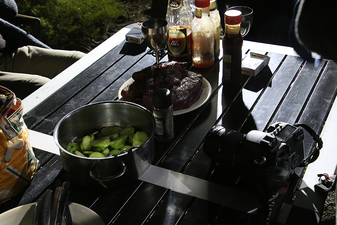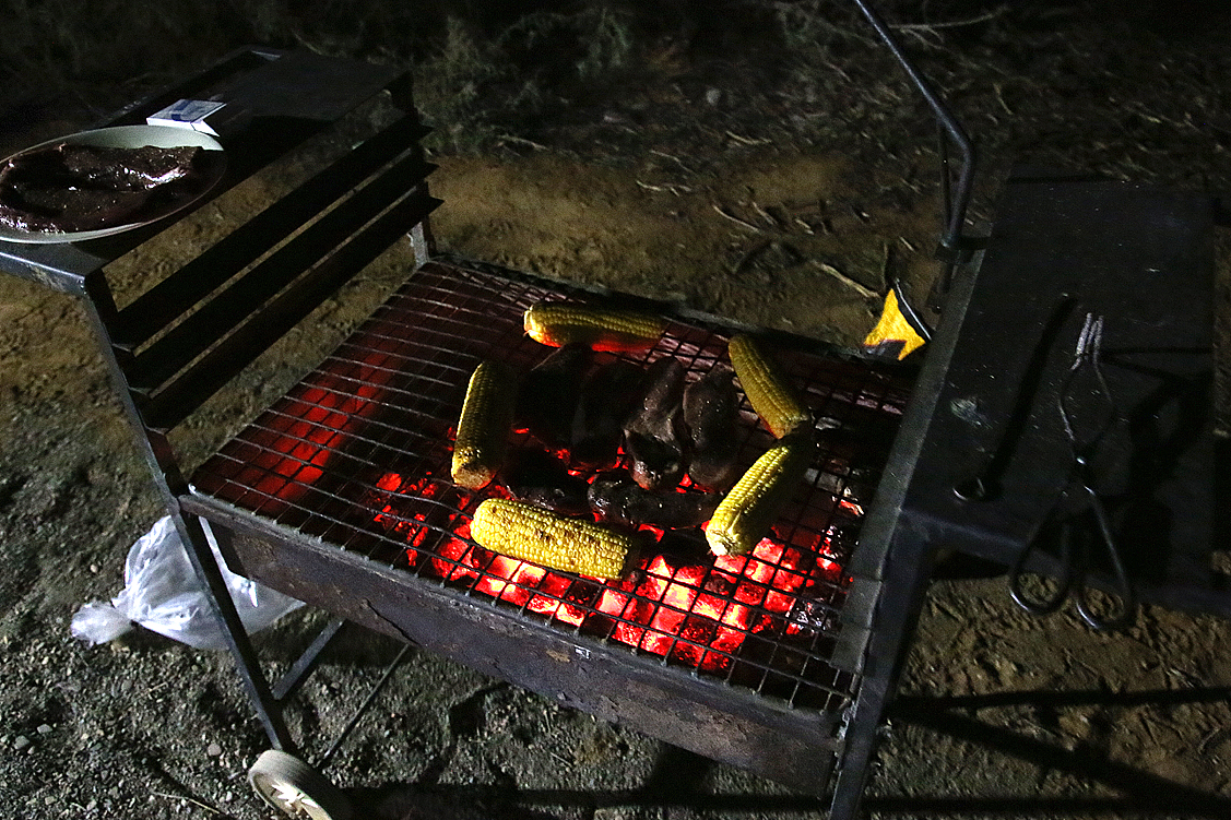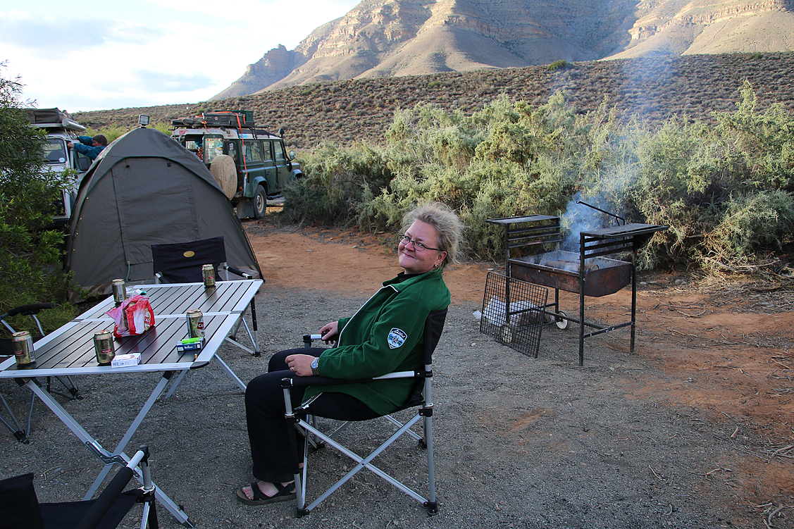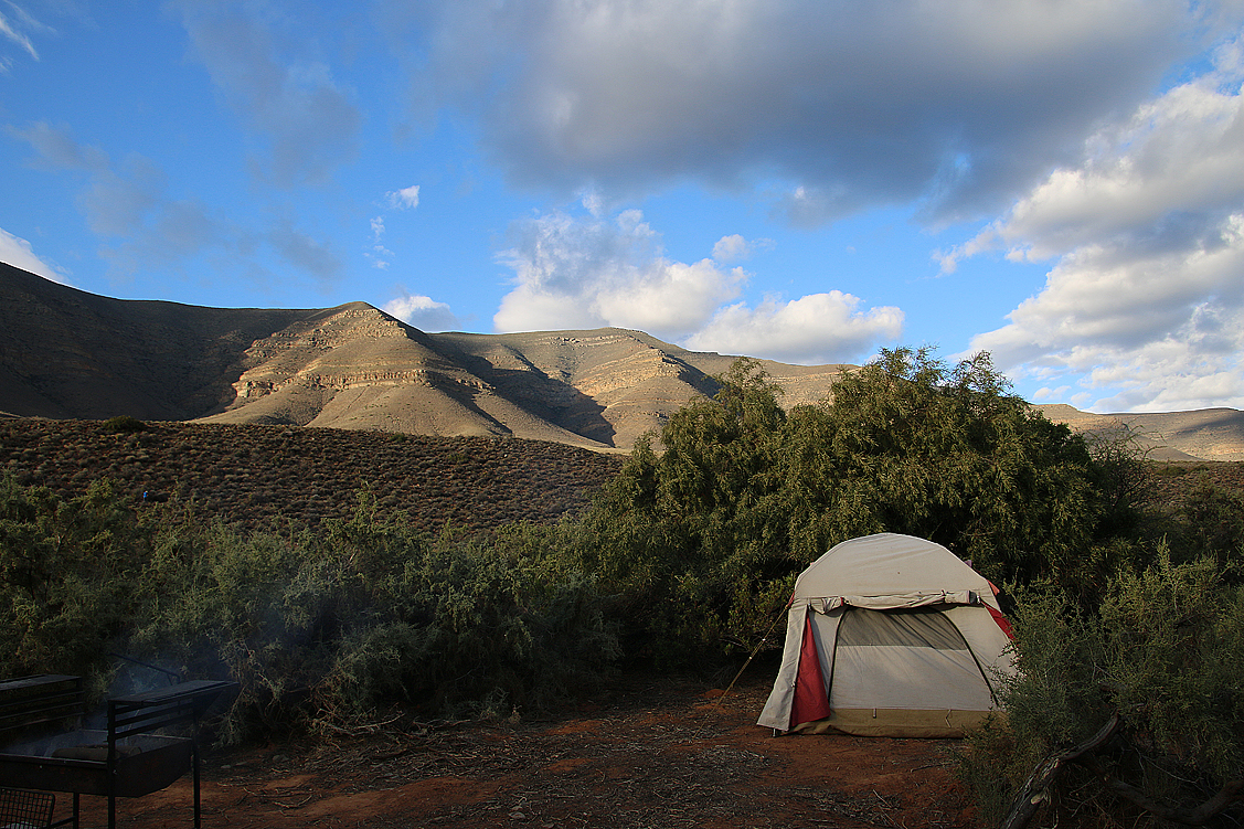In mehrerlei Hinsicht erleichtert, widmen wir uns nun dem Lageraufbau und statten unsere Zelte vorsichtshalber gleich mal mit zusätzlichen Decken aus. Eine Maßnahme, wie sie vorausschauender nicht sein könnte! Denn kaum ist die Sonne hinter den Renosterbergen verschwunden, sinkt die Temperatur rapide und wir, die wir gerade unser Abendessen zubereiten, machen den Maiskolben auf dem Grill fast den Platz streitig. Holla, ist das zapfig! Minütlich werden es ein paar Grad weniger. Wir dinieren schließlich, angetan mit Mützen, Jacken und Anoraks. Als wir bald danach ins Bett gehen – für einen gemütlichen Abendplausch ist es definitiv zu kalt – zeigt das Thermometer knapp unter null Grad an und wir kuscheln uns dankbar in die wärmenden Schlafsäcke und Decken. Brrrr, gute Nacht!