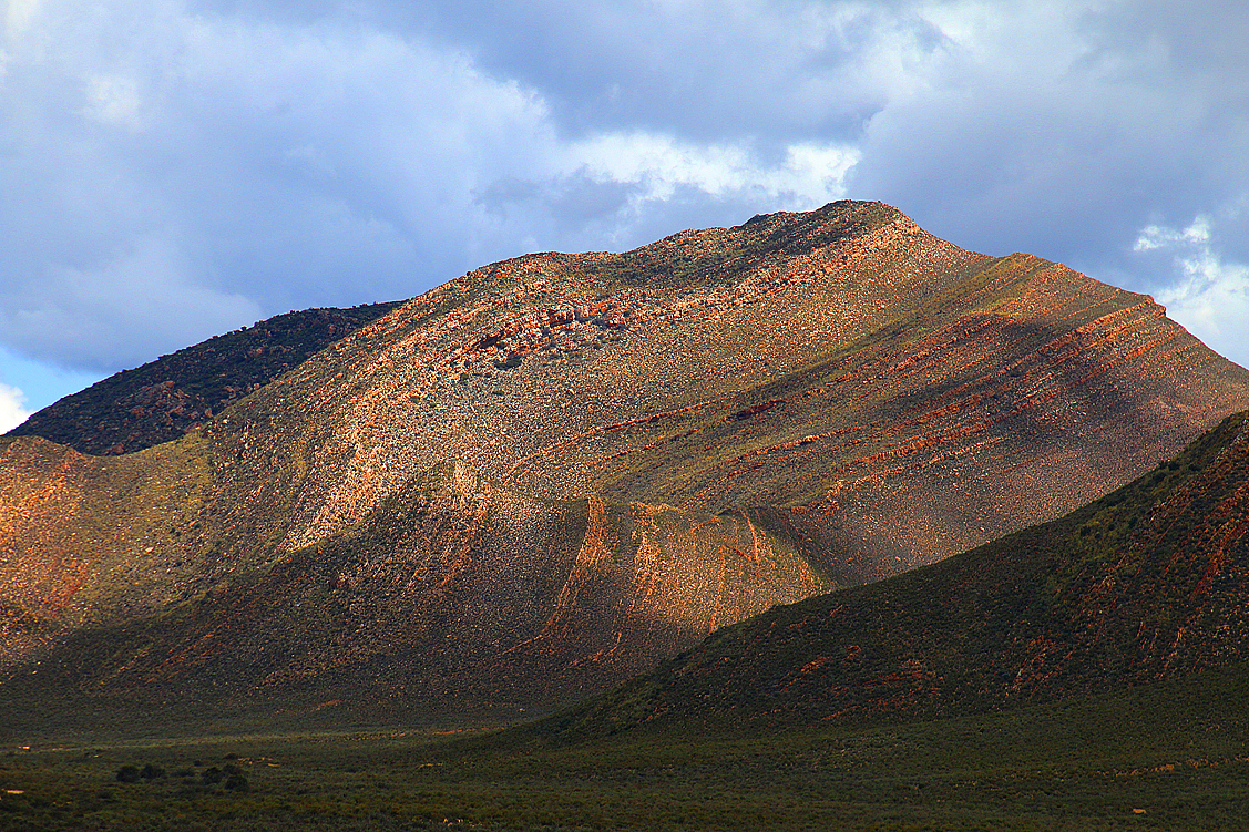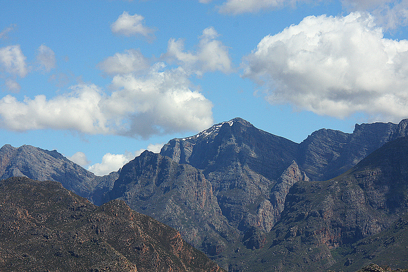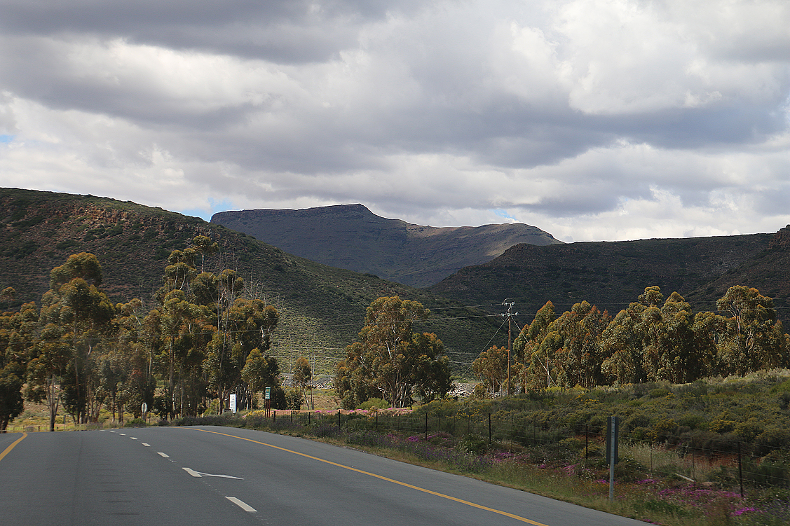 An der Kasse dann wird Annette unserer Stachelschweine gewahr und möchte wissen, wo wir die herhaben. „Von draußen, vor der Ladentür, aber…“. Den zweiten Teil des Satzes, nämlich, dass es nur diese drei gab, können wir nicht mehr vollenden, so schnell flitzt Annette raus. Enttäuscht kommt sie nach einer Minute wieder zurück und wirft begehrliche Blicke auf unsere putzigen Ystervarkies (wie sie auf Afrikaans heißen). Doch es gibt Dinge, die teilt man nicht, die tritt man nicht an jemand anderen ab! Essen, ja, Getränke, ja, im Notfall eigentlich fast alles, aber keine Perlentiere, die man bereits voll und ganz ins Herz geschlossen hat – da ist auch Ute unerbittlich. So geht Annette leider leer aus und der Gruppenfrieden droht kurzfristig ins Wanken zu geraten, insbesondere, weil Ute sich anfangs als wenig andenkenanfällig geoutet hatte. Aber ein ins Herz geschlossenes Perlen-Ystervarkie ist eben eine mehr als verständliche Ausnahme, das sieht auch Annette bei aller Begehrlichkeit ein, und alles ist wieder in Ordnung. So nehmen wir in trauter Harmonie unsere Erfrischungsdrinks draußen auf dem Parkplatz zu uns und schwelgen in der dortigen Blumenwelt, als mein Blick auf die Gipfel der uns umgebenden Hex River Mountains wandert. Eine Silhouette mehr oder weniger markanter Zweitausender reckt sich da gen Himmel und auf den Gipfeln der höchsten, ich muss gleich mehrfach hinsehen, erstrecken sich seltsame weiße Flecken. „Schaut’s mal, das ist doch Schnee da oben, oder?!“ Tatsächlich! Puh, Schnee im Afrika-Urlaub, das hatten wir nicht erwartet. Obwohl es absolut nichts Ungewöhnliches ist – Minusgrade und Schneefall sind regional bzw. saisonal keine Ausnahmen und, ja, sogar Gletscher gibt es auf diesem Kontinent. Doch wenn Schnee zu dieser Jahreszeit so direkt über einem thront, in einer Gegend, in der man nicht damit rechnet, dann ist es eben doch etwas Bemerkenswertes. Aber gut, dass der Schnee nur in der obersten Gipfelregion liegt und wir nicht vorhaben, während unseres Urlaubs in höhere Areale vorzudringen; wir sind auf Sonne und Wärme eingerichtet!