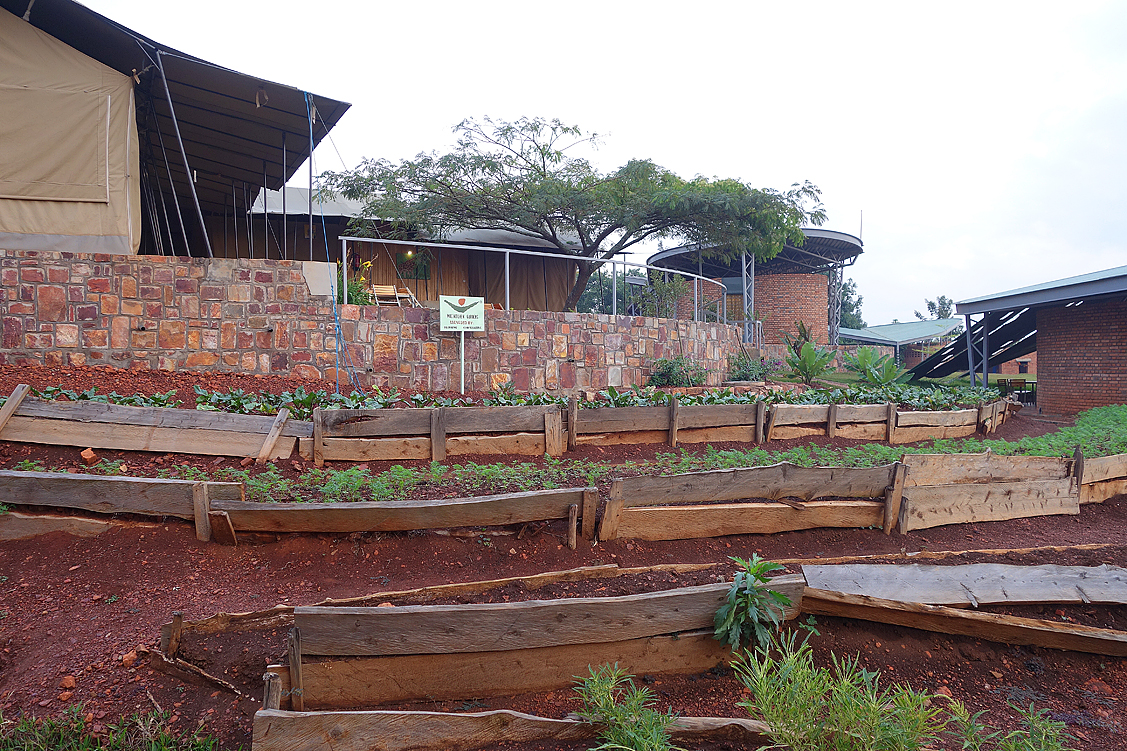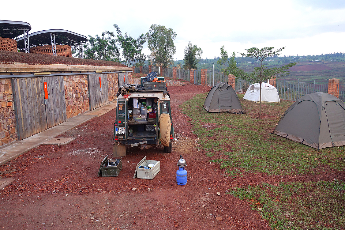 Ja, ich bin eher ein Pessimist denn ein Optimist, ich gebe es zu! Aber ich bin auch schon viel zu lange auf dieser Welt, unter meinesgleichen, und beobachte alles, was um mich herum passiert – zu genau, um mir noch großes Vertrauen in das Gute im Menschen bewahrt zu haben. Doch ich hoffe. Ich hoffe für diese sympathischen, motivierten Ruander, dass all das, was ich hier sehe, von Dauer sein und der positive Geist das Böse besiegen möge. Das wünsche ich mir umso mehr, als wir Kayonza und, kurz darauf, das von den Hostel-Angestellten empfohlene Opportunity Center erreichen und uns dort freundlich Einlass gewährt wird. Das riesige Gelände, von Klinkermauern und Zäunen begrenzt, liegt an einer Hügelflanke über einem ländlichen Tal, organisch gerundete, luftige Ziegelbauten schmiegen sich in Kreisform um ein eher nur spürbares denn sichtbares Zentrum, freischwebende Dachkonstruktionen beschatten die Gebäude, dazwischen sieht man liebevoll gepflegte Beete, bestückt mit zahlreichen Schildchen. Ein Angestellter hört sich unser Ansinnen an, nickt, eilt von dannen und holt den Manager herbei, der uns uns sofort auf ein spaziöses Campingareal lotst, nicht ohne uns, ganz nebenbei, über diese wirklich augenfällige Einrichtung zu informieren. Nebenbei und ganz unaufdringlich, aber mit der Option, dass er gerne mehr erzählen würde, sofern wir denn interessiert wären. Ja, das sind wir! Doch bevor wir mit weiteren Informationen „behelligt“ würden, sagt er, sollten wir uns doch erst mal bequem einrichten. Und das tun wir. Auf einer großzügigen Fläche, die am unteren Ende des abfallenden Gesamtareals liegt, mit Blick auf ein dörflich besiedeltes Tal, bauen wir unsere Zelte auf und genießen erst mal die Sicht. Beziehungsweise – man genießt die Sicht auf uns. Während wir nämlich unser Lager errichten, eilen zahlreiche Kinder aus dem Tal herauf, um uns aufgeregt dabei zu beobachten.