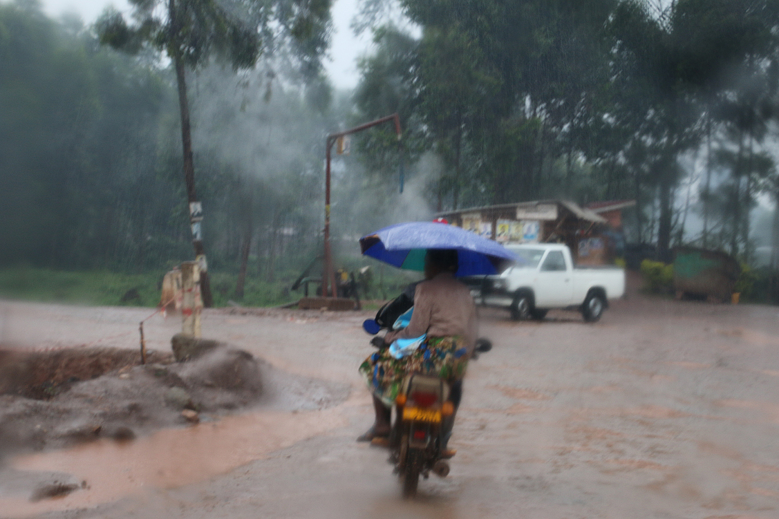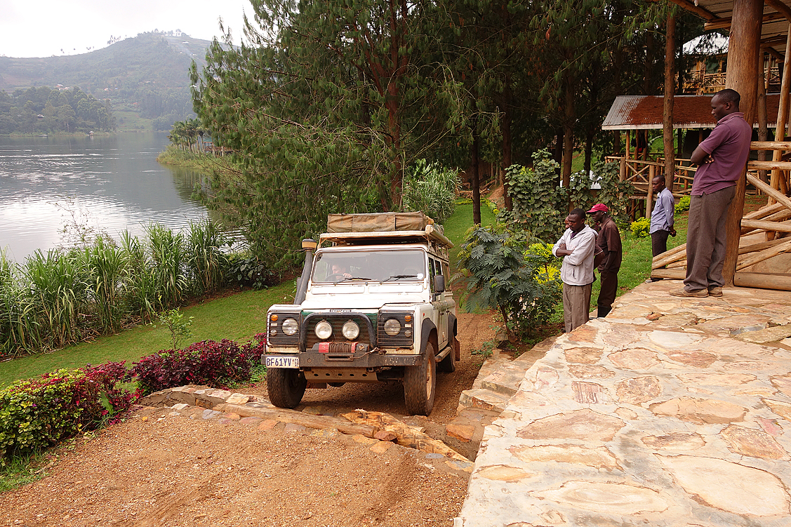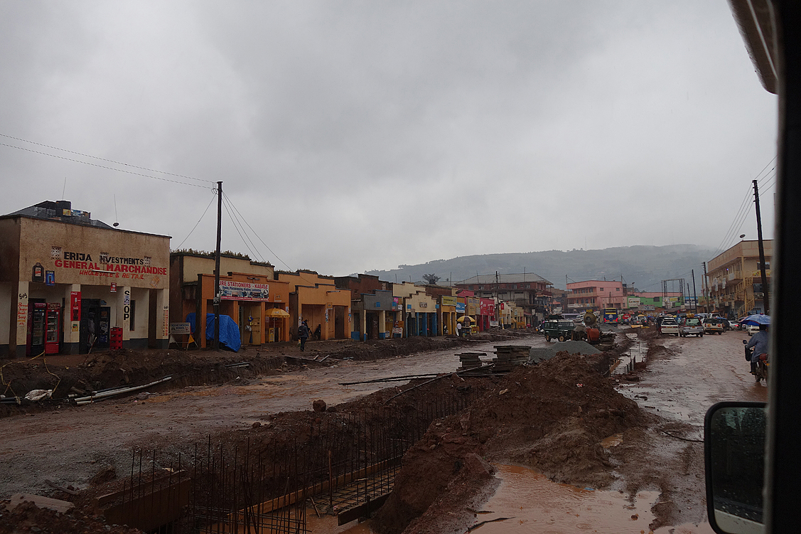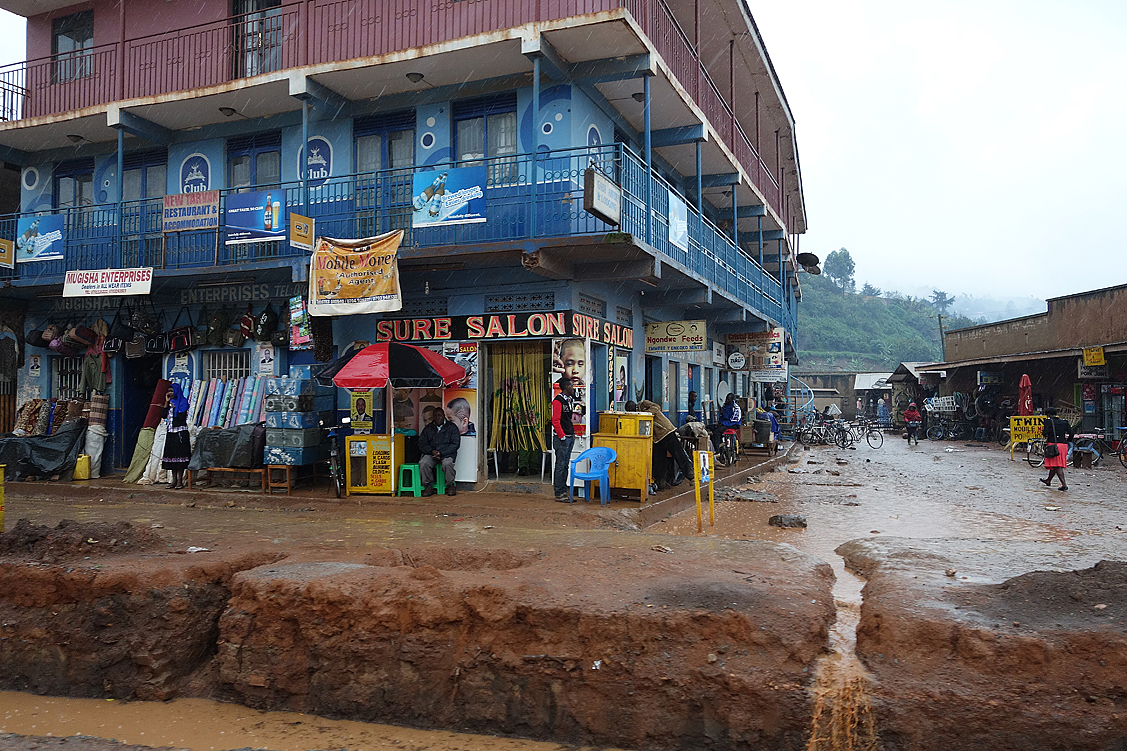 Ich rücke mich im Auto zurecht, um noch ein paar Abschiedsblicke auf den wolkenverhangenen See werfen zu können, aber nicht mal das ist mir vergönnt – es fängt schon wieder an zu regnen. Ach ne! Nun ist ja ein Land Rover Defender an und für sich ein super Auto, doch er hat ein paar, na ja, sagen wir mal, Mankos, die gerade an kühlen Tagen mit hoher Luftfeuchtigkeit und strömendem Regen besonders augenscheinlich zutage treten: die Scheiben laufen sofort an, obwohl es bei allen Türritzen eiskalt hereinzieht und die Scheibenwischer, die sich wie ein arthritischer Greis im Zeitlupentempo über die Frontscheibe bewegen, werden der Regenmenge nicht Herr. Also sehe ich nicht nur wenig, sondern nichts! Nun ja, egal. Mit beschlagenen Scheiben kämpfen wir uns die etwas rutschige Straße nach oben und kommen schließlich wohlbehalten in Kabale an. Die Stadt, die schon gestern, als das Wetter noch besser war, nicht besonders einladend wirkte, verströmt heute ein nahezu abstoßendes Flair. Ungeteerte Straßen werden von rasch fließenden Bächlein geflutet, die Häuserfronten sehen noch verkommener aus, Menschen eilen missmutig durch den Schlamm und in vielen Shops sitzen in Decken gehüllte Dienstleister, die heute vergeblich auf Kundschaft zu warten scheinen – jeder will nur möglichst schnell ins Trockene und verschiebt seine Besorgungen auf einen Tag mit besserem Wetter.