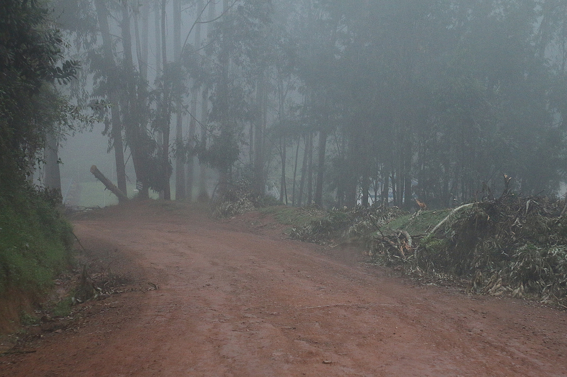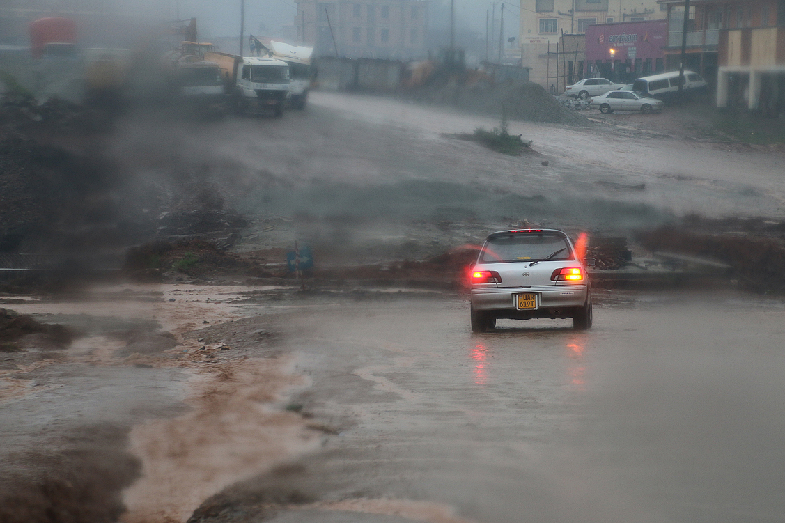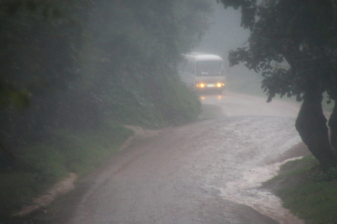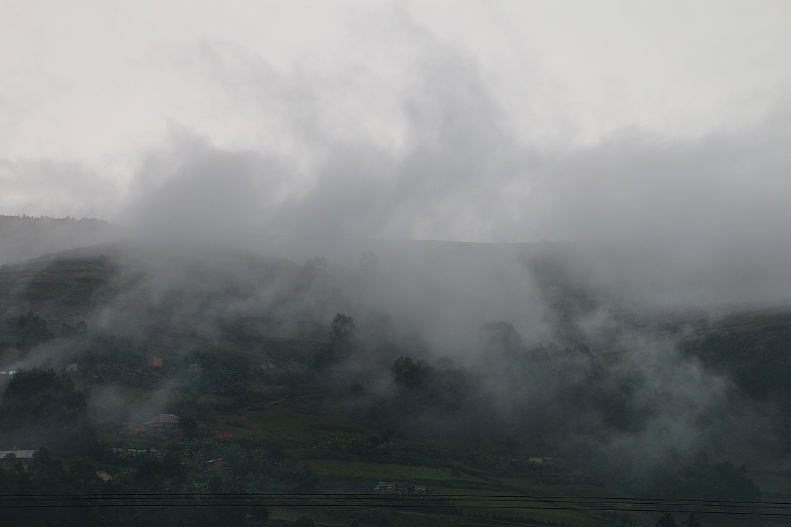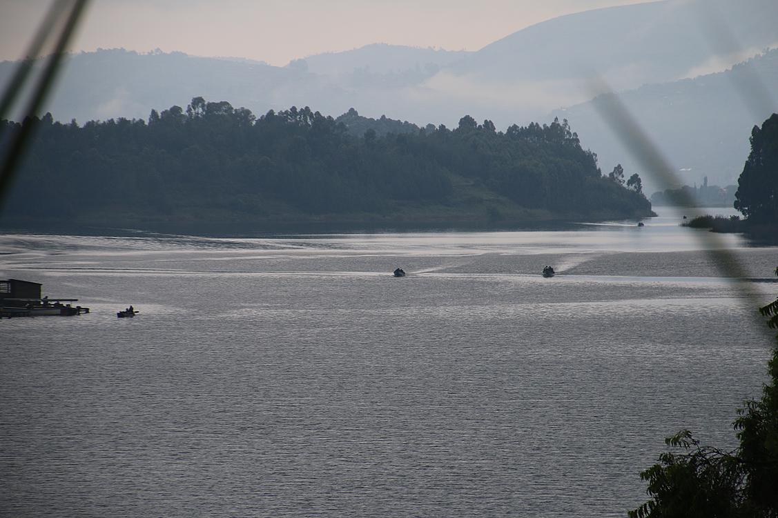 Ich rücke mich im Auto zurecht, um noch ein paar Abschiedsblicke auf den wolkenverhangenen See werfen zu können, aber nicht mal das ist mir vergönnt – es fängt schon wieder an zu regnen. Ach ne! Nun ist ja ein Land Rover Defender an und für sich ein super Auto, doch er hat ein paar, na ja, sagen wir mal, Mankos, die gerade an kühlen Tagen mit hoher Luftfeuchtigkeit und strömendem Regen besonders augenscheinlich zutage treten: die Scheiben laufen sofort an, obwohl es bei allen Türritzen eiskalt hereinzieht und die Scheibenwischer, die sich wie ein arthritischer Greis im Zeitlupentempo über die Frontscheibe bewegen, werden der Regenmenge nicht Herr. Also sehe ich nicht nur wenig, sondern nichts! Nun ja, egal. Mit beschlagenen Scheiben kämpfen wir uns die etwas rutschige Straße nach oben und kommen schließlich wohlbehalten in Kabale an. Die Stadt, die schon gestern, als das Wetter noch besser war, nicht besonders einladend wirkte, verströmt heute ein nahezu abstoßendes Flair. Ungeteerte Straßen werden von rasch fließenden Bächlein geflutet, die Häuserfronten sehen noch verkommener aus, Menschen eilen missmutig durch den Schlamm und in vielen Shops sitzen in Decken gehüllte Dienstleister, die heute vergeblich auf Kundschaft zu warten scheinen – jeder will nur möglichst schnell ins Trockene und verschiebt seine Besorgungen auf einen Tag mit besserem Wetter.