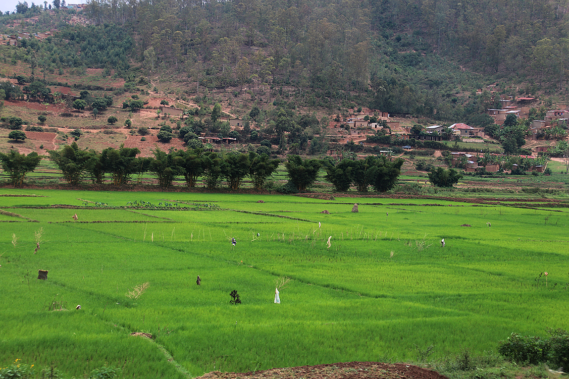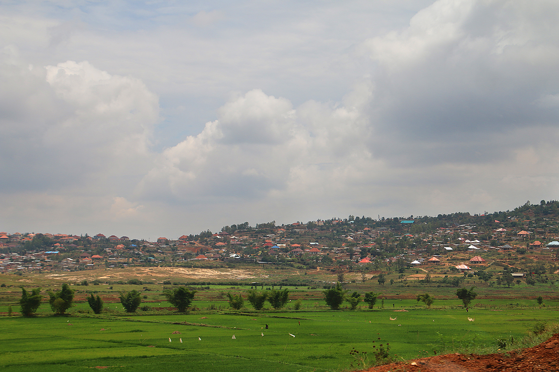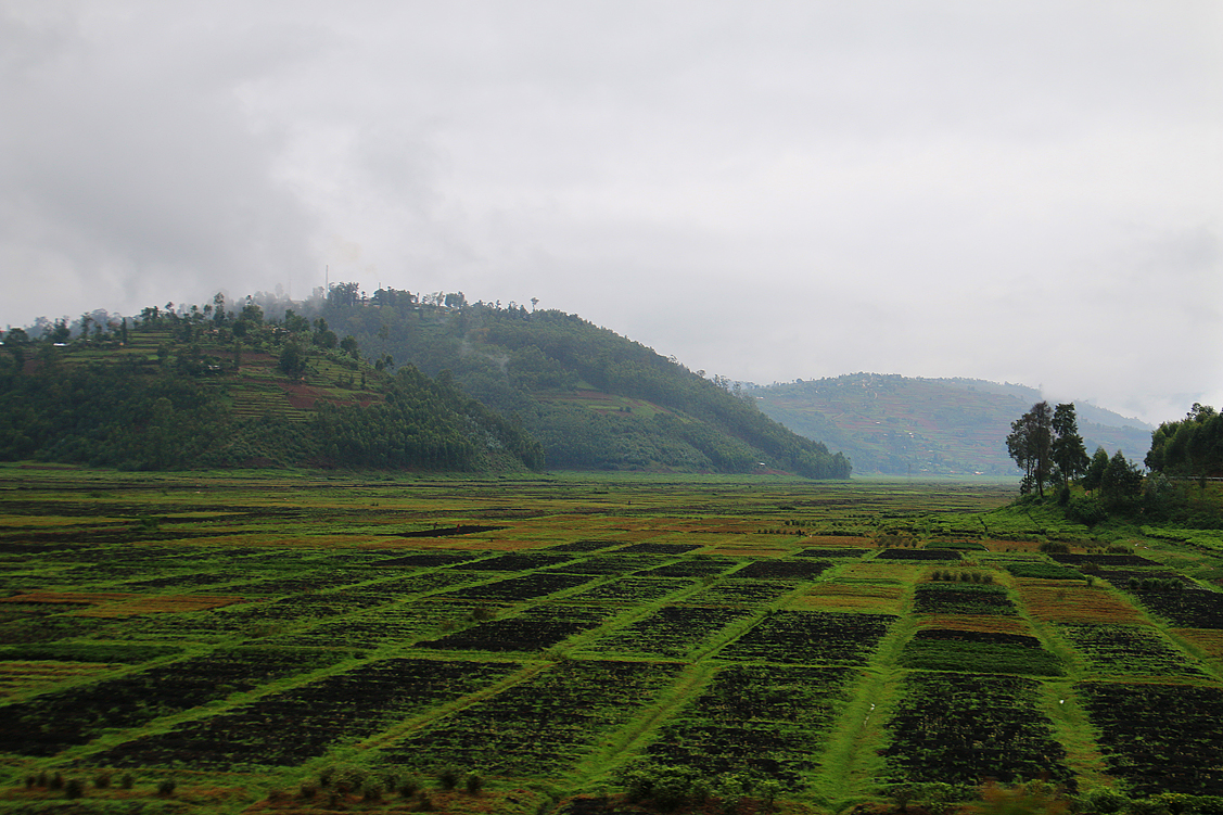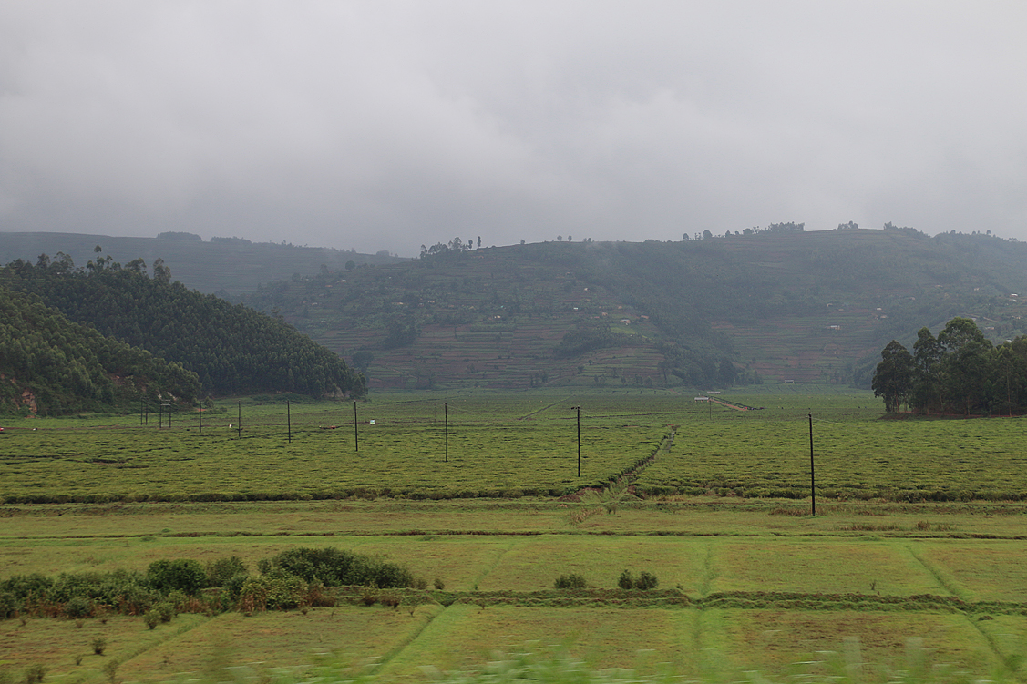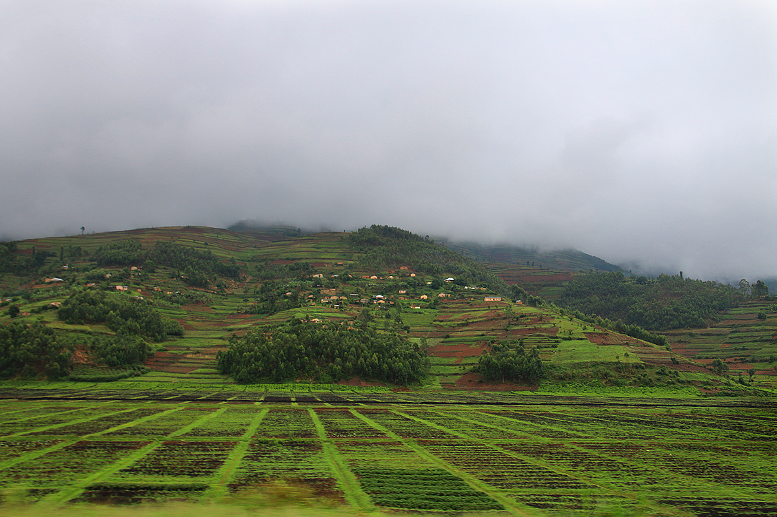 Auch wir hätten gerne trockenere Bedingungen zum Fahren, wenngleich unsere Tagesstrecke heute keine sehr weite ist: wir wollen nach Kigali und dort auf unserem Weg nach Tansania im Rwanda Youth Hostel Zwischenstation machen. Doch die Fahrerei mit hechelnden Scheibenwischern und vernebelten Scheiben ist eben trotzdem nicht sehr prickelnd. Doch wenig später hat das Wetter ein gewisses Einsehen mit uns. Es nieselt nur noch hin und wieder und die Temperaturen steigen leicht, was die beschlagenen Fenster im Wagen sofort zum Aufklaren bringt. Und nun sehen wir auch, dass wir uns in wunderschöner Landschaft bewegen. Unglaublich grüne Reisfelder, die sogar in diesem fahlen, sonnenlosen Licht förmlich glühen, leuchten uns entgegen, die streng geometrischen Formen der landwirtschaftlichen Nutzflächen verleihen der Gegend einen ganz besonderen Reiz, der durch die unterschiedlichen Grüntöne der Reispflanzen zusätzlich unterstützt wird. Ich schwelge gerade in diesen subtilen Farbnunancen und den Strukturen der wogenden Reishalme, als plötzlich der Verkehr zu- und der landschaftliche Reiz wieder abnimmt.