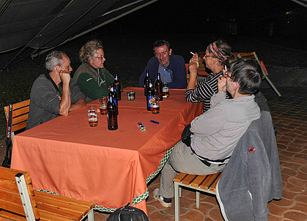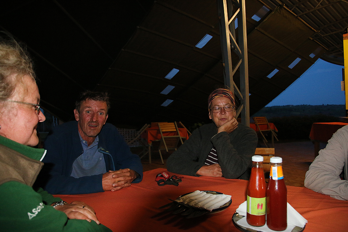 Frisch geduscht kehre ich so wenig später zu meinen Freunden zurück, mit dem guten Gefühl, wieder sauber zu sein und gleichzeitig für Gießwasser gesorgt zu haben… „Barbara, die haben ein Restaurant hier und wir haben uns dort angemeldet. Mach dich fertig, wir wollen gleich los!“ So also findet ein ereignisreicher und höchst interessanter Tag ein gemütliches Ende: wir müssen nicht mehr selbst kochen, sondern lassen uns stattdessen verwöhnen und ich habe zudem Gelegenheit, ein bisschen was von meinen neuen Erkenntnissen zu erzählen, die von den anderen ebenso fasziniert aufgenommen werden und uns das Dinner doppelt unvergesslich machen. Eine gute Entscheidung, hierher gekommen zu sein! Zu vorgerückter Stunde schließlich verlassen wir das Restaurant, dessen einzige Gäste wir heute Abend waren und streben unseren Zelten zu, in die wir uns alsbald verkriechen, denn es ist echt frisch. Nicht, dass wir uns noch erkälten…