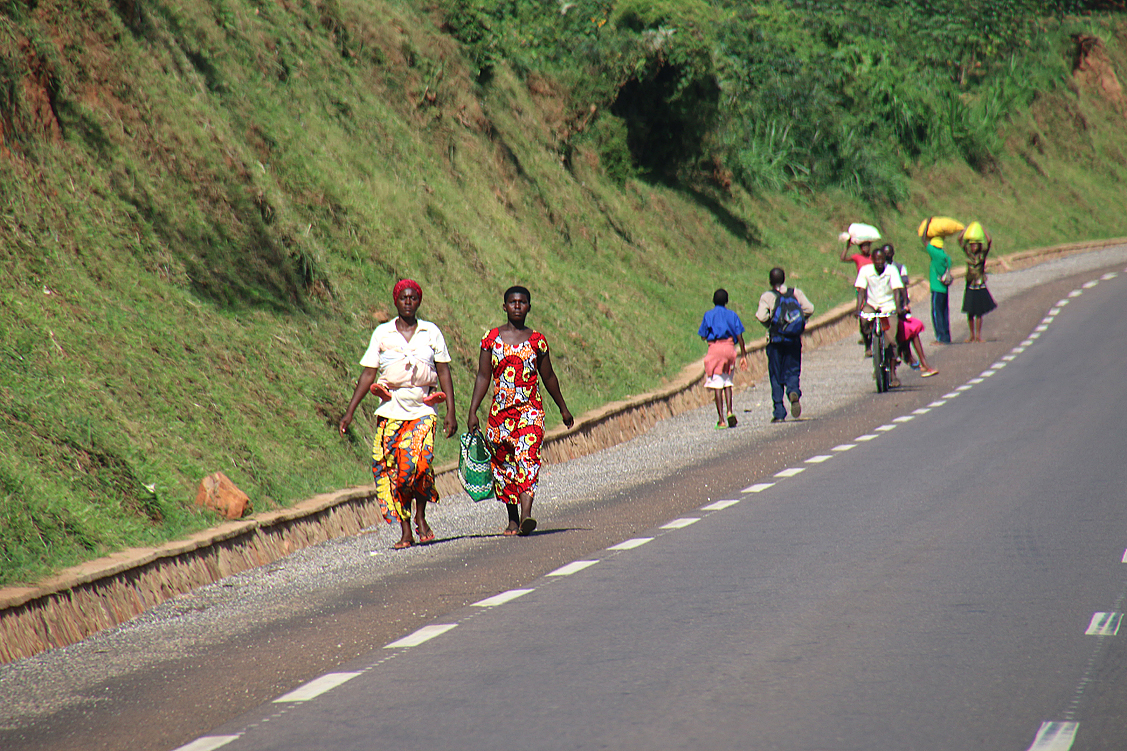 Ein Erlebnis der besonderen Art, wie sich bald herausstellt, denn es ist Samstag, der erste Samstag im Monat. Somit erstrahlt das ganze Land im Glanze des erst vor einer Woche durchgeführten Umuganda und, noch viel beeindruckender, es scheint heute Markttag zu sein. Die gesamte Landbevölkerung ist auf den Beinen, Frauen balancieren Waren auf dem Kopf, Kinder sausen spielend um ihre Mütter herum und Männer steuern vorsichtig Eselskarren und beladene Pferde durch die gut gelaunte Menschenmenge. Und überall wird uns freundlich-fröhlich zugewunken, nirgendwo ist Feindschaft zu spüren und, was das Sympathischste ist, nichts wirkt auch nur andeutungsweise aufgesetzt. Eine Freundlichkeit, der man in vielen afrikanischen Ländern begegnen kann, doch hier, in Ruanda, wo sich vor 21 Jahren Unvorstellbares ereignete, ist das etwas, was mich besonders tief berührt.
