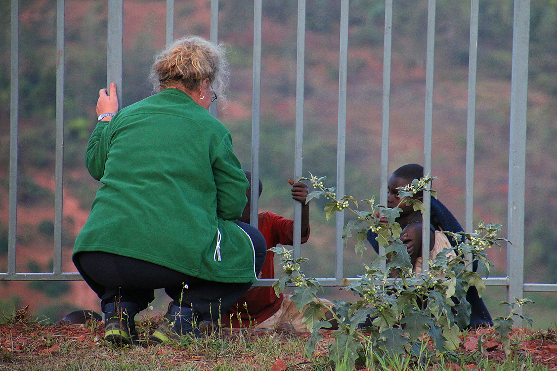 Wir scheinen eine wirkliche Sensation zu sein! Die Kinder hangeln sich am Zaun des Opportunity Centers entlang, kichern, giggeln, versuchen schüchternen Kontakt aufzunehmen, wenden sich aber immer wieder verschämt ab, wenn dieser zustande kommt. Lange versuchen Heinz und ich, Vertrauen zu den neugierigen Kids aufzubauen, was uns schließlich zumindest partiell gelingt. Radebrechend, mit Händen und Füßen, unterhalten wir uns mit den Kleinen, als plötzlich energische Pfiffe aus dem Talgrund erschallen. Wie die Pfeile flitzen die Kinder folgsam von dannen, obwohl sie so gerne geblieben wären. Wir winken ihnen, erstaunt über so viel Gehorsam, hinterher.