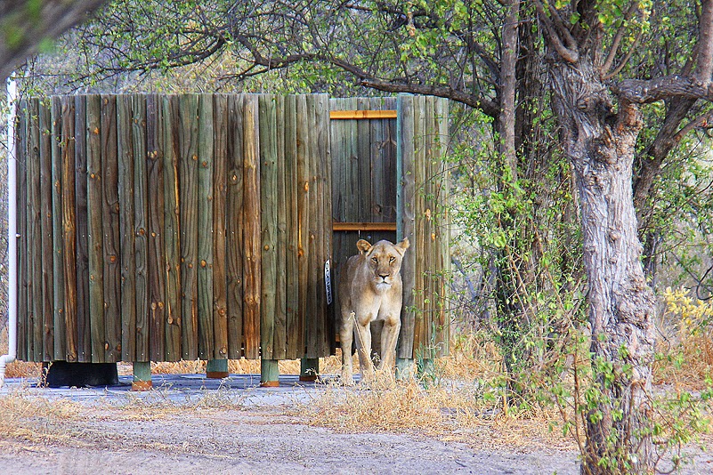Wir trudeln also auf dem Platz ein, der uns von den schockierten Südafrikanern als löwenrudel-besetzt gemeldet wurde, und erblicken tatsächlich zwei der Großkatzen. Ein Weibchen liegt ziemlich in der Mitte der Site und hebt ihren Kopf, als wir in ihr Blickfeld kommen. Nur kurz sieht sie uns an, dann sinkt ihr Schädel wieder zu Boden und sie schließt desinteressiert und irgendwie erschöpft die Augen. Auf der rechten Seite, ganz am Rande des Platzes, entdecken wir dann das zweite Mitglied des Rudels – ein Männchen. Bis auf die Knochen abgemagert, kaum noch sichtbar atmend, schwer krank, dem Tode nahe. Sein struppiges Fell liegt wie hingeworfen auf dem Skelett, das man überdeutlich erkennen kann, seine Augen sind verklebt, seine Nase verkrustet und er reagiert auf unser Kommen, indem er mühsam ein Augenlid hebt. Ein Bild des Elends – aber irgendwie ein friedliches. Nur wir stören dabei. So empfinden jedenfalls Heinz und ich, und bitten deshalb unsere Freunde, sofort wieder zu fahren. Die beiden folgen etwas zögerlich, zu zögerlich, unserem Wunsch, aber Jochen wendet tatsächlich gerade das Auto, als eine weitere Löwin auftaucht. Sie hatte im Schatten der Klospirale geruht und will nun wohl nach dem Rechten sehen. Langsam kommt sie aus dem kleinen Holzgebäude heraus, sieht sich um, schüttelt sich und schreitet gemächlichen Schrittes auf ihre liegende Rudelgenossin zu. An deren Seite lässt sie sich dann niederplumsen und schließt ihre Augen. Ihr Brustkorb hebt und senkt sich dabei, als hätte sie soeben eine große Anstrengung hinter sich gebracht. „Bitte, lasst uns endlich fahren!“, flehen Heinz und ich. Denn Leiden und Sterben sind so private, so intime Vorgänge, dass wir da nicht als Zeugen anwesend sein müssen. Das gehört sich einfach nicht!