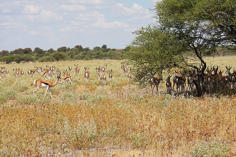 Doch wir haben noch eine weitere, lange Durststrecke vor uns, bevor uns endlich die Kalahari umgibt, die wir so lieben. Stundenlang ötteln wir durch dichtes Buschland, sehen nichts außer Gestrüpp und können dem Ganzen auch beim besten Willen nicht viel Positives abgewinnen. Aber das dröge Gezockle lohnt sich schließlich doch. Gen Mittag weitet sich die Landschaft, unsere Augen können wieder schweifen und entdecken sogleich auch riesige Ansammlungen von Springböcken, die sich im Schatten weniger Bäume schutzsuchend zusammendrängen. Eine Giraffe stakst über eine goldgrasige Ebene und all das versöhnt uns sofort mit mit unserem „erlittenen“ Schicksal. Unsere Fahrapathie legt sich beinahe augenblicklich und wir sehnen uns nach einer Rast, die uns aus dem Auto heraus, hinein in die Welt der Kalahari bringt. So halten wir an einer besonders schönen Stelle, nehmen uns über eine Stunde Zeit, die Eindrücke in uns aufzusaugen.