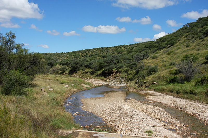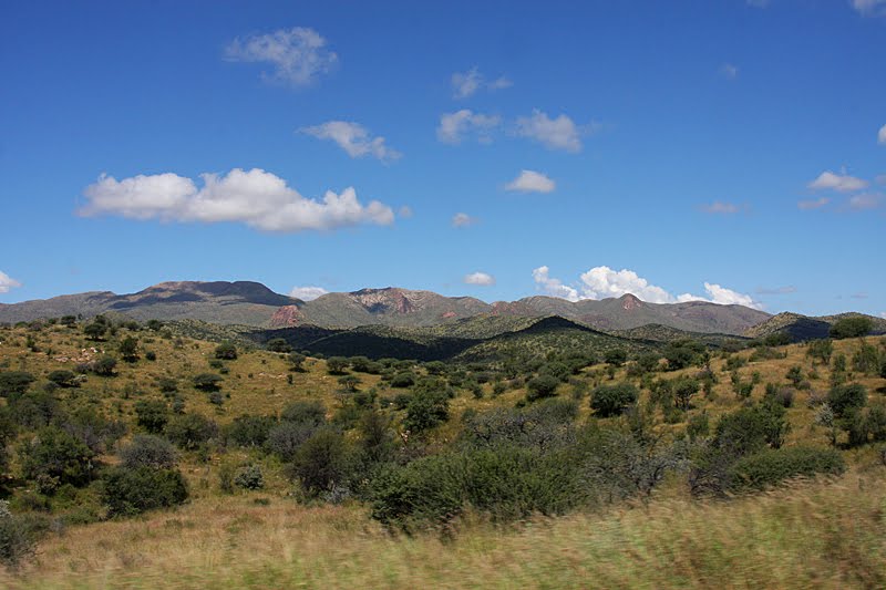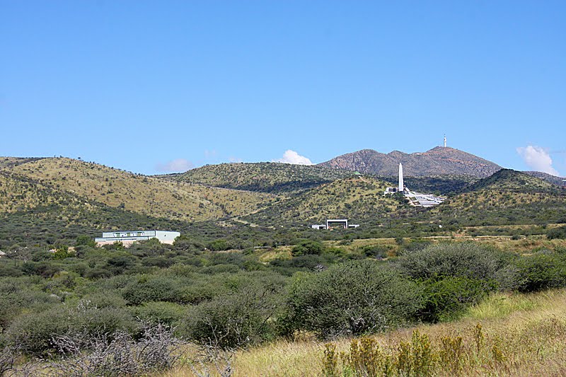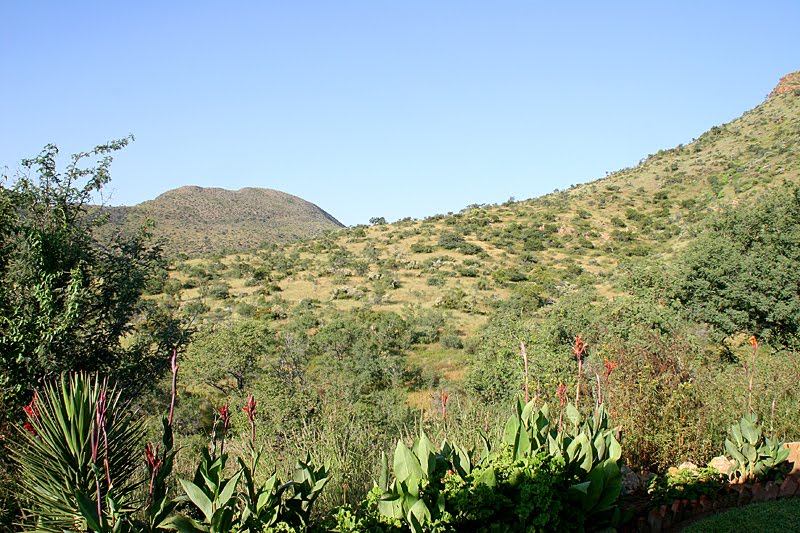 Zusammen machen wir uns auf den Weg zu unserem heutigen Nachtquartier, dem Monteiro Camp, das 11 Kilometer südlich von Windhoek mitten in den Auas-Bergen liegt. Eigentlich wollten wir ja im zentral gelegenen Backpackers Unite nächtigen, doch es machte einen so ungepflegten, verwahrlosten Eindruck, dass Annette und Jochen sich nach etwas Besserem umsahen. Und da fahren wir jetzt hin. Schon auf der Flughafenausfahrt sind die Folgen des starken Regens nicht zu übersehen: der Teerbelag, der hier noch nie der beste war, ist zu großen Schollen zerborsten und aus dem nackten Untergrund haben sich badewannengroße Schlaglöcher ausgespült. Doch uns interessieren eher die positiven Folgen, die ebenso wenig zu übersehen sind. Alles ist grün, das Gras wiegt seine goldenen, weißen und rosafarbenen Ähren im leichten Wind, alle Riviere führen Wasser und glitzern munter gluckernd durch die saftige Landschaft. Ein wunderschönes, nicht ganz alltägliches Bild! Nach 40 Kilometern allerdings schluckt uns erst mal die Stadt, doch auch dort wogt ein Blütenmeer aus Wicken, Bougainvilleen, Strelizien und Clematis. Wir schrauben uns die Jan Jonker Road nach oben und biegen dann Richtung Süden ab. Ein blühendes Stadtviertel weiter, in der Robert Mugabe Ave, passieren wir ein riesiges Gelände, das von einem recht eigenwilligen Zaun umgeben ist: meterhohe Stahl-Elemente in extra-cleanem Look werden alle paar Meter von goldenen, unverkennbar asiatischen Kunststoff-Emblemen geschmückt. Man könnte fast ein überdimensionales China-Restaurant hinter diesem Zaun vermuten, aber es ist, man höre und staune, der neue Amtssitz des Präsidenten von Namibia. Das alte State House in der Innenstadt platzte aus allen Nähten, weswegen Uncle Sam Nujoma im Jahre 2002, damals in seinen letzten Amtsmonaten, ein neues in Auftrag gab – ausgerechnet bei seinen Freunden in Nordkorea. Und die haben dem Regierungspalast ihren charakteristischen, ganz und gar unafrikanischen Stempel aufgedrückt: asiatische Cleanliness gepaart mit billig anmutender China-Restaurant-Optik. Doch billig war die Bude mitnichten, auch wenn sie so aussieht…