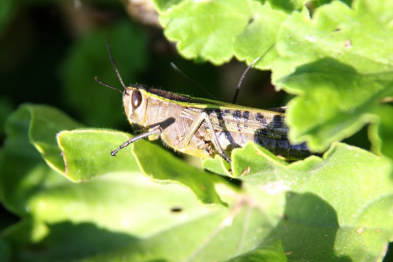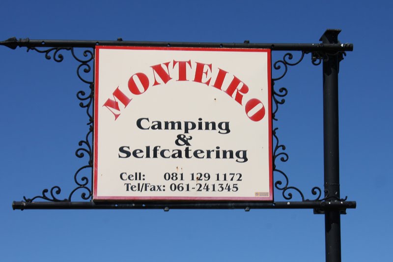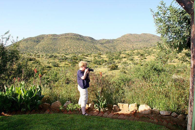 Ein paar Kurven weiter geben die Hügelketten den Blick auf eine zweite Ausgeburt nordkoreanischen Architektur-Geschmacks preis, den Heroes Acre. Dieses monströse Kriegsdenkmal befindet sich auf einem etwa sieben Quadratkilometer großen Gelände, auf dem 174 mehr oder weniger namhafte namibische Freiheitskämpfer zur letzten Ruhe gebettet liegen. Ein strahlend weißer Obelisk und eine güldene Soldatenstatue in martialischer Kommunisten-Heldenpose krönen den Gottesacker und sollen, so Old Sams offizielle Begründung für diese massive Geldverschwendung, in den Namibiern jedweder Hautfarbe patriotische Gefühle wachrufen. Mhm, ganz bestimmt! Wie gut, dass diese optische Abscheulichkeit bald wieder aus unserem Sichtfeld verschwindet und wir in die Tiefen der samtig-grünen Auas-Berge abtauchen dürfen. Ein Bahngleis überquerend erreichen wir Monteiro, ein Camp mit nur 2 Bungalows und 6 Campsites, von denen einige überdacht sind; nicht ganz unwichtig in diesen regenreichen Wochen. Wir haben einen der unteren Stellplätze zugewiesen bekommen; mit einem normalen Pkw unerreichbar, klebt er am Ende einer felsigen Steilzufahrt, die Jochen nun vorsichtig rückwärts hinunterkurvt. Als der Landy sicher und gerade steht, springen wir heraus und fühlen uns jetzt endlich voll und ganz angekommen. Nun aber nichts wie raus aus den viel zu warmen Klamotten, ein kühles Bier, Zelt einrichten, Gepäck umpacken, da sein, genießen! Eine freundliche schwarz-weiße Katze reibt sich schnurrend an unseren Waden, Oryxantilopen wandern an den Flanken des gegenüberliegenden Berges entlang, grüne Heuhüpfer und riesige, rot-braune Sattelschrecken klettern in der platzeigenen Blumenrabatte umher, farbenprächtige Blister Beetles verspeisen orangefarbene Blüten, Jochen wirft den Grill an und wir sind da, mittendrin in Afrika! Und heute müssen wir auch nichts mehr tun, nur dasitzen und den Abend genießen. Jochen pariert das Fleisch, Annette umhüllt die Kartoffeln mit Alufolie, wir quatschen uns gemütlich in die Dunkelheit, solange, bis bei Heinz und mir der Sandmann anklopft. Nun ja, die Müdigkeit lässt nicht lange auf sich warten; wir sind ziemlich geplättet von der Fliegerei, dem guten Essen, der Temperaturumstellung und dem Bewußtsein, nun 3 Wochen Afrika vor uns zu haben. Schon gegen 21 Uhr kuscheln wir uns deshalb ins Zelt und schlafen, begleitet von Schakalgeheul und Grillenzirpen, rasch ein.