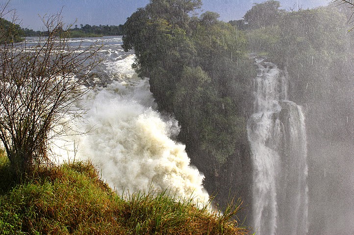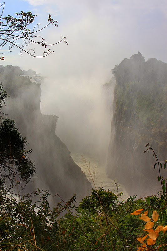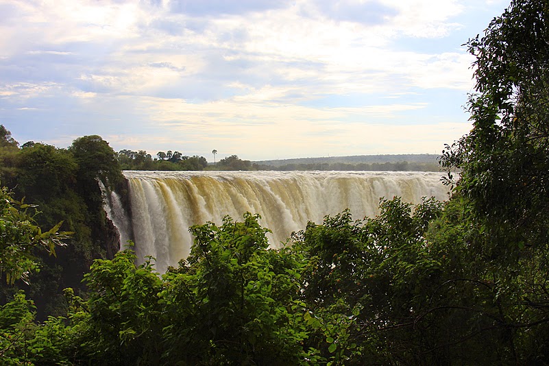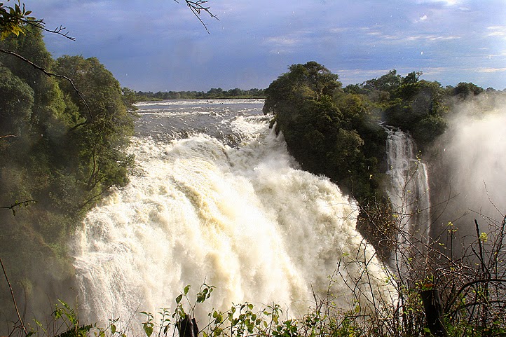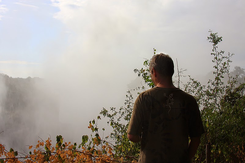 Wir lassen uns also von unseren Freunden absetzen, löhnen, durchschreiten das Gate und nähern uns dann Schritt für Schritt dem donnernden Tosen des Wasserfalls, das von Anfang an dumpf vibrierend in unseren Ohren dröhnt. Noch aber ist nichts von der Gischt zu spüren, im Gegenteil. Trockene Blätter bedecken die gepflasterten Wege, es ist heiss, die Bäume und Sträucher präsentieren sich in verhaltenem Grün und die bronzene Statue David Livingstones glänzt nur an den Stellen, die von tätschelnden Besucherhänden glattpoliert wurden. Dann aber greift der Sprühnebel nach uns, zuerst noch zaghaft, wenig später jedoch mit der Macht einer voll aufgedrehten Riesendusche. Bereits am ersten Aussichtspunkt auf den Devil’s Cataract – wir werden dort nur leicht befeuchtet – können wir schon deutlich ahnen, was in der Folge auf uns zu kommt! Wasser, Wasser, und nochmal Wasser! Besser, wir genießen jetzt den Blick auf diesen kleinen Teil der Fälle gebührlich, bevor uns die Dusche komplett verschluckt…