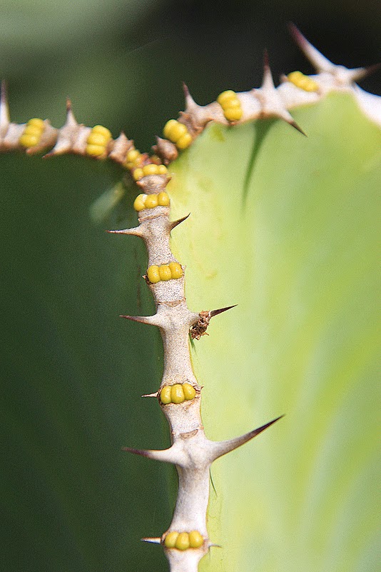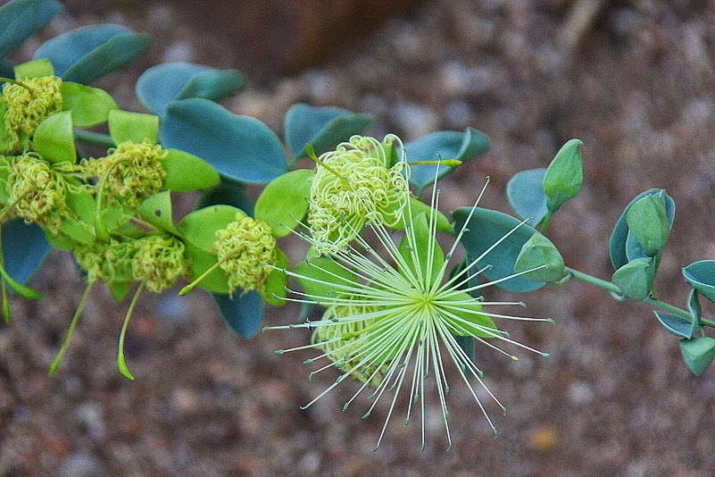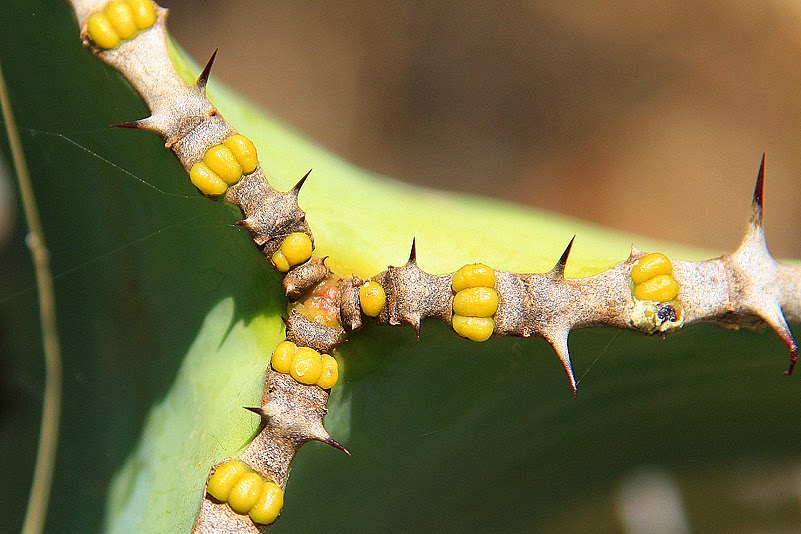 Bei vielen bin ich zuordnungstechnisch nicht wirklich sicher, bemerke aber mit gewissem Stolz, dass sich mein Wissen so erweitert hat, dass ich nicht mehr völlig im Dunklen tappe: das ist ein Kaperngewächs, das ein Vertreter der Amaranthaceae, und so weiter. Was man mit einer gewissen Zielstrebigkeit alles erreichen kann! Ja, Eigenlob stinkt, ich weiß… Trotzdem erinnere ich mich staunend an unsere 2011er-Tour, wo wir im Naukluft unterwegs waren und Heinz mir einen Vortrag über den Unterschied der Zugehörigkeit zweier stangerlförmiger, milchender Pflanzen hielt, die für mich mehr oder weniger botanische Zwillinge waren. …„Sarcostemma gehört zu den Asclepiadaceae, den Schwalbenwurzgewächsen. Das war mal eine eigenständige Pflanzenfamilie, heutzutage aber wird sie als Unterfamilie namens Asclepiadoidae innerhalb der Apocynaceae, also der Hundsgiftgewächse, behandelt. Somit ist Sarcostemma nicht nur mit den Aasblumen verwandt, sondern auch mit Adenium und Pachypodium und sogar mit Oleander und Immergrün. Die Familie der Euphorbiaceae hingegen, also die der Wolfsmilchgewächse, teilt sich in die Gattungen Monadenium, Synadenium, Pedilanthus, Jatropha und Euphorbia. Bekannte Vertreter der Gattung Euphorbia…“, dozierte Heinz auf den Tag genau vor zwei Jahren. Damals ein richtiggehendes Rätsel für mich, heute jedoch habe ich diese spezielle Thematik weitestgehend abgehakt – und nicht nur die! Ein schönes Gefühl: das Wissen, das Erkennen, die Sicherheit innerhalb eines bestimmten Sachgebietes nimmt schrittweise und spürbar zu. Trotzdem aber bleibt vieles offen und rätselhaft, und genau diese Tatsache erhält meine Neugier und Spannung.